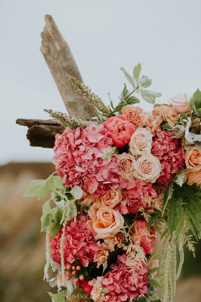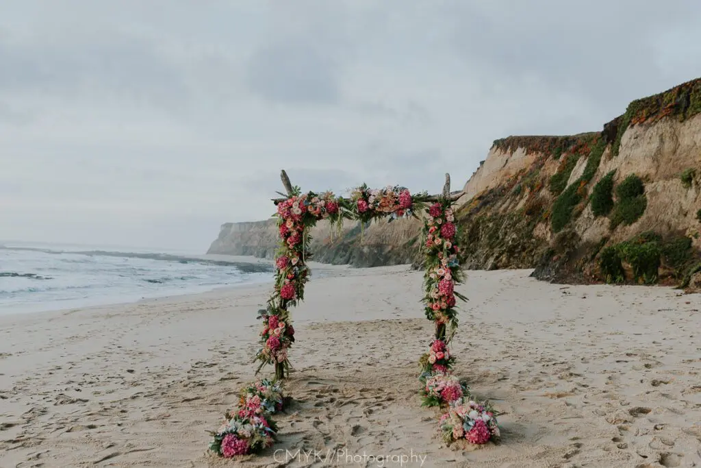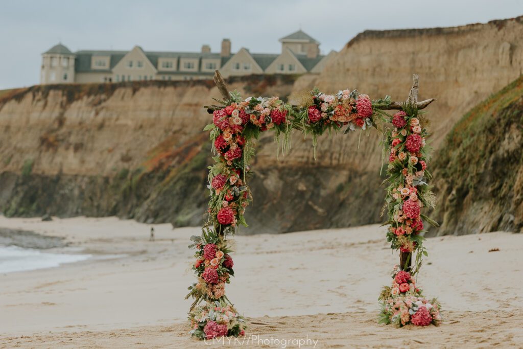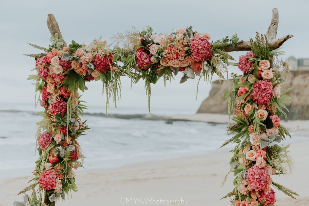 This wedding proposal in Half Moon Bay that we did last year was over-the-top stunning, so we just had to share! Our florist created a beautiful floral arch on the beach, with pink and coral flowers galore! The ocean and the cliffs surrounded the arch, creating the perfect atmosphere for a romantic beach marriage proposal!