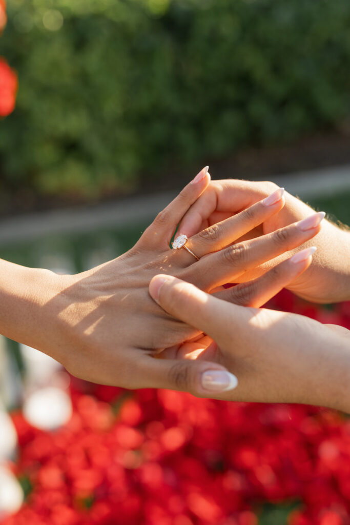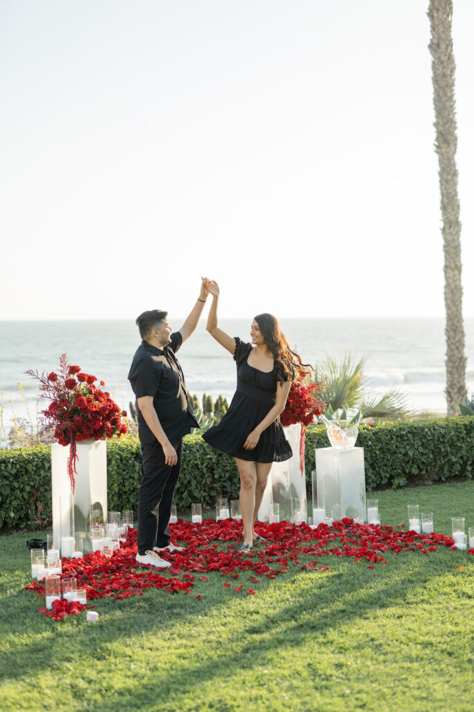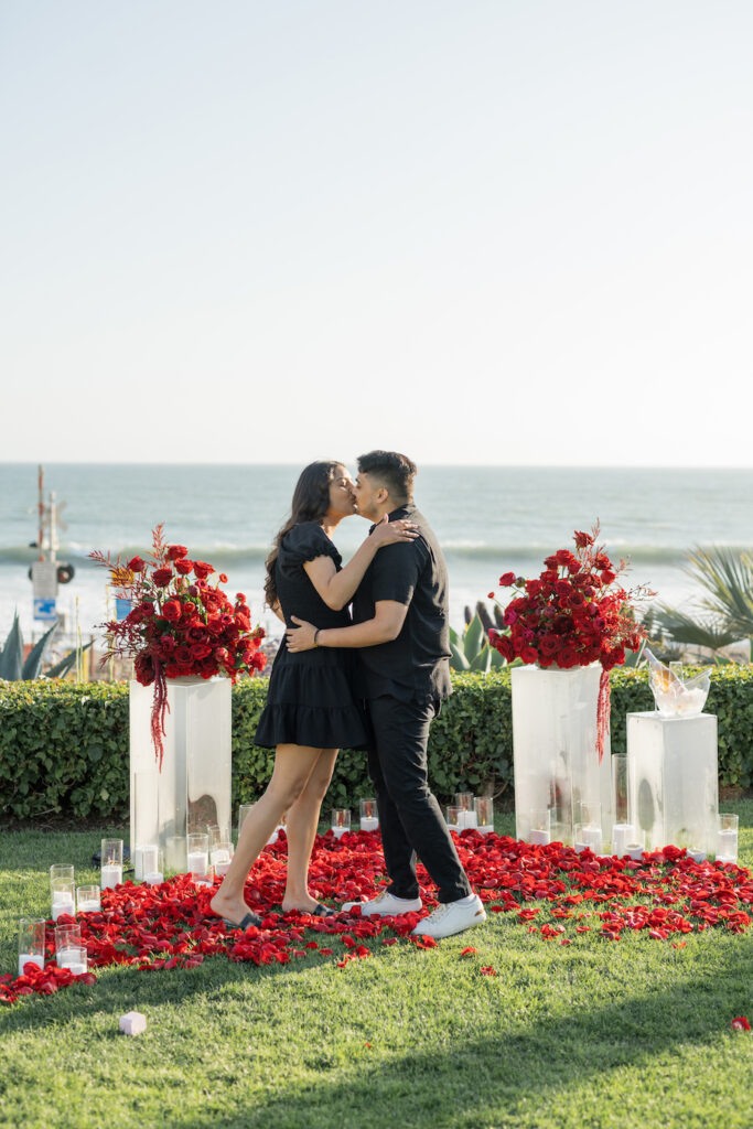 Some moments feel like they’re straight from a movie—and this dreamy beachfront proposal in Orange County, California, was exactly that. With ocean waves gently crashing in the background, moody red florals lining the grass, and sunshine pouring over the scene, it was the perfect setting for a truly unforgettable “yes.”