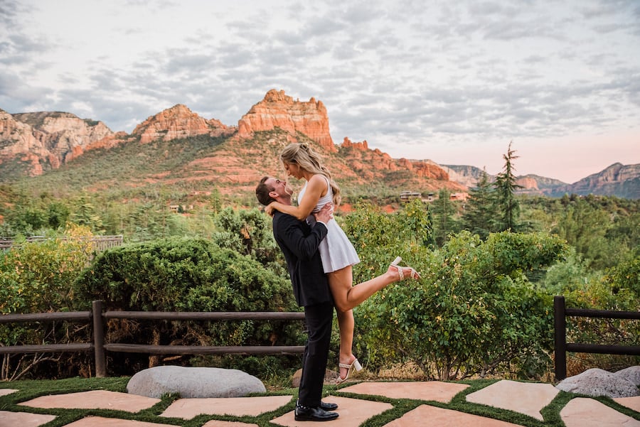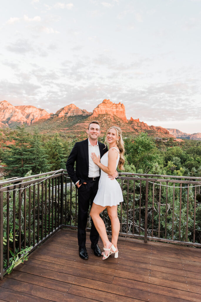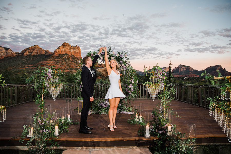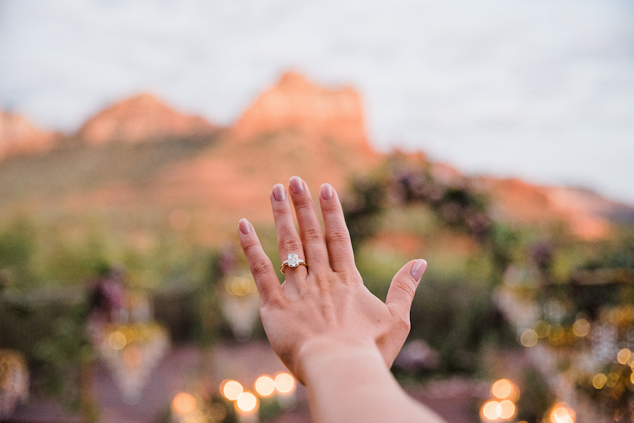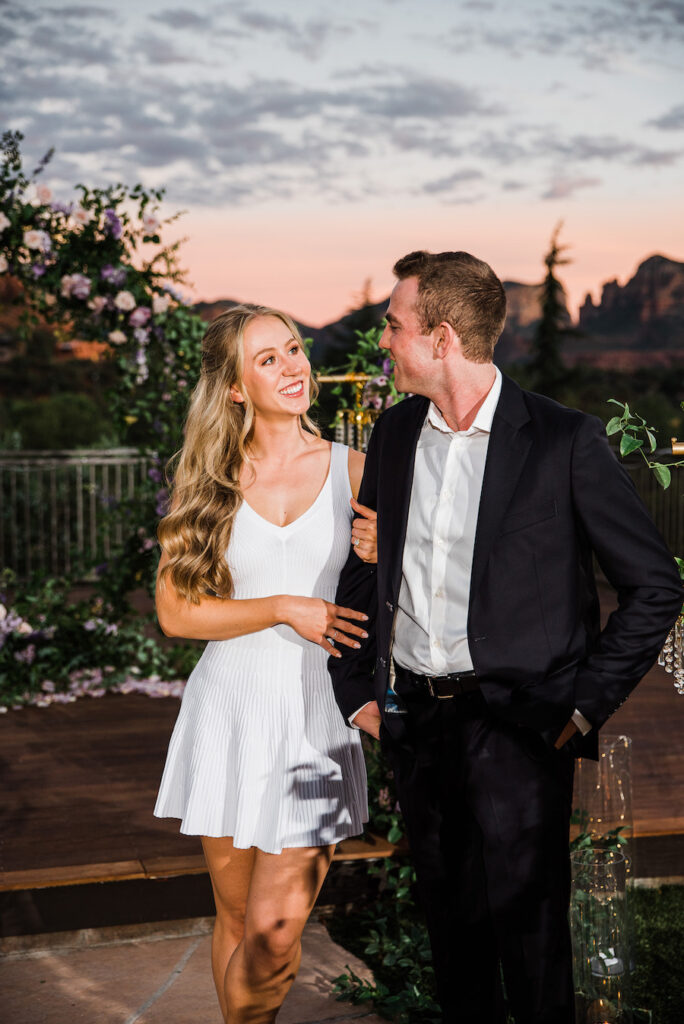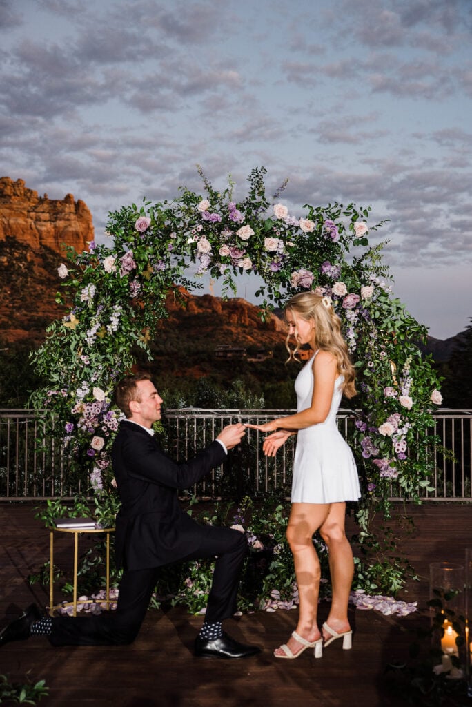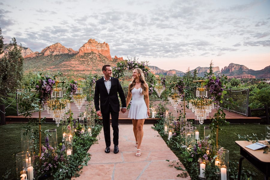 Set against the iconic red rock views of Sedona, this unforgettable Arizona chandelier proposal feels straight out of a fairytale. A romantic aisleway lined with glowing chandeliers and lush purple florals leads the way, creating a dramatic and elegant moment beneath the desert sky. Inspired by a Taylor Swift lyric — “This night is sparkling, don’t you let it go” — the design captures a sense of magic, emotion, and timeless romance. Candlelight flickers as the couple steps into the moment, surrounded by breathtaking scenery and thoughtful details that make this proposal truly sparkle.