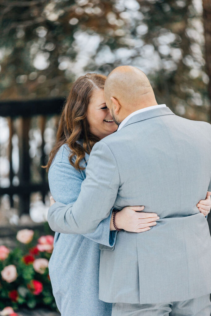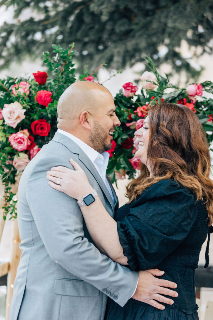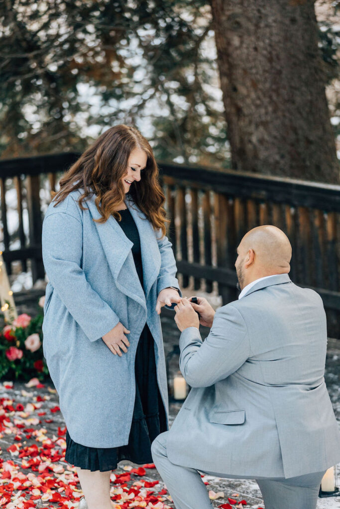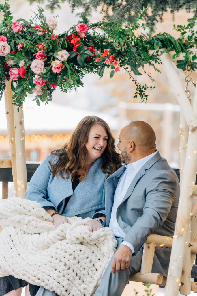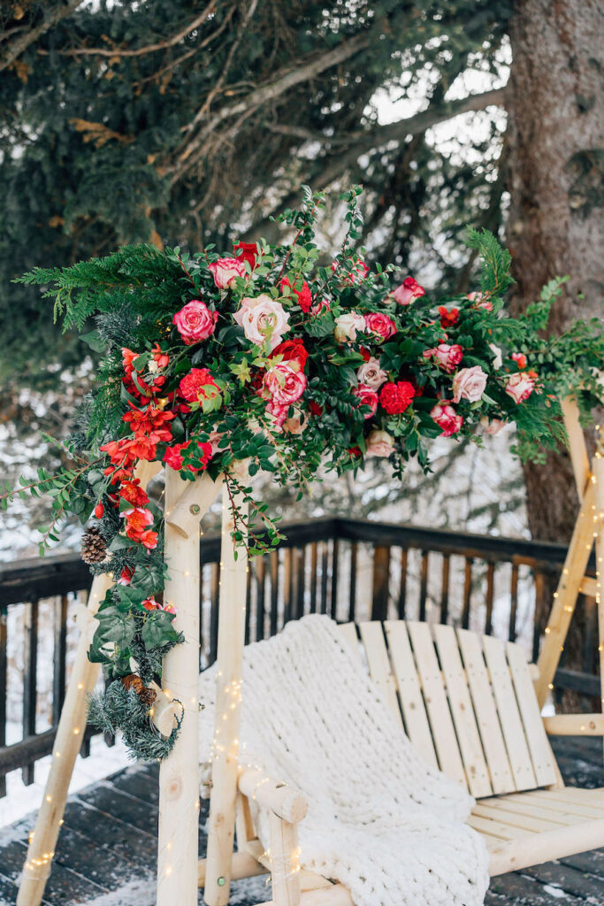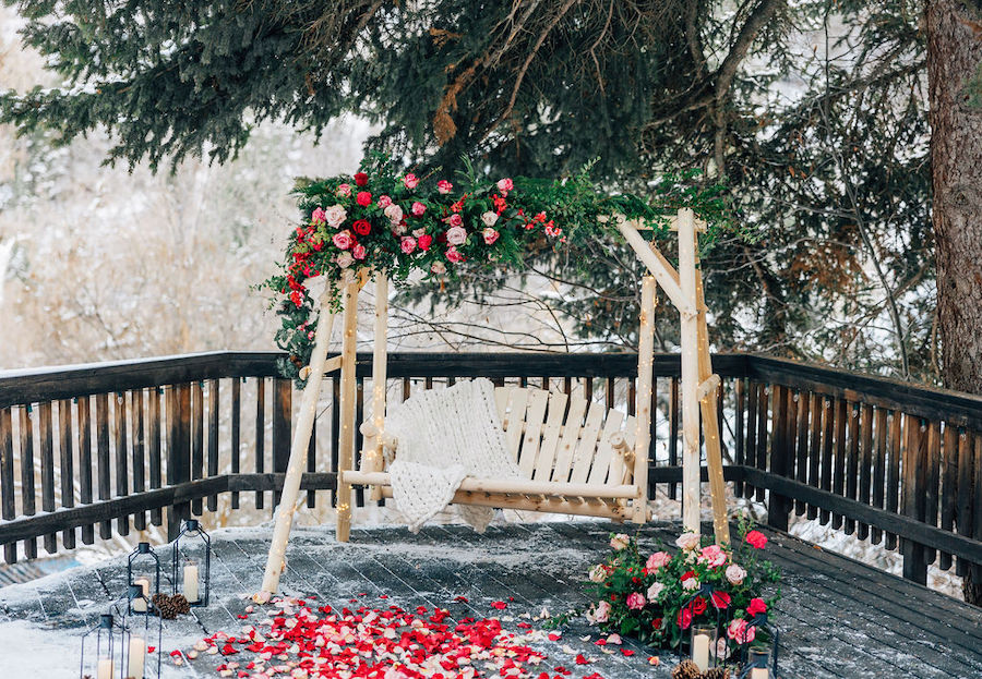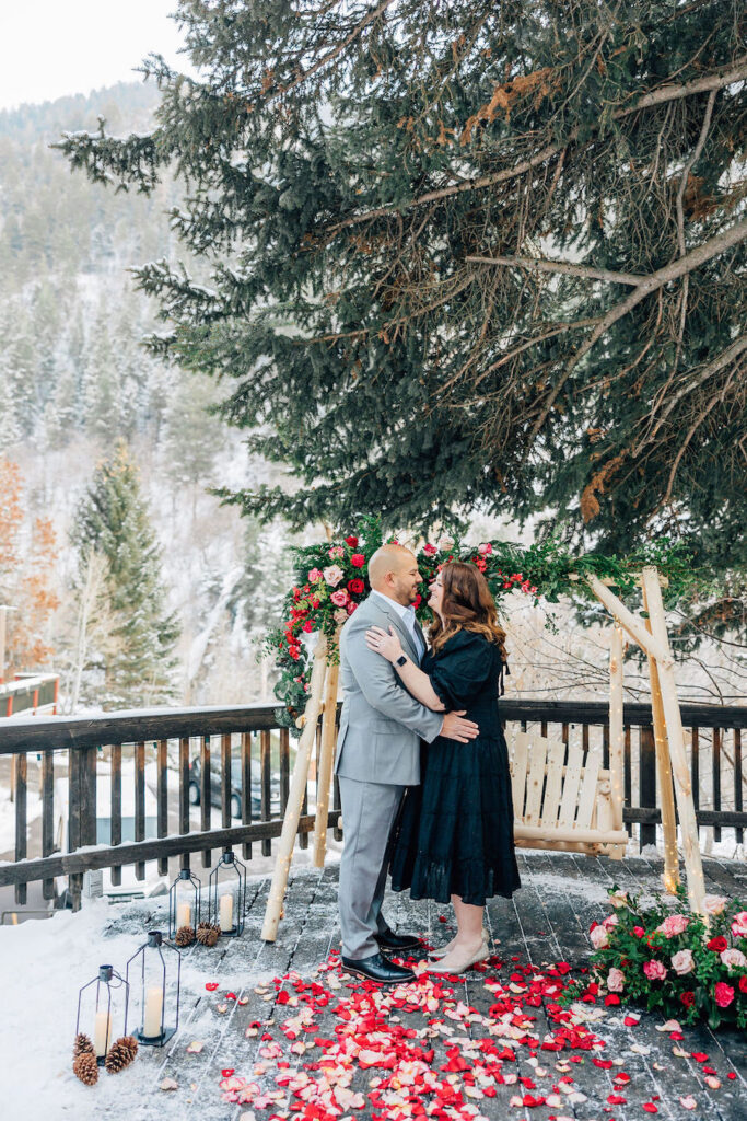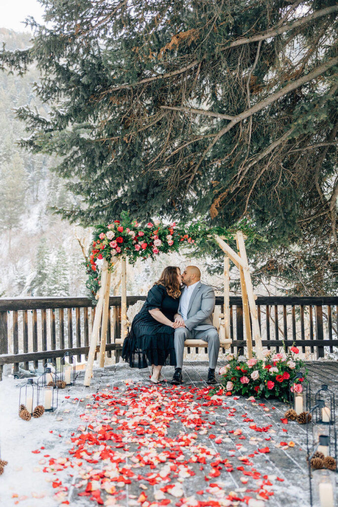 This Utah proposal felt like a cozy winter dream, set beneath towering evergreens with soft snow underfoot and a warm, intimate setup. A beautifully styled wooden swing adorned with lush red and blush florals, twinkling lights, and evergreen accents created the perfect focal point, while candlelight and scattered rose petals added to the romance. Wrapped in a blanket and surrounded by nature, the moment felt both magical and deeply personal — a heartfelt proposal in a serene mountain setting.