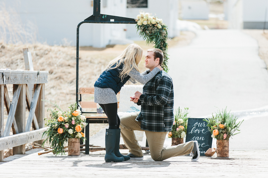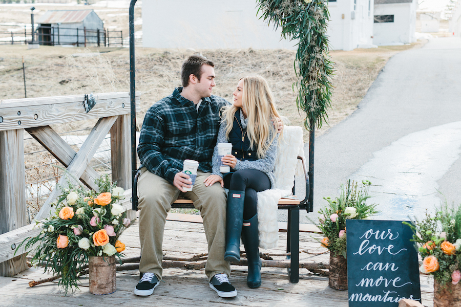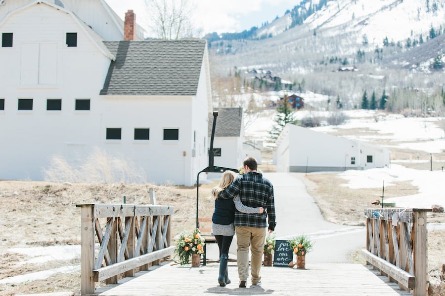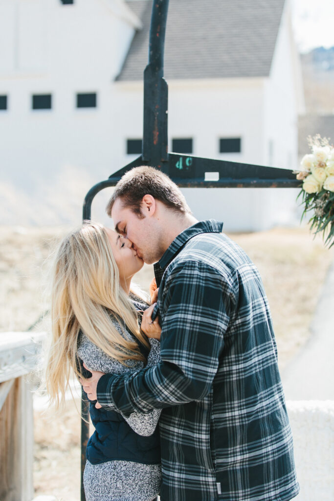 Set in the snow-dusted mountains of Utah, this chairlift proposal blends rustic charm with heartfelt mountain romance. The couple strolled across a quiet wooden bridge toward a thoughtfully styled chairlift bench adorned with seasonal florals and a meaningful sign reading our love can move mountains, perfectly framing the moment. As the alpine scenery stretched behind them and winter air filled the space with calm, he dropped to one knee, creating an intimate, genuine proposal that felt effortless and deeply personal. Cozy layers, warm coffee, and the serene mountain setting made this Utah chairlift proposal a timeless celebration of love surrounded by nature’s beauty.