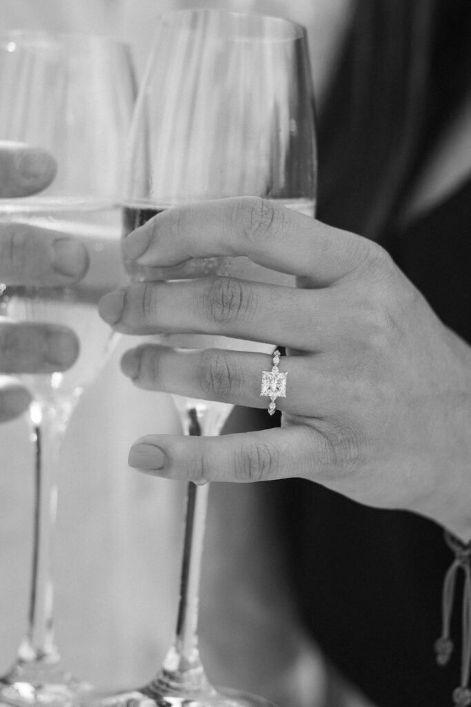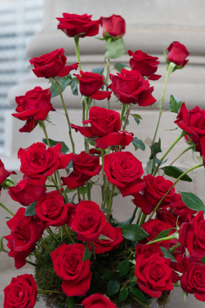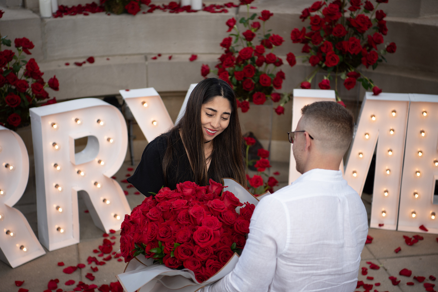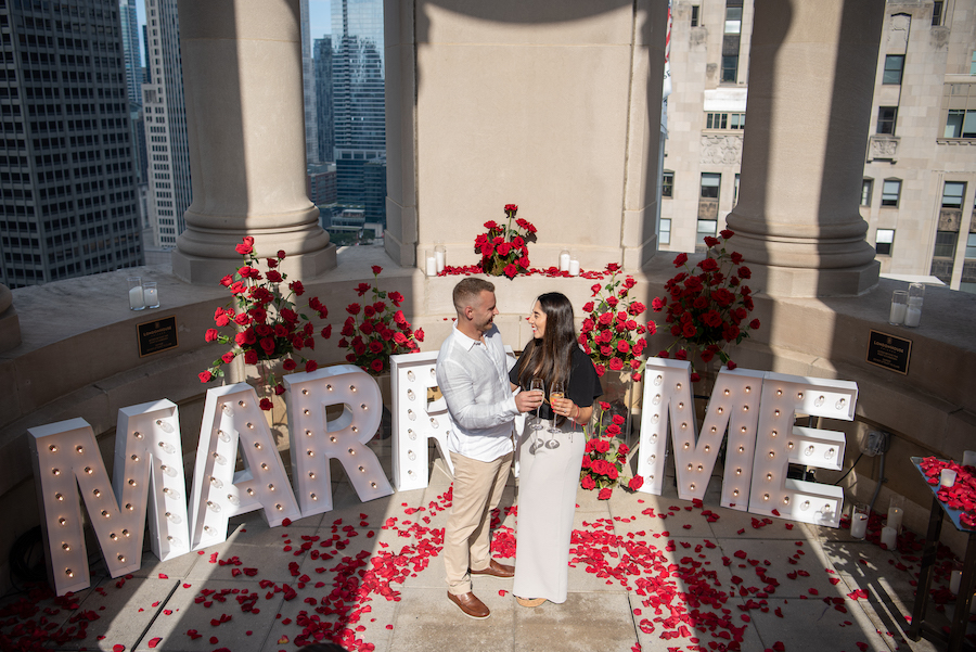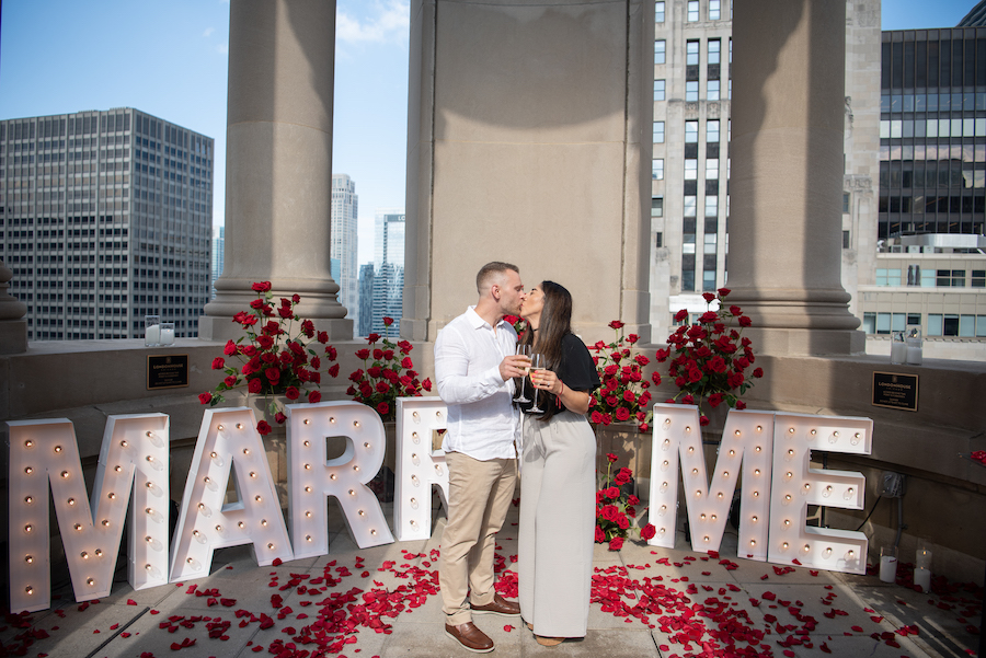 Surrounded by lush red roses, glowing “MARRY ME” marquee letters, and cascading petals, the moment felt cinematic yet deeply intimate. With champagne in hand and the skyline as their witness, this Chicago proposal was the perfect blend of bold romance and timeless elegance.