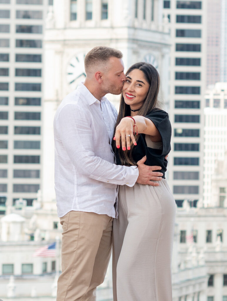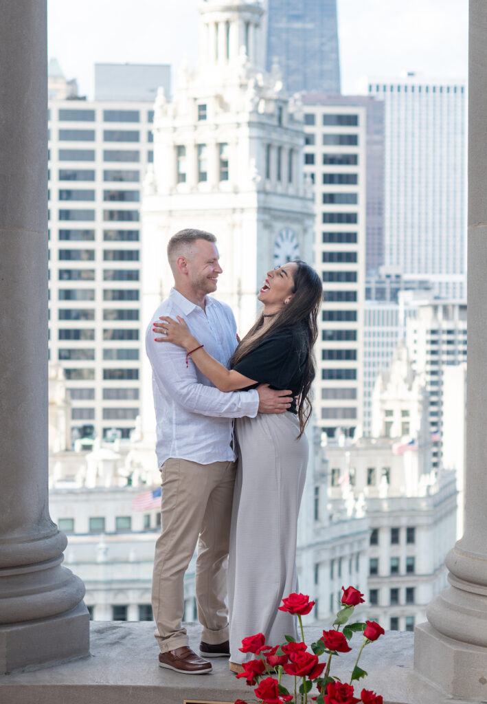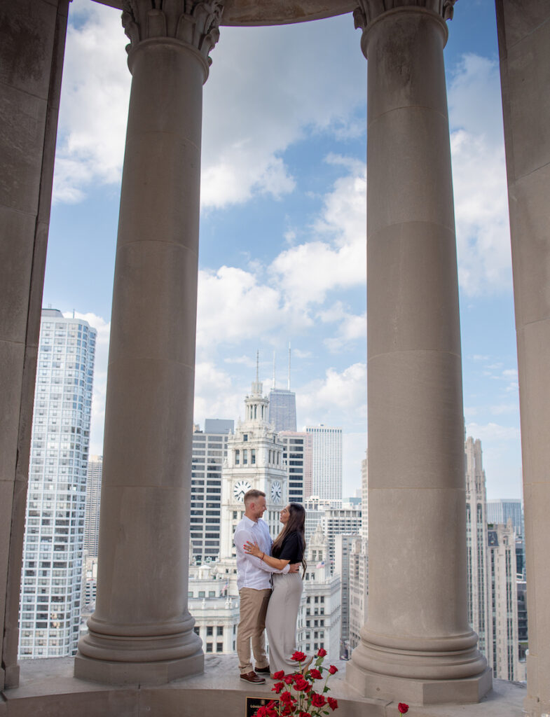 This unforgettable Chicago private turret proposal took place high above the city in a breathtaking, covered outdoor turret overlooking the iconic skyline. Framed by grand architectural columns and sweeping downtown views, this weather-friendly space offered both dramatic scenery and peace of mind — no matter the forecast.