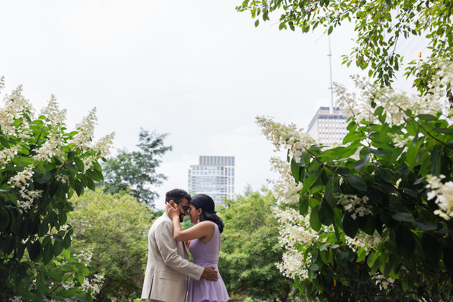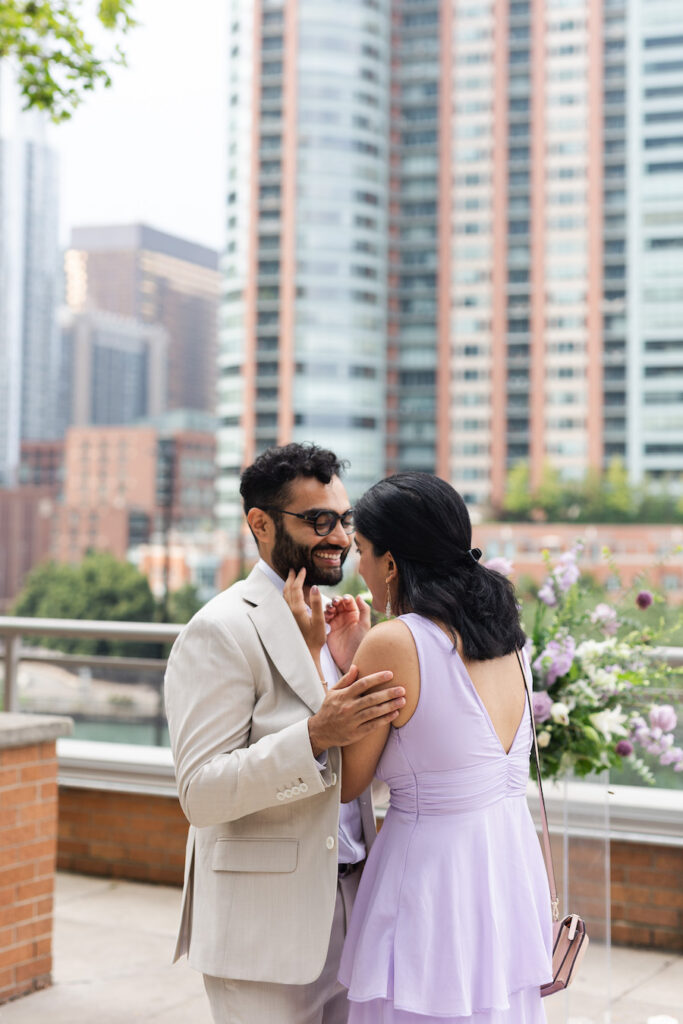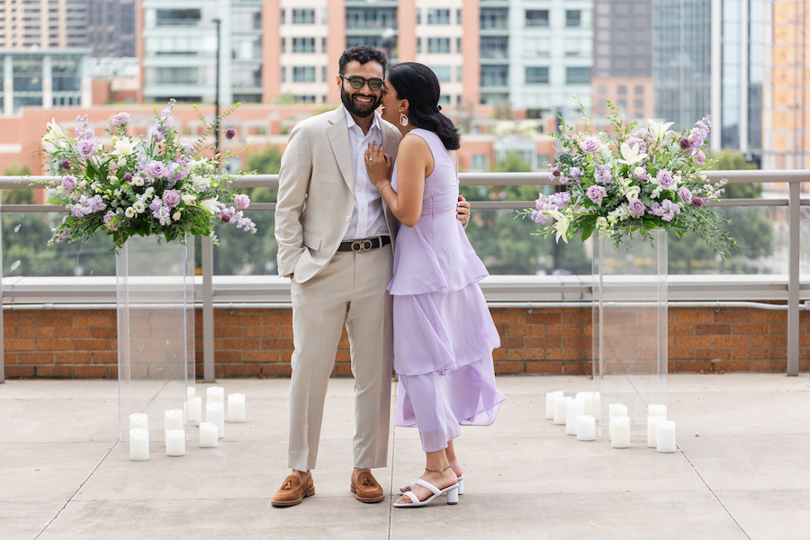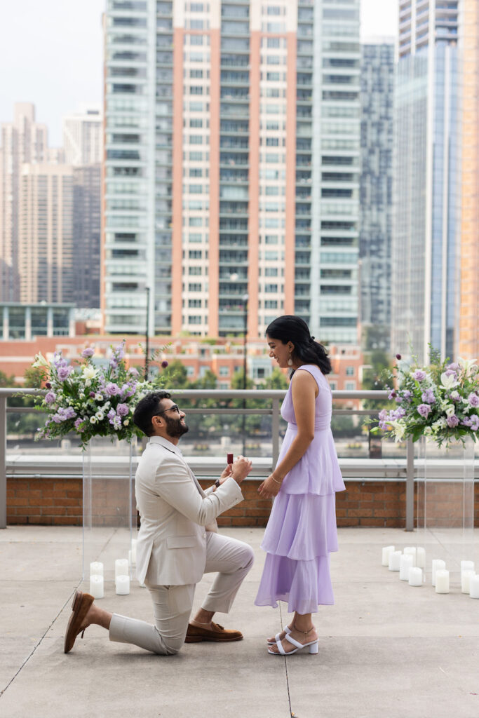 This Chicago proposal was the sweetest celebration of love, set against the city skyline with our Classic Package in full bloom. A purple and white floral design framed the moment beautifully, with soft lavender roses, creamy white blooms, and glowing candles lining the terrace for an effortlessly romantic feel. As he dropped to one knee overlooking the river, the timeless setup created the perfect backdrop for their “yes” — elegant, joyful, and undeniably Chicago.