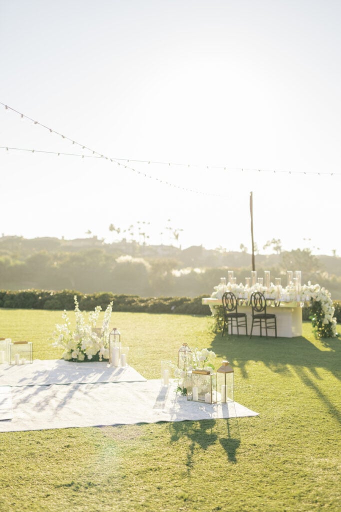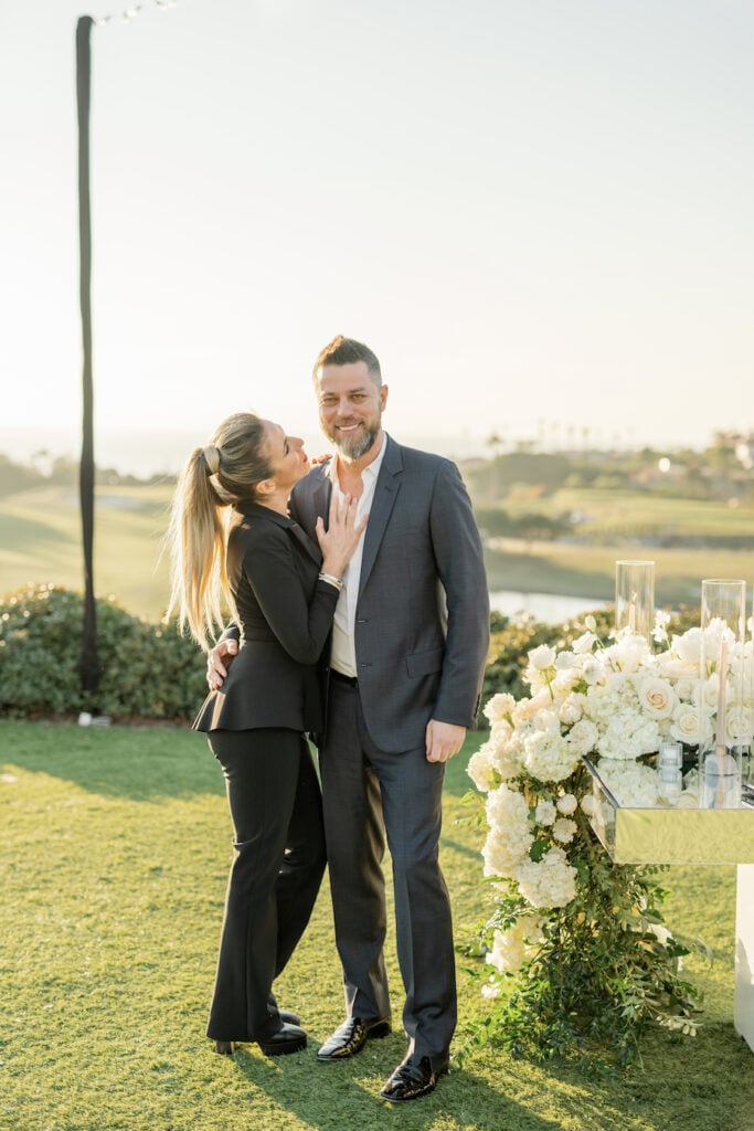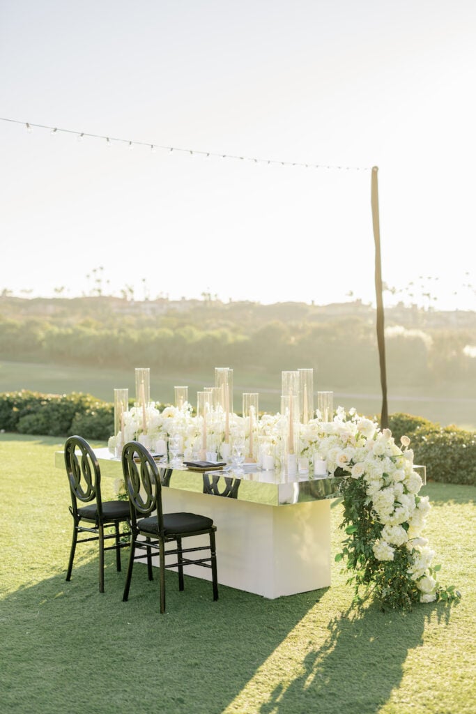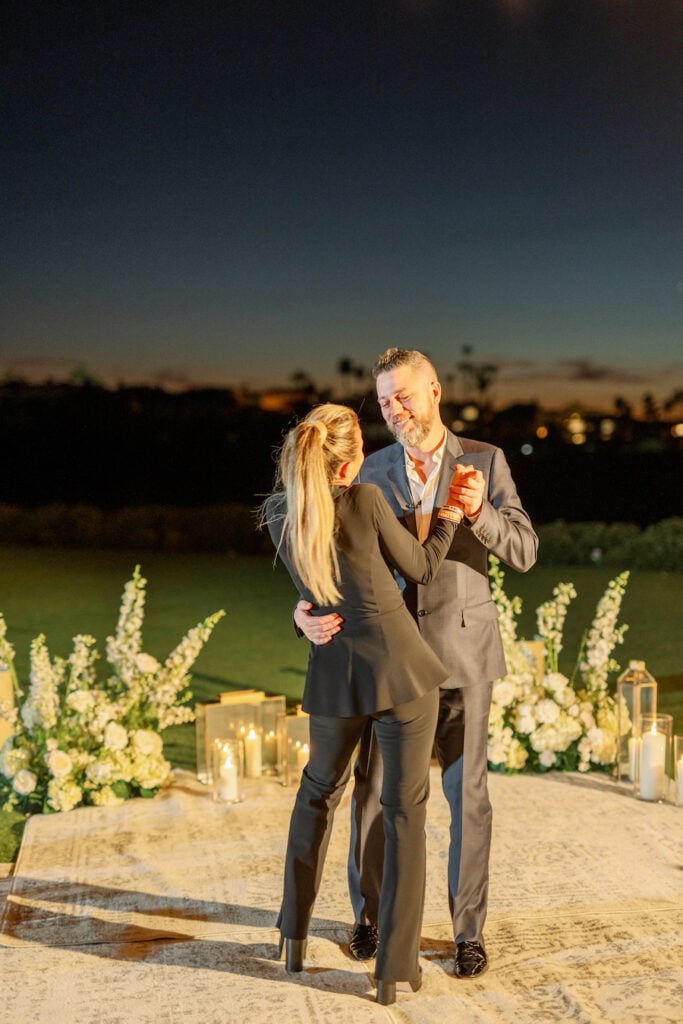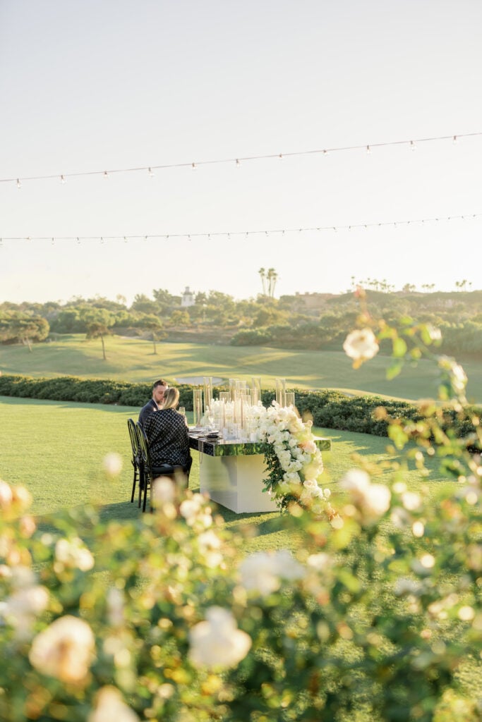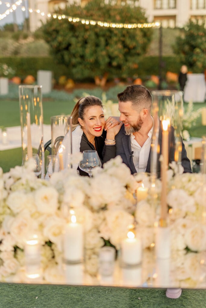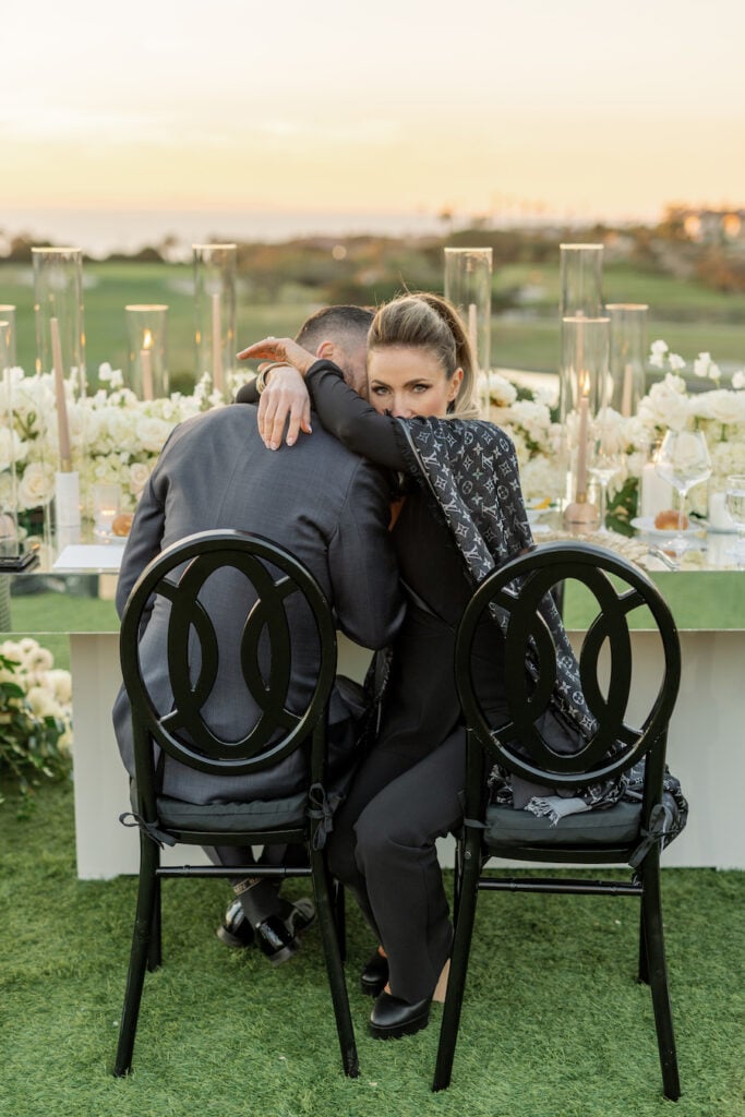 Following the museum-style experience, the couple transitioned to the oceanfront lawns at Waldorf Astoria Monarch Beach for an intimate private dining celebration overlooking the Pacific. A fully custom menu highlighted all of their favorite dishes, turning dinner into another heartfelt reflection of their shared life. A live painter captured the romance of the evening as it unfolded, preserving the magic in real time.