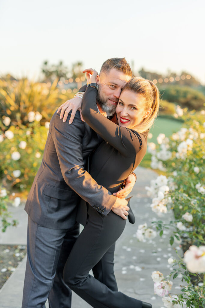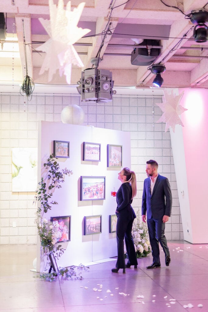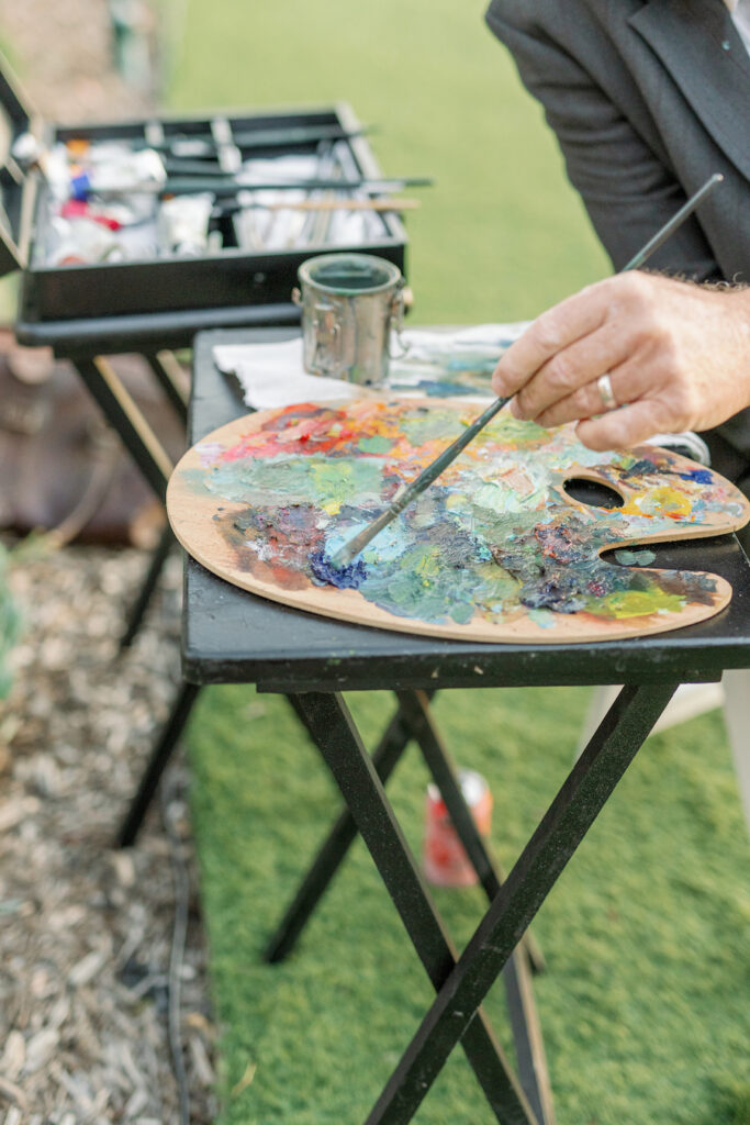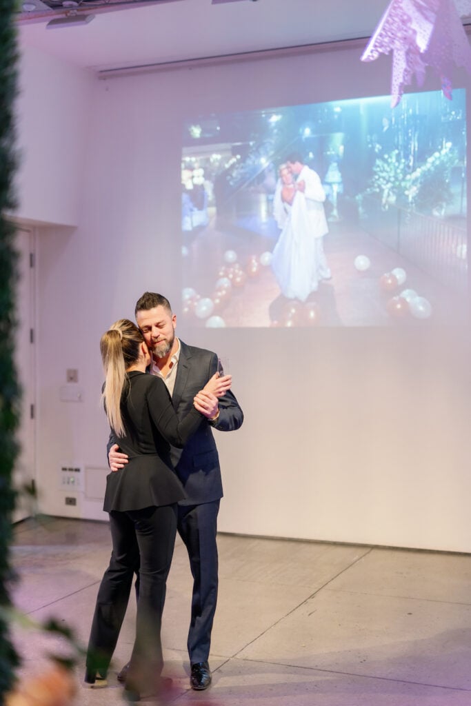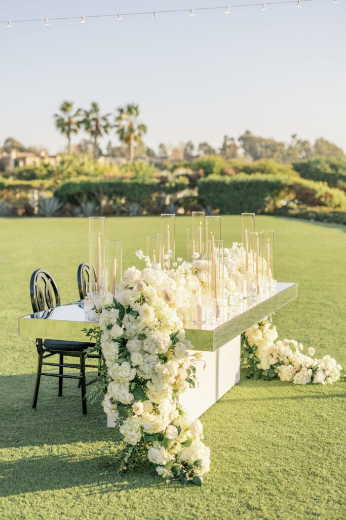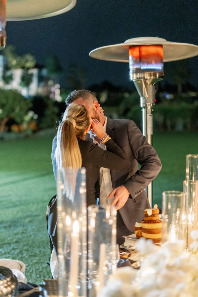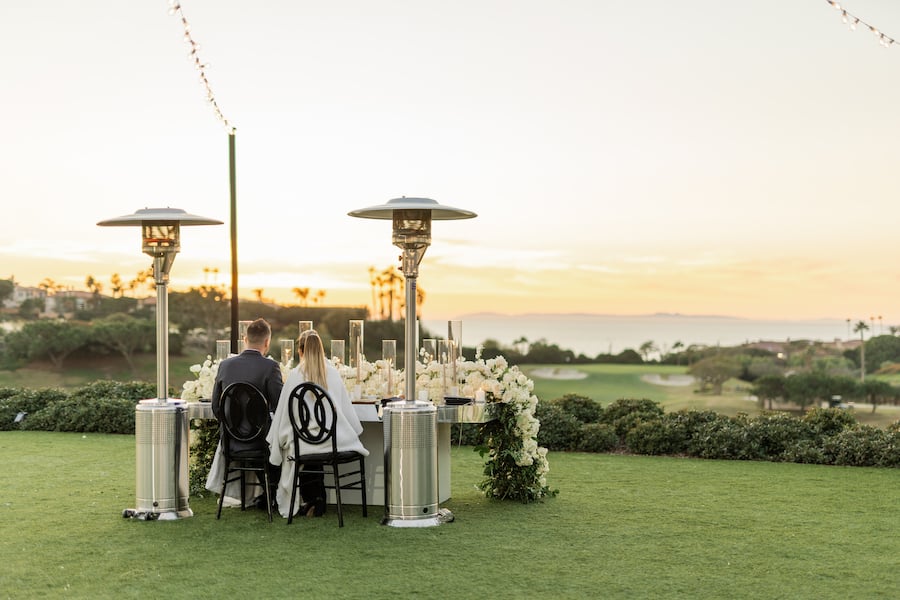 Following the museum-style experience, the couple transitioned to the oceanfront lawns at Waldorf Astoria Monarch Beach for an intimate private dining celebration overlooking the Pacific. A fully custom menu highlighted all of their favorite dishes, turning dinner into another heartfelt reflection of their shared life. A live painter captured the romance of the evening as it unfolded, preserving the magic in real time.
