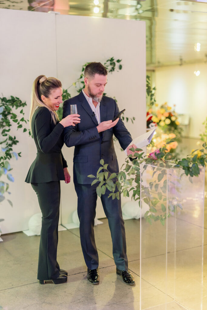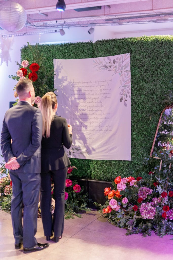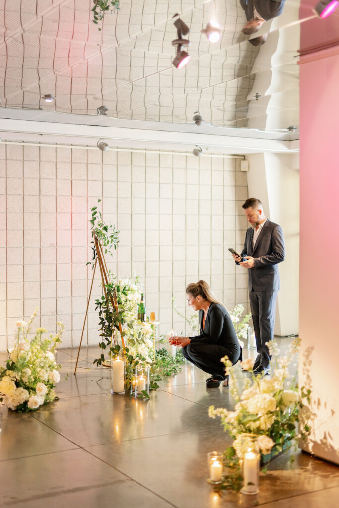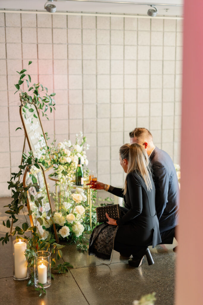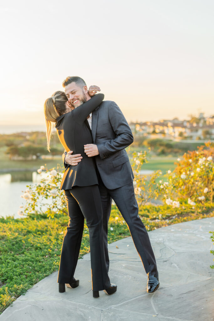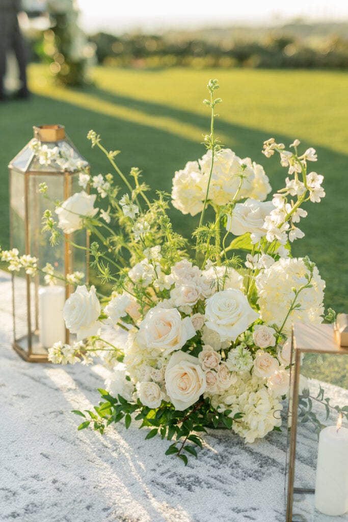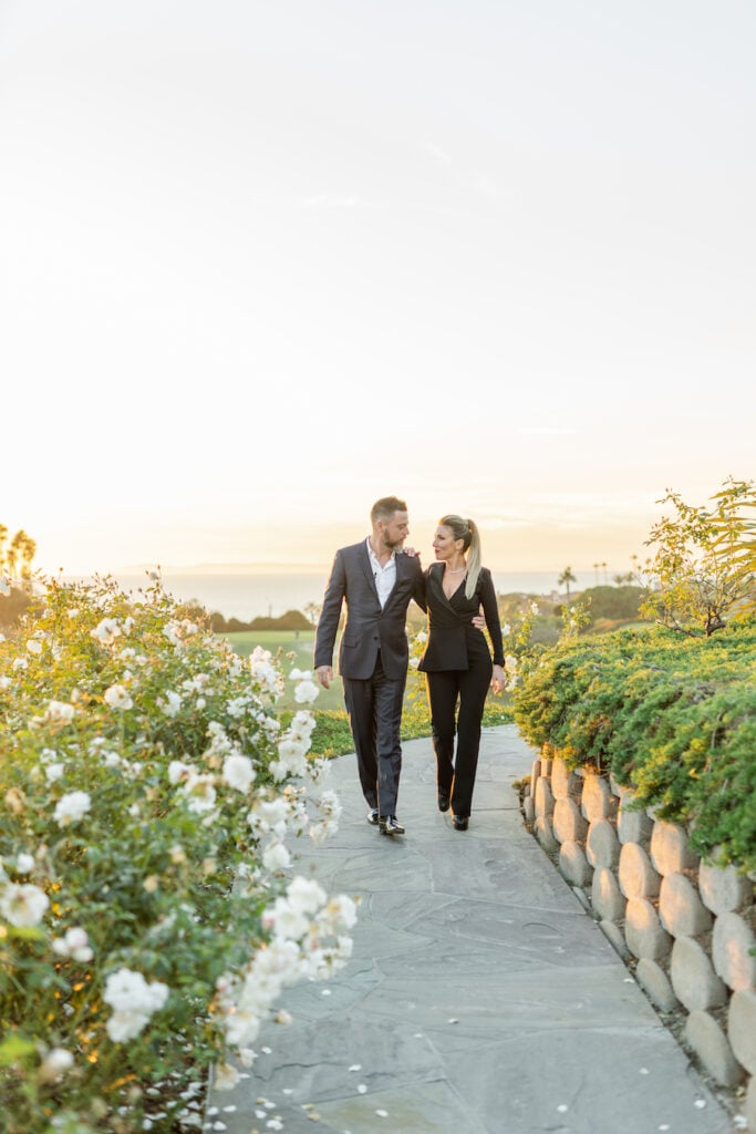 Following the museum-style experience, the couple transitioned to the oceanfront lawns at Waldorf Astoria Monarch Beach for an intimate private dining celebration overlooking the Pacific. A fully custom menu highlighted all of their favorite dishes, turning dinner into another heartfelt reflection of their shared life. A live painter captured the romance of the evening as it unfolded, preserving the magic in real time.