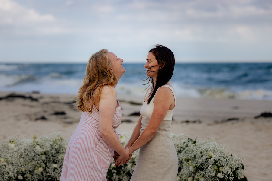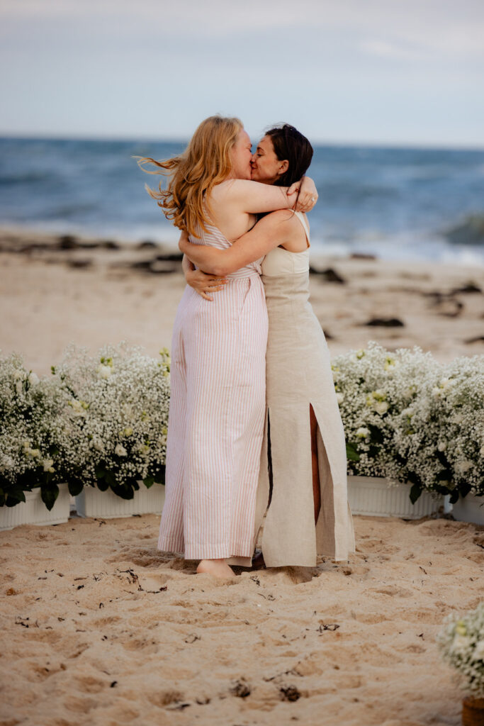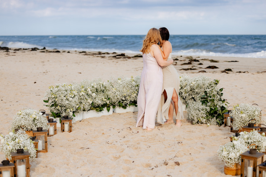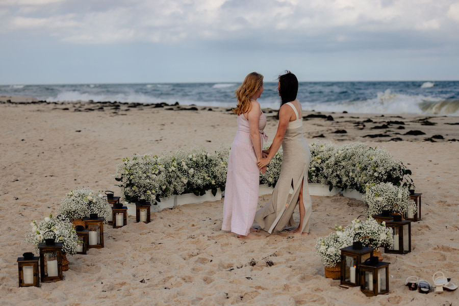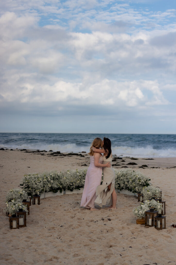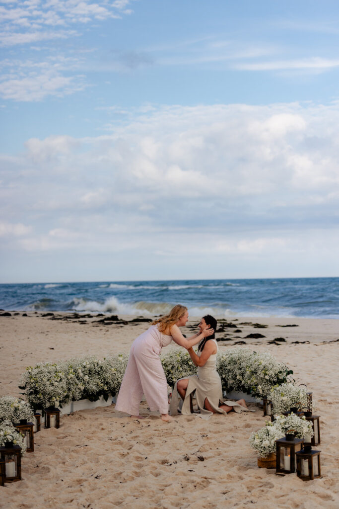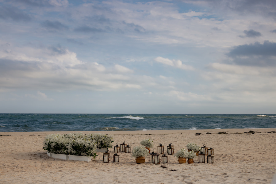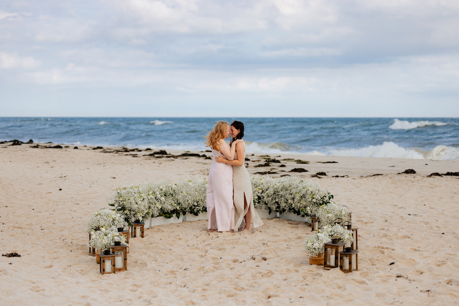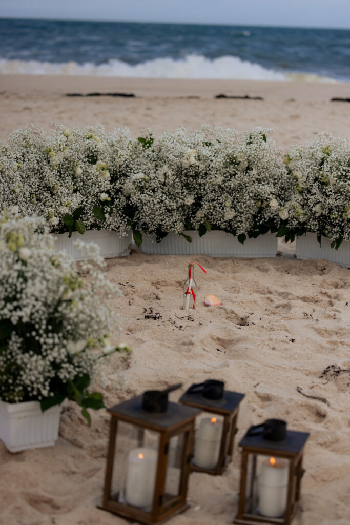 Set along the shores of the Hamptons, this romantic beach proposal unfolds on a truly perfect day by the sea. White baby’s breath florals and softly glowing lanterns are thoughtfully arranged in a boat-like shape, creating a unique proposal spot that beautifully mirrors the surrounding ocean views. The design brings a subtle nautical touch to the moment, blending coastal charm with timeless romance. With the sound of waves nearby and the sunlight dancing across the sand, the proposal feels effortless, intimate, and unforgettable — a picture-perfect celebration of love by the water.