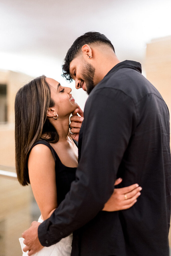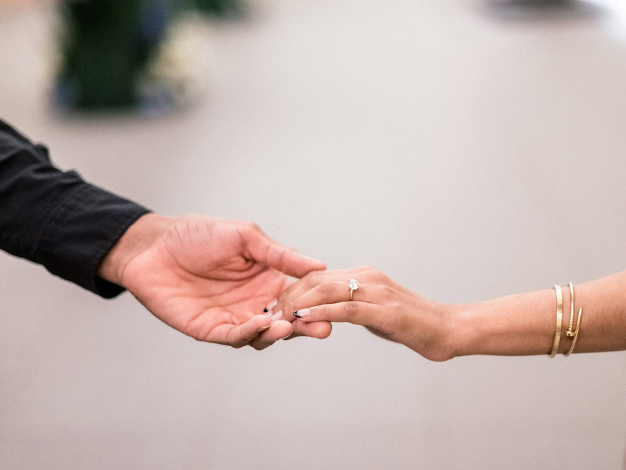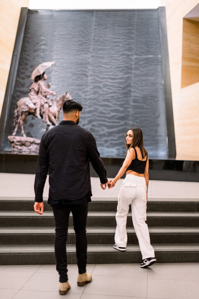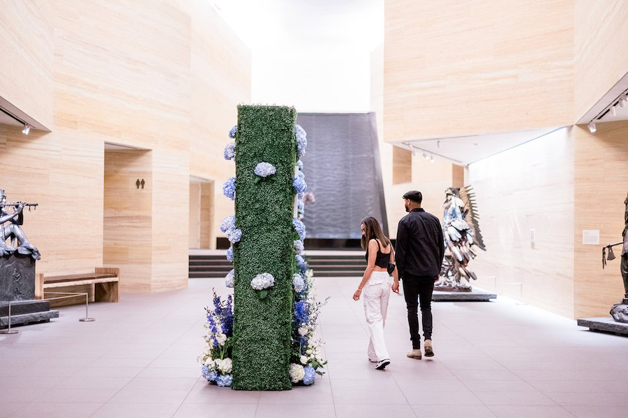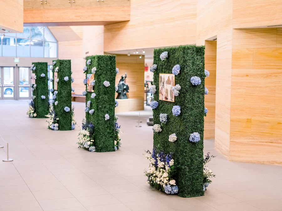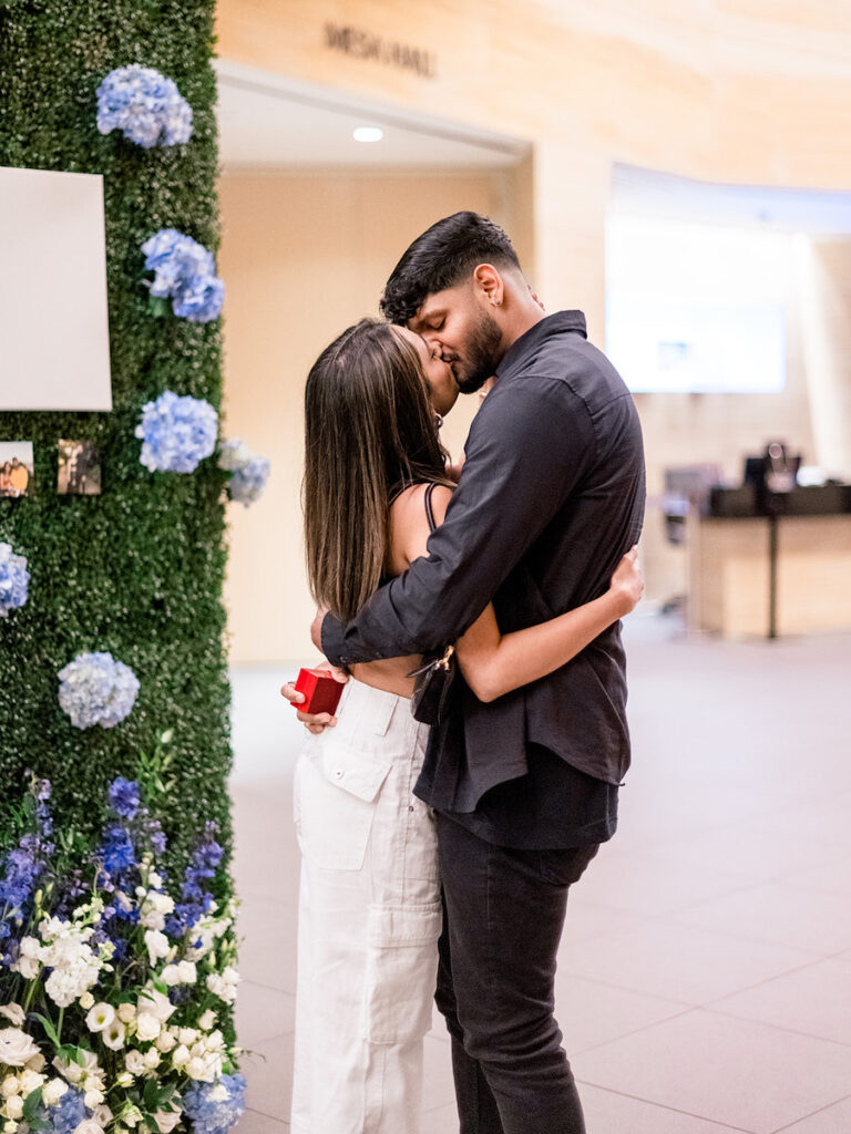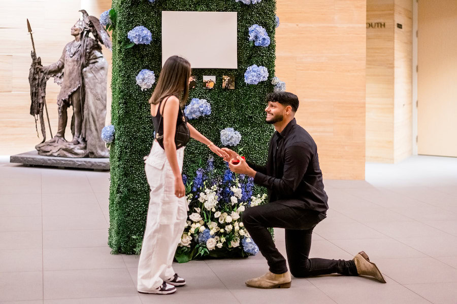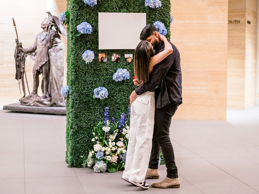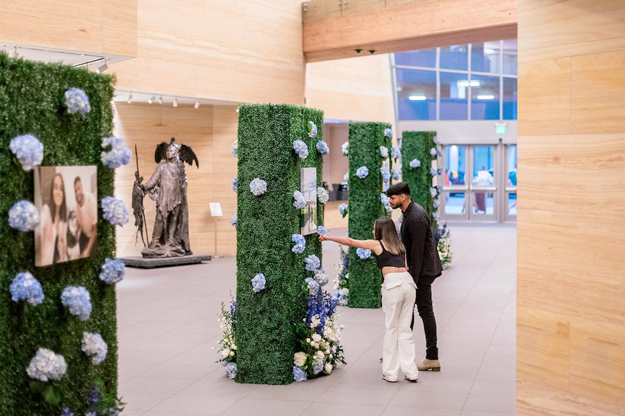 This Tampa proposal transforms a modern space into an intimate art gallery dedicated to their love story. Each wall features photos capturing their favorite memories — from travels to everyday moments — creating a walk-through journey of their relationship. Elegant blue and white florals accent lush greenery, adding warmth and romance to the sleek setting. As they arrive, she realizes every image tells their story, leading to the most meaningful piece of all — the moment he asks her to marry him.