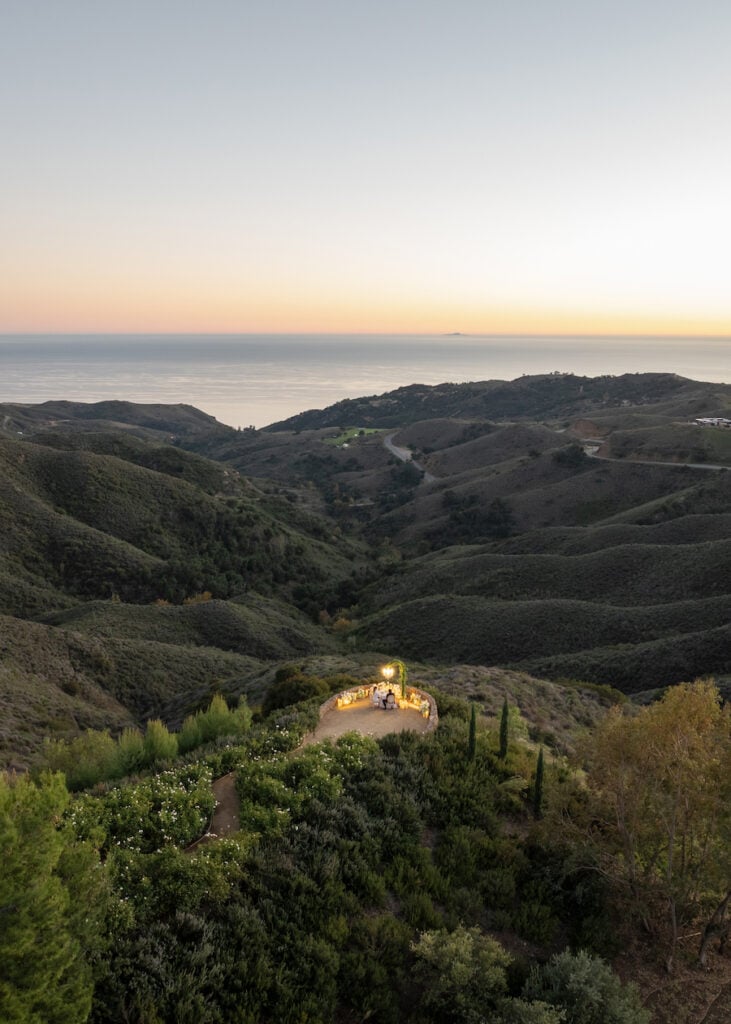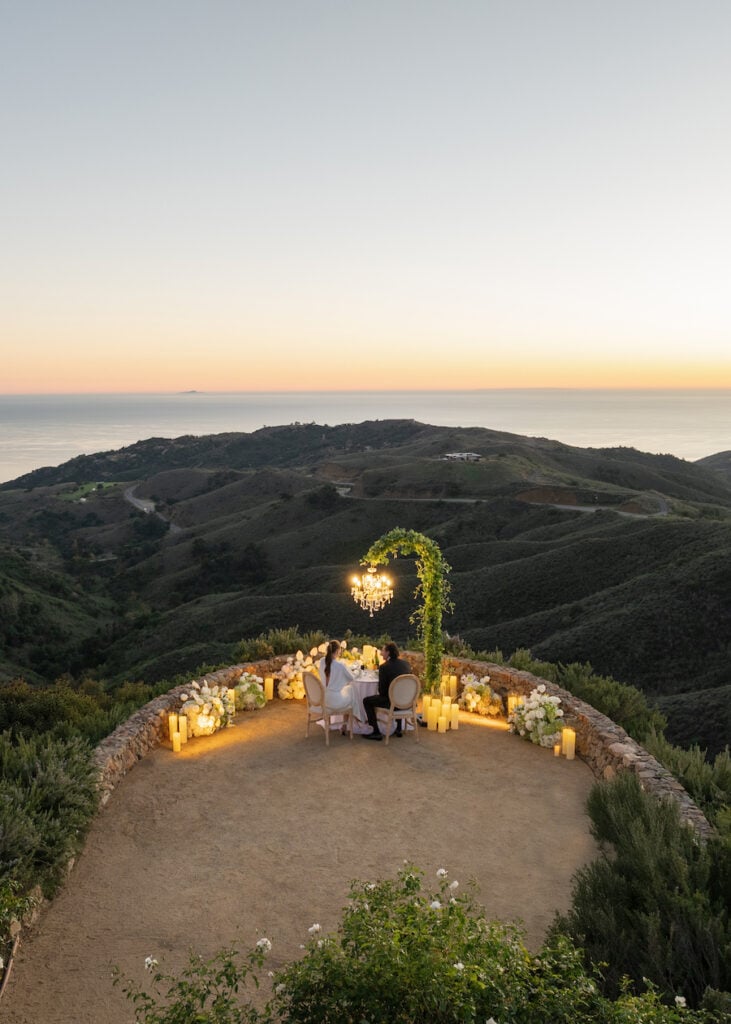 This custom Malibu proposal captures effortless luxury against the glow of a golden California sunset. Set along the coast, the design features lush white florals throughout, creating a soft and romantic atmosphere that feels both elevated and intimate. A freestanding rose-lined aisleway leads the way, surrounded by candlelight and sculptural floral moments that frame the scene beautifully. At the center, a Pinterest-worthy table for two awaits — styled for a private dinner celebration overlooking the ocean. As the sun dips below the horizon, he gets down on one knee, creating a breathtaking moment filled with emotion, surprise, and timeless romance. This Malibu proposal is the perfect blend of modern elegance and heartfelt intention, set against one of the most iconic backdrops in California.