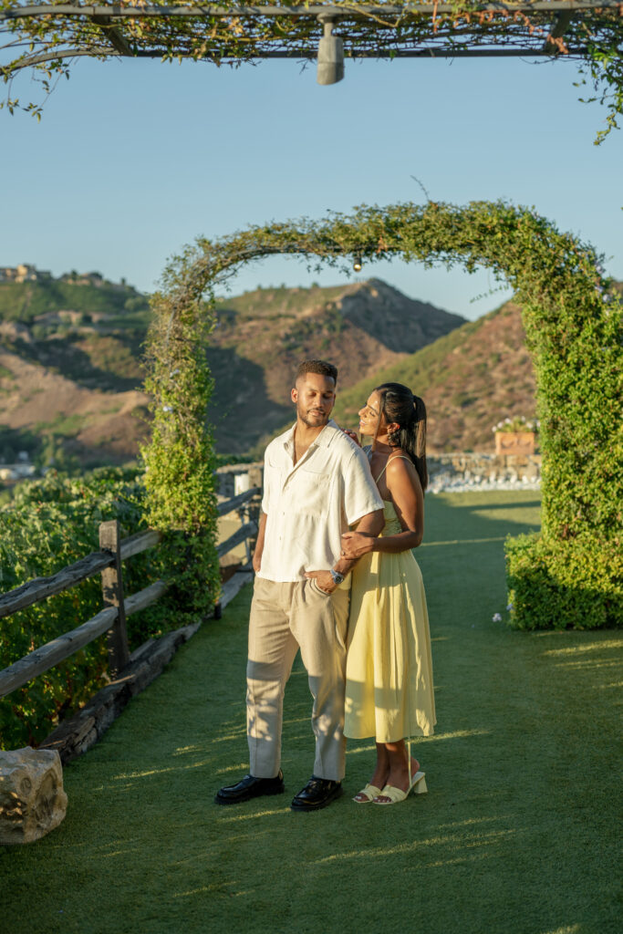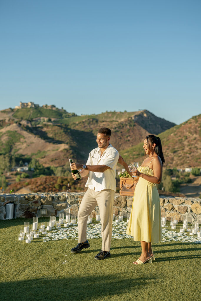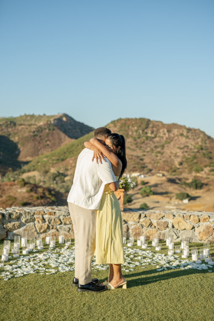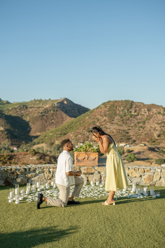 This Malibu proposal captured the beauty of golden hour with sweeping canyon views and a soft, romantic setup of white rose petals and candlelight. Set against the natural landscape, the design felt effortless and elevated, allowing the moment itself to take center stage. As the sun dipped behind the hills, the proposal unfolded in a warm, intimate glow — a timeless Malibu setting for a truly unforgettable “yes.”