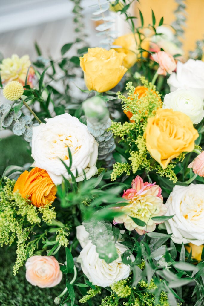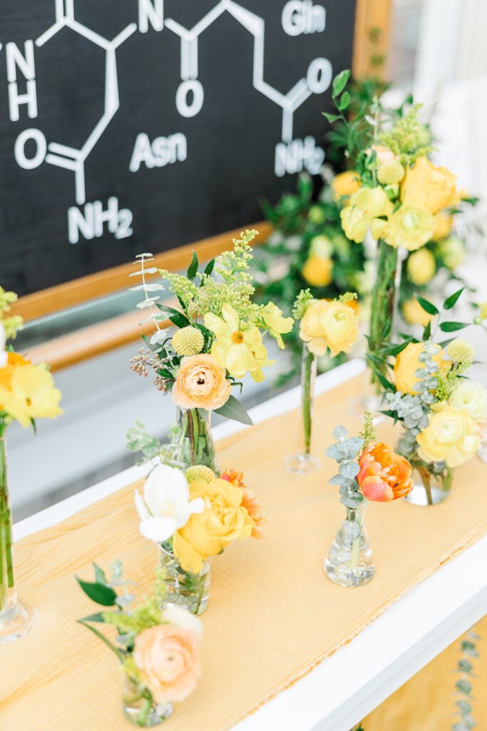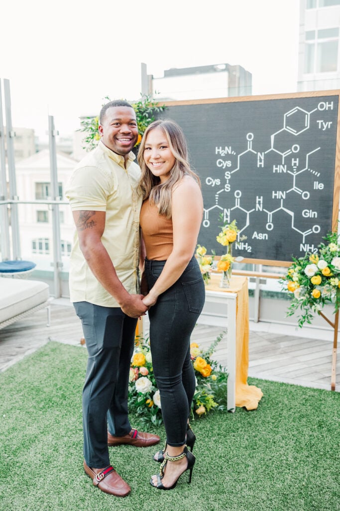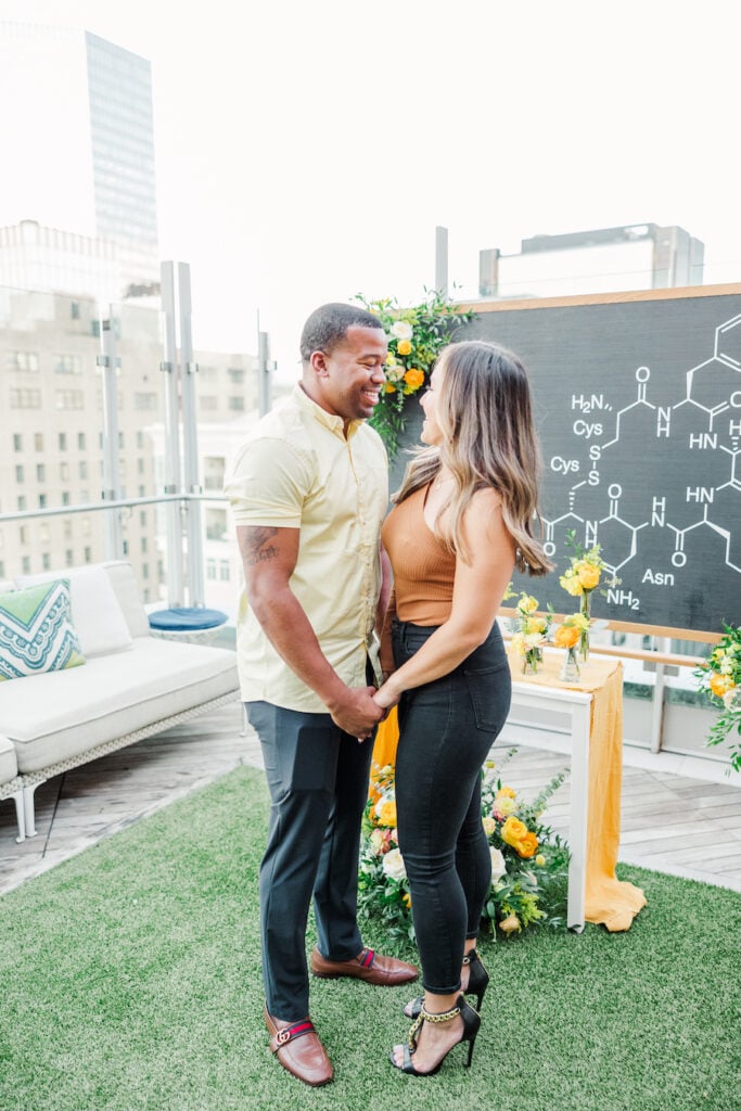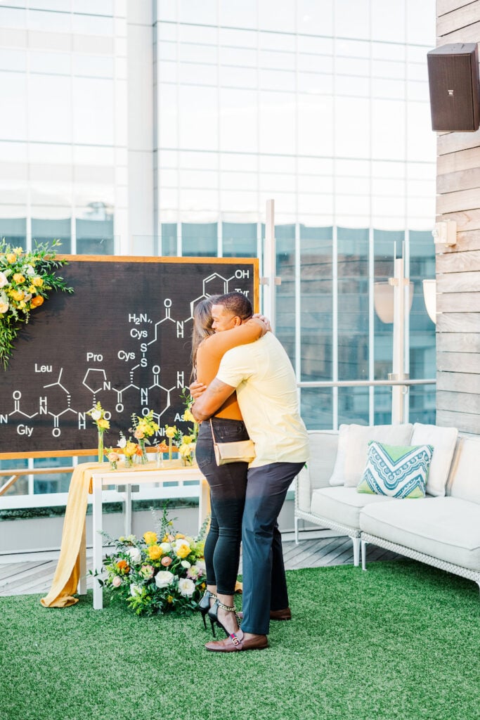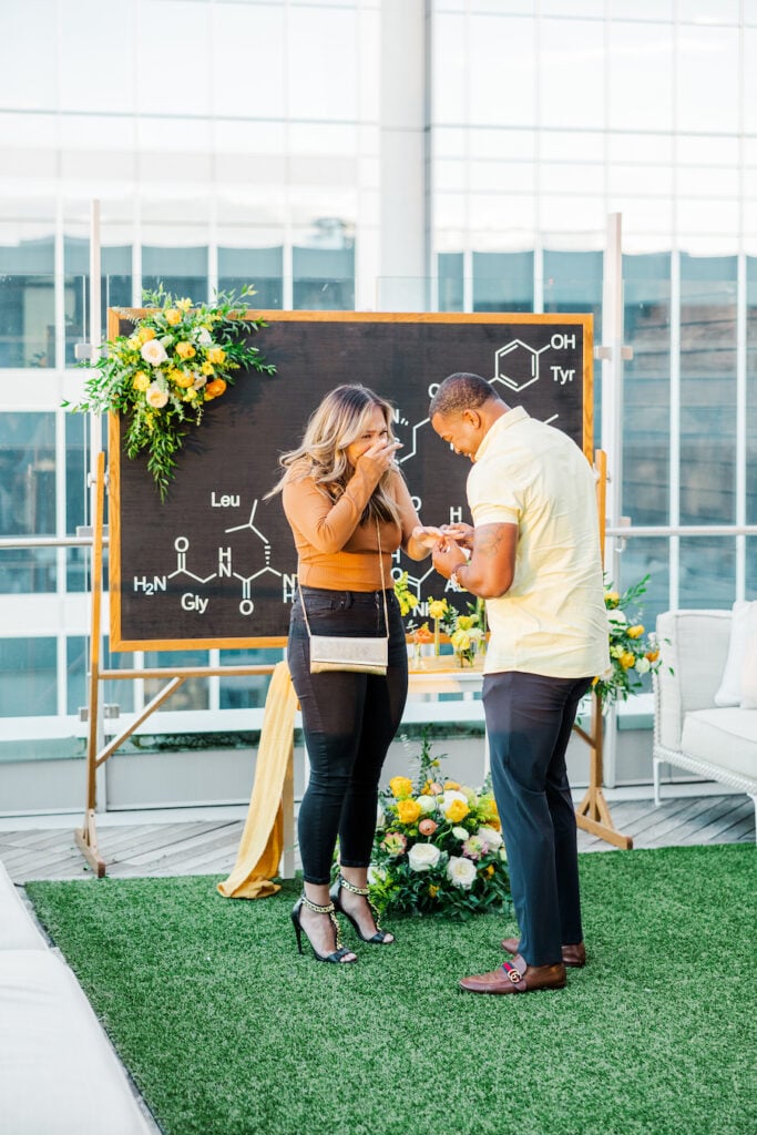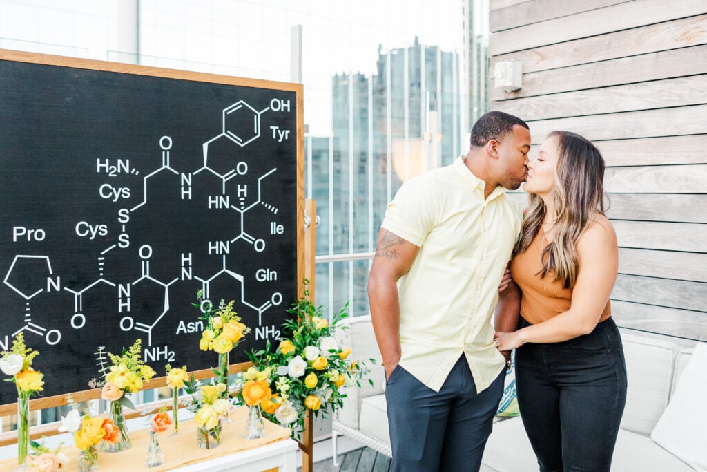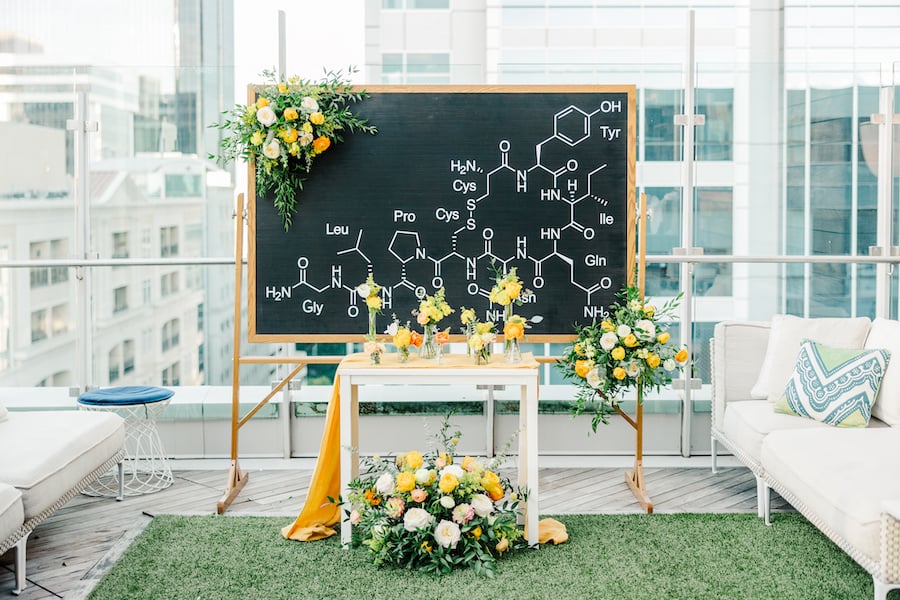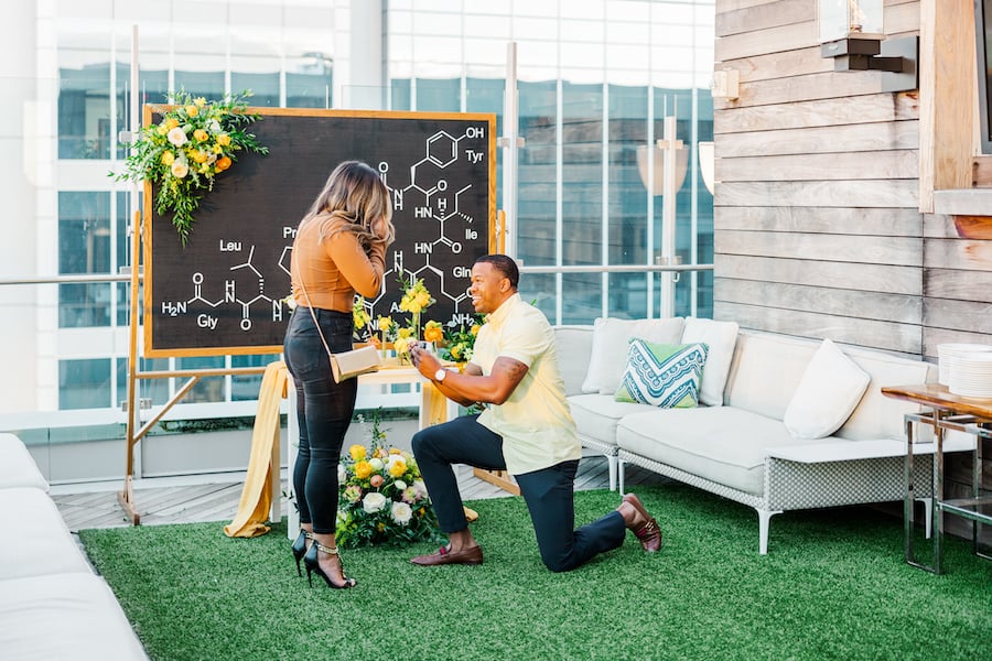 Set against the modern skyline, this North Carolina Rooftop Proposal was designed as a heartfelt nod to the science of love. A custom chalkboard installation featured the chemical structure of oxytocin — the “bonding hormone” — symbolizing the deep connection these two share. Bright yellow and ivory florals cascaded from the board and surrounded a delicate display of blooms below, creating a fresh, joyful atmosphere that felt both intentional and celebratory. Thoughtful details and meaningful symbolism came together beautifully, making this proposal not only visually stunning, but deeply personal from start to finish.
