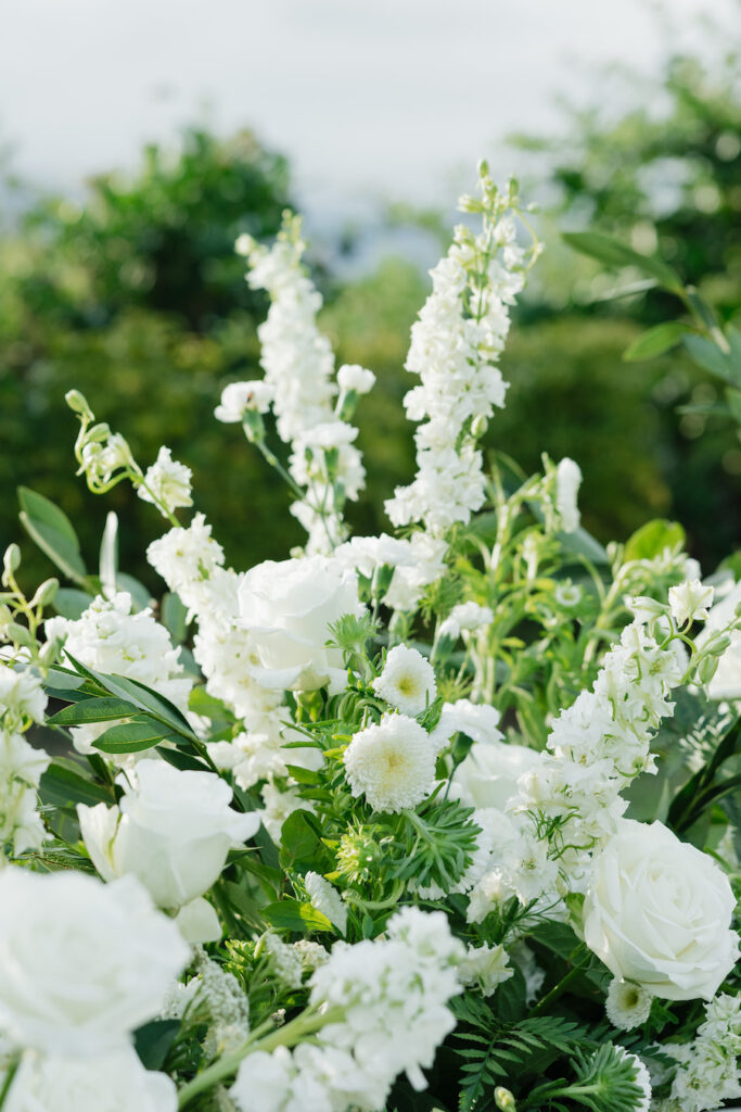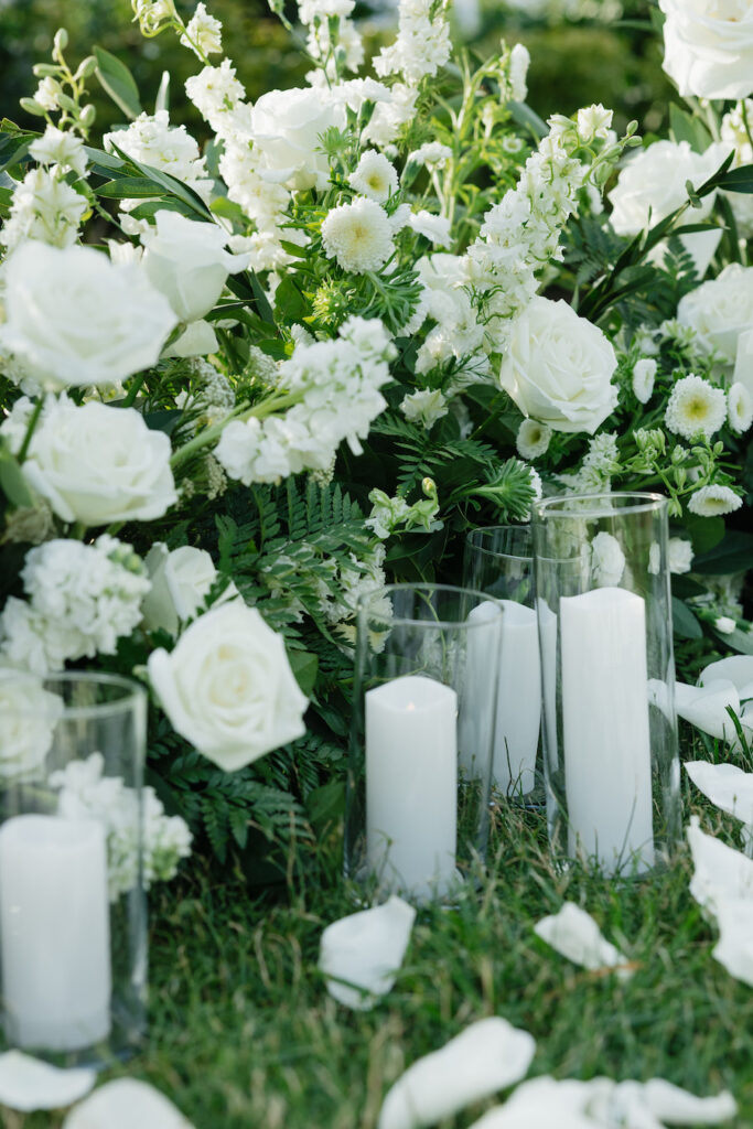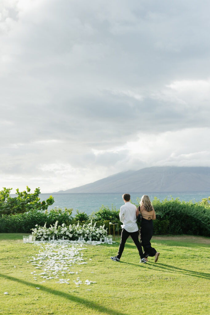 Set against the breathtaking backdrop of Maui’s coastline, this oceanfront proposal was the definition of effortless romance. As waves rolled in and clouds drifted over the distant mountains, a secluded lawn transformed into an intimate, all-white dream. A delicate pathway of scattered white rose petals led to a lush grounded floral installation, overflowing with creamy roses, soft blooms, and natural greenery—perfectly complementing the serene beauty of the island.