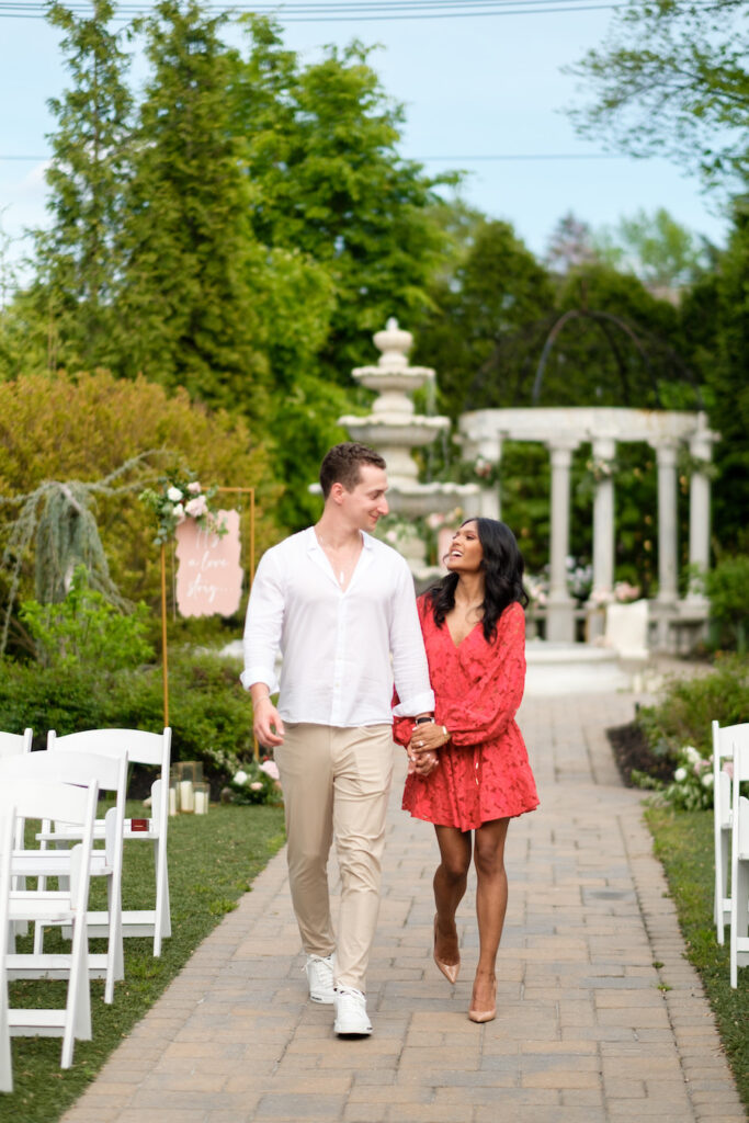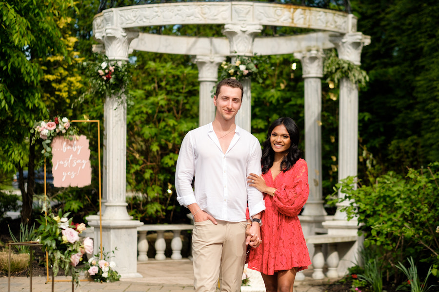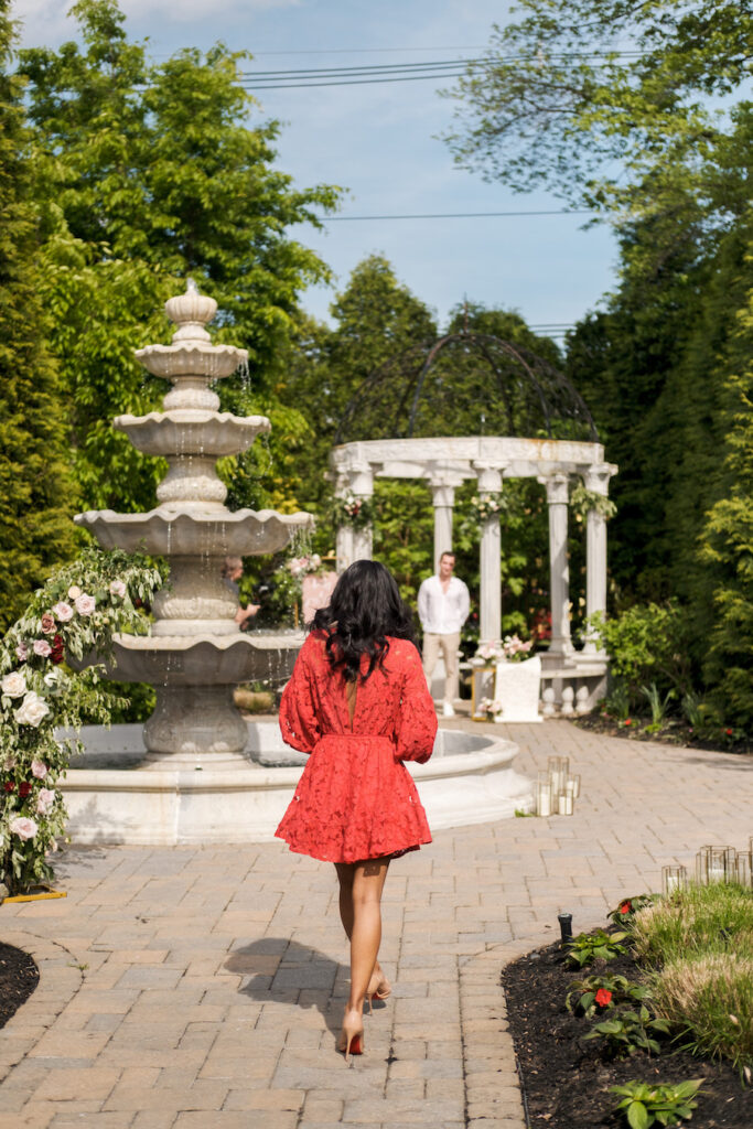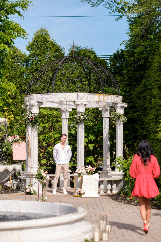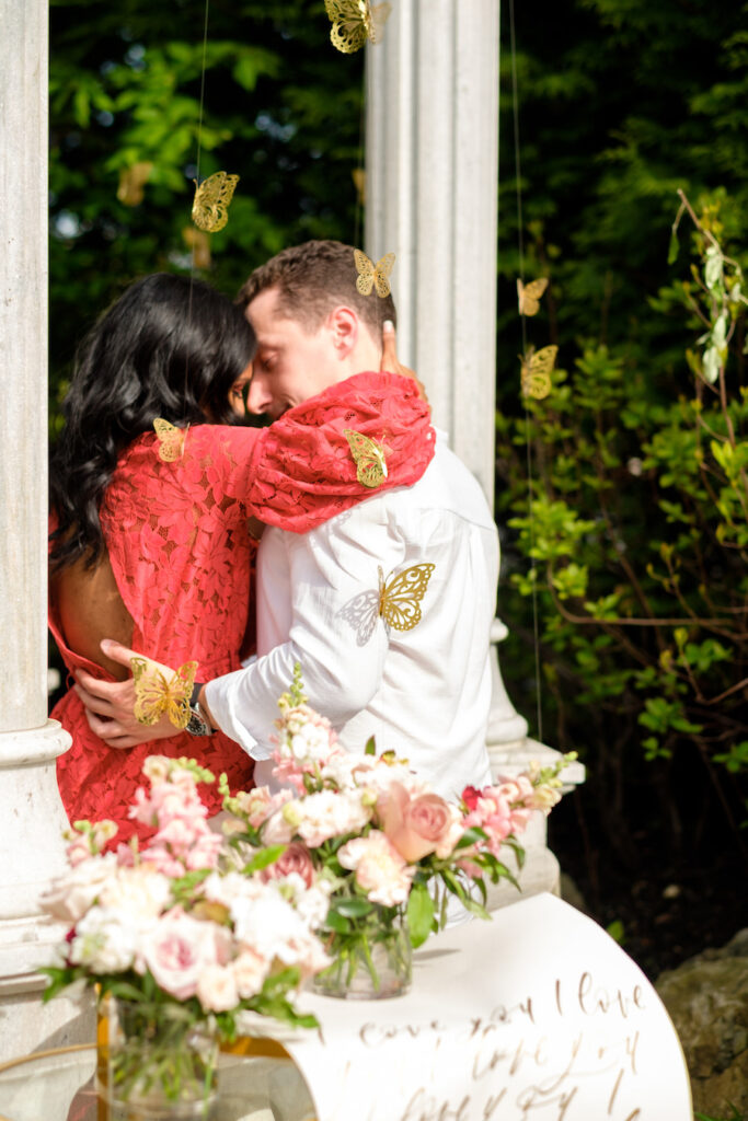 Like a modern-day fairytale brought to life, this garden proposal in New Jersey was beautifully inspired by Taylor Swift’s Love Story. Set beneath a romantic stone gazebo, soft blush and ivory florals framed the moment while delicate butterflies floated overhead, creating a dreamy, storybook atmosphere. As she made her way toward him in a vibrant red dress, the scene felt straight out of a love song—timeless, emotional, and completely magical. He welcomed her with a floral crown before pulling her close, and in that quiet, intimate moment, asked her to spend forever together. Surrounded by thoughtful details like handwritten love notes, cascading blooms, and golden accents, every element reflected their unique story. This New Jersey garden proposal captures the essence of romance and nostalgia, proving that when love feels like a fairytale, the moment becomes unforgettable.