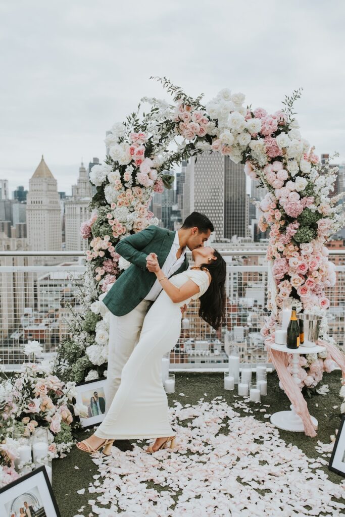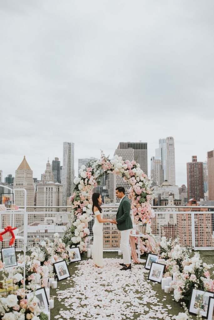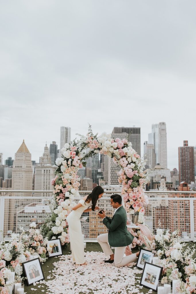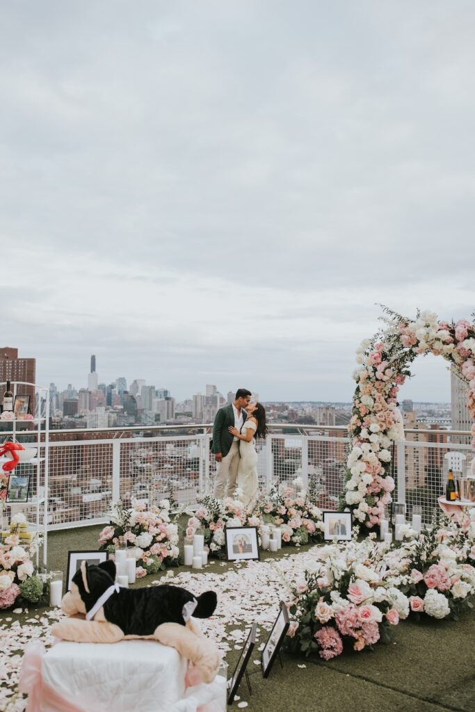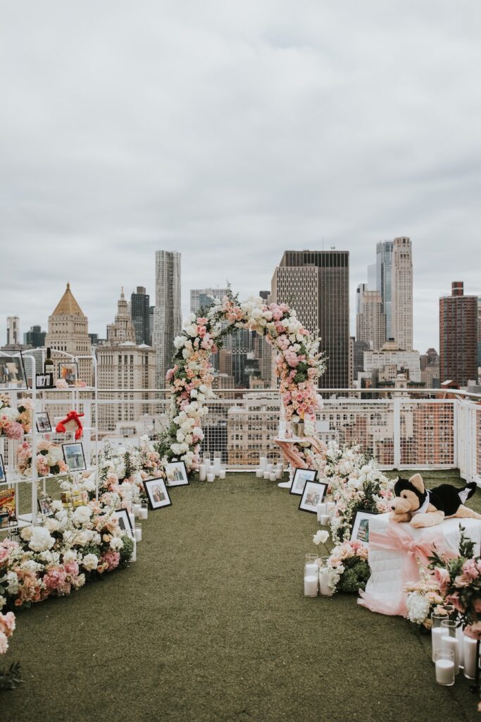 A luxury custom rooftop proposal unfolds high above New York City at the NoMo SoHo Penthouse, where the skyline stretches endlessly beneath a soft, cloudy sky. Lush pink florals spill across the rooftop, adding warmth and romance to the modern, elevated setting. Personalized décor and meaningful memorabilia are thoughtfully woven throughout the space, telling a story unique to the couple. As an artist paints the moment live, the iconic cityscape becomes part of the memory itself, moody and cinematic under the overcast light. The result is an intimate yet grand experience that feels deeply personal, effortlessly elegant, and unmistakably unforgettable.
