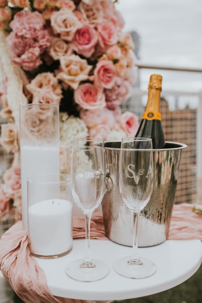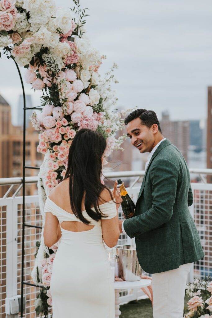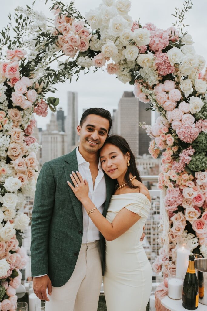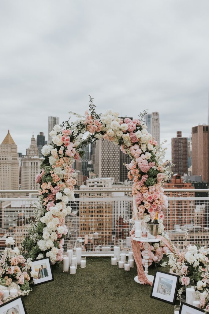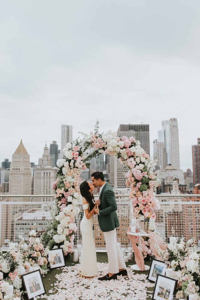 A luxury custom rooftop proposal unfolds high above New York City at the NoMo SoHo Penthouse, where the skyline stretches endlessly beneath a soft, cloudy sky. Lush pink florals spill across the rooftop, adding warmth and romance to the modern, elevated setting. Personalized décor and meaningful memorabilia are thoughtfully woven throughout the space, telling a story unique to the couple. As an artist paints the moment live, the iconic cityscape becomes part of the memory itself, moody and cinematic under the overcast light. The result is an intimate yet grand experience that feels deeply personal, effortlessly elegant, and unmistakably unforgettable.