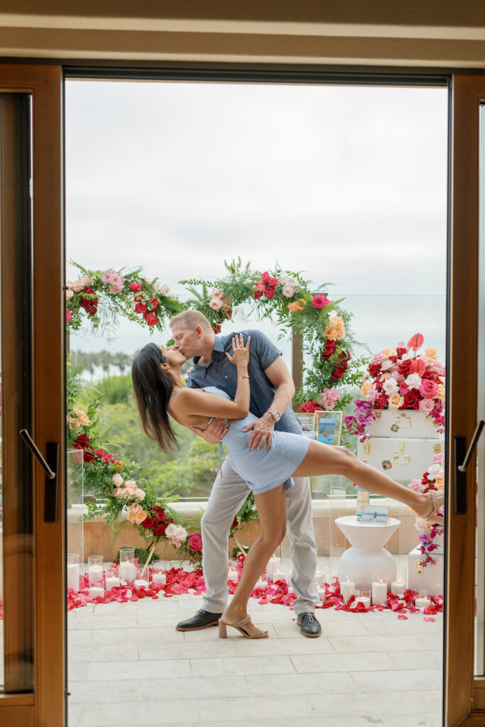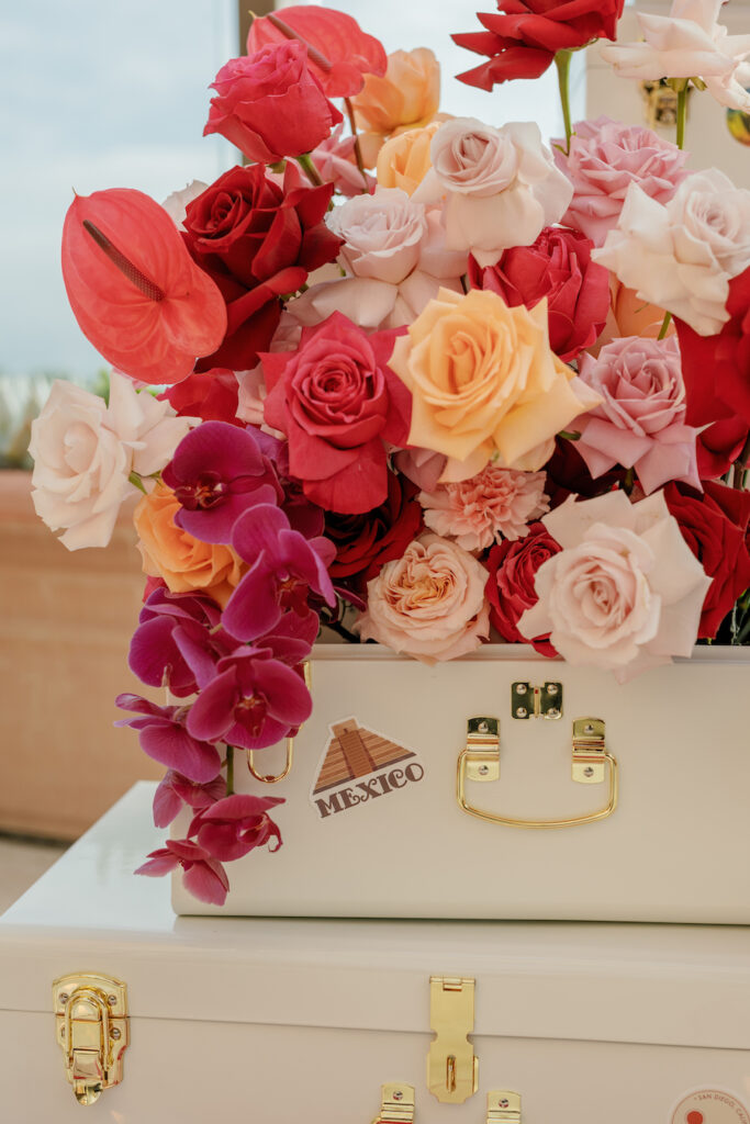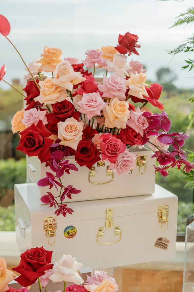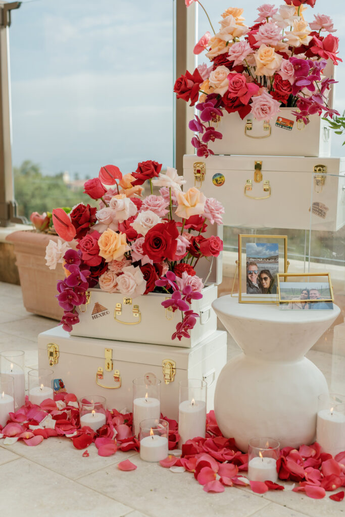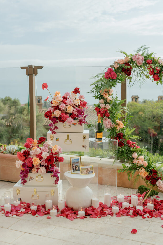 This Newport Beach proposal was a beautifully curated celebration of their love story. Set against sweeping coastal views, vintage-inspired travel trunks — adorned with stickers from the many places they’ve explored together — overflowed with vibrant florals in romantic shades of red, blush, and peach.