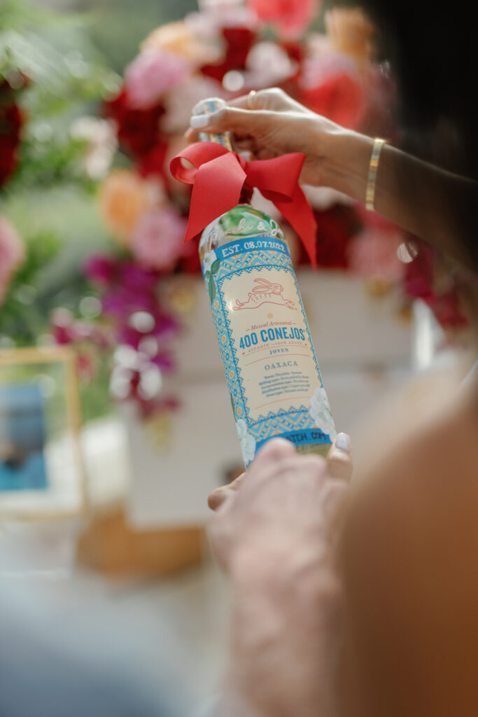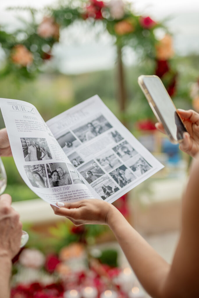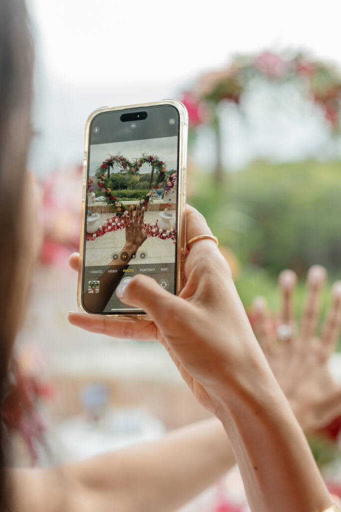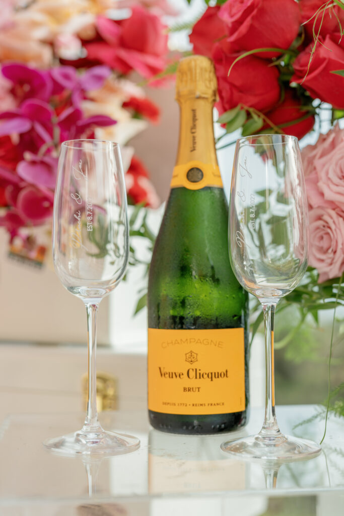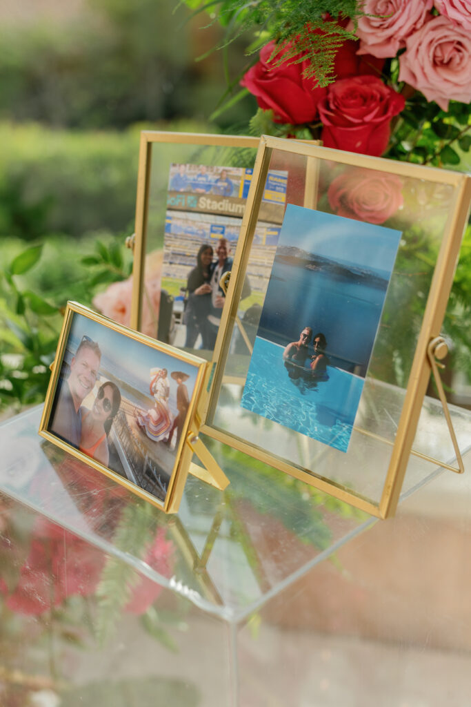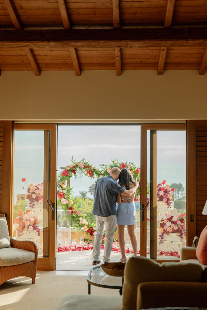 This Newport Beach proposal was a beautifully curated celebration of their love story. Set against sweeping coastal views, vintage-inspired travel trunks — adorned with stickers from the many places they’ve explored together — overflowed with vibrant florals in romantic shades of red, blush, and peach.