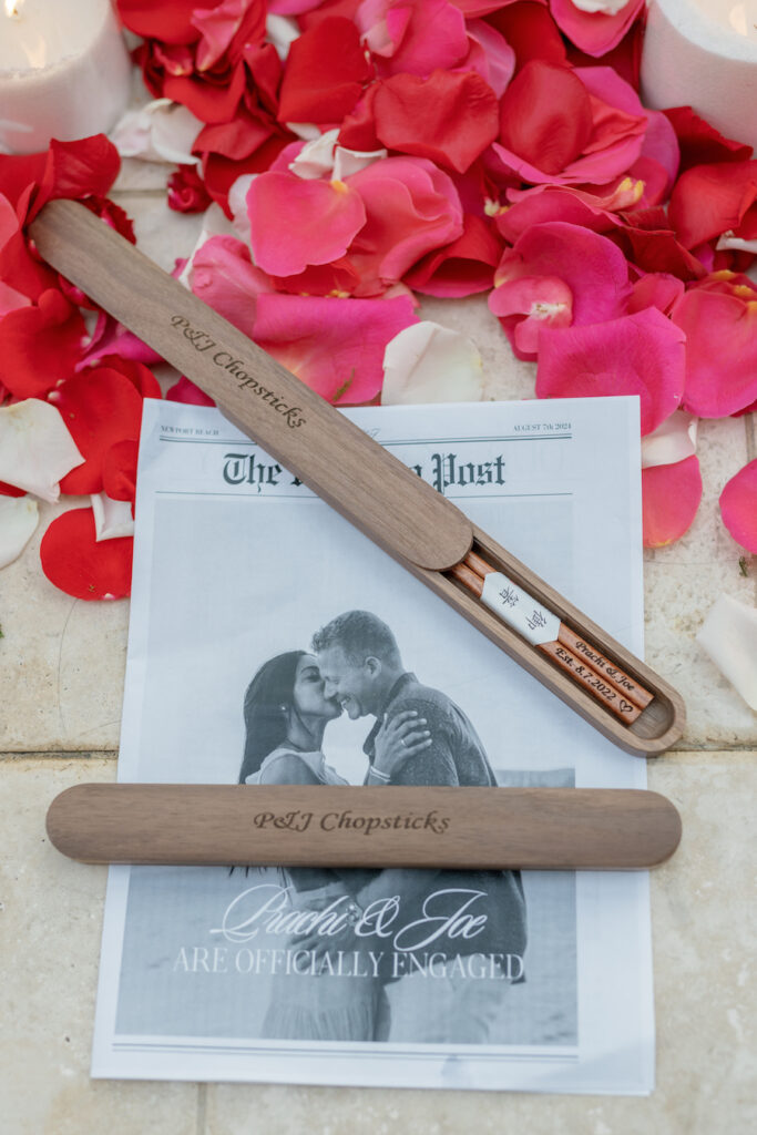 Custom newspapers highlighted milestones from their relationship, while personalized chopsticks paid tribute to their very first sushi date — a subtle, meaningful nod to where it all began. Every detail was thoughtfully designed to reflect their journey, creating a proposal that felt deeply personal, elevated, and unforgettable.