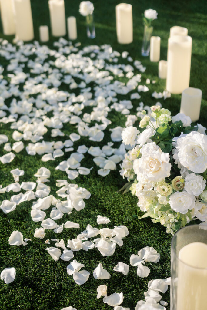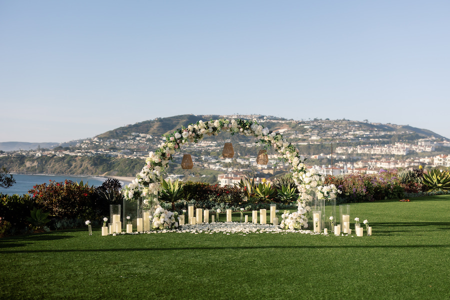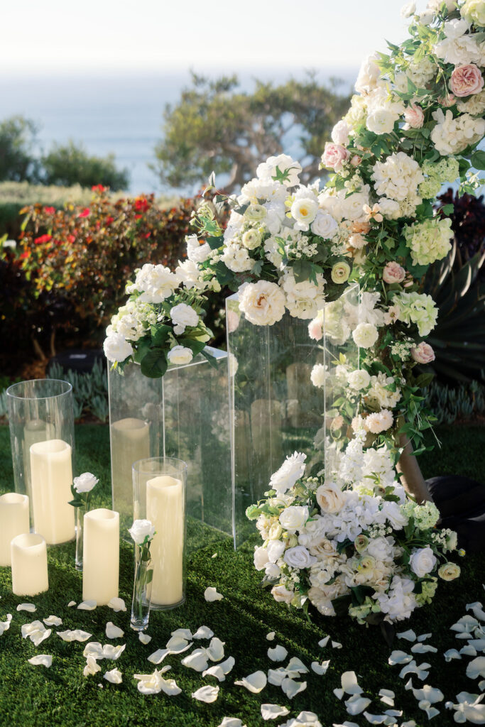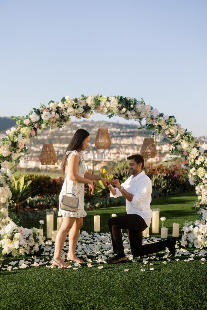 This unforgettable Ocean View Proposal In Laguna Beach blended coastal romance with elevated design for a truly breathtaking moment. Set against sweeping ocean views and golden California light, our signature FAUX Arch and FAUX Deluxe setups were beautifully combined to create a lush, immersive scene. Soft ivory and blush florals framed the couple beneath the floral arch, while glowing candlelight and layered petals lined the aisle for an added touch of elegance and intimacy. As the waves shimmered in the distance, he dropped to one knee and asked the question of a lifetime — a perfectly styled Laguna Beach proposal that felt both luxurious and deeply personal.