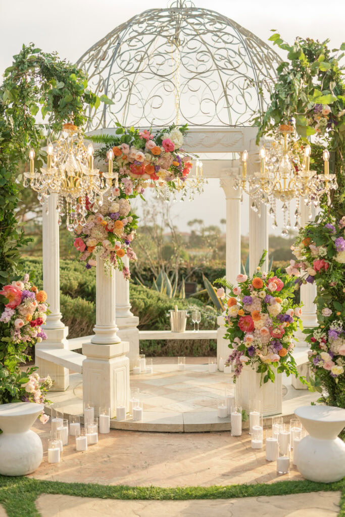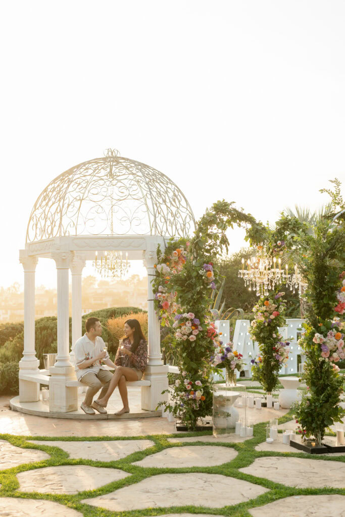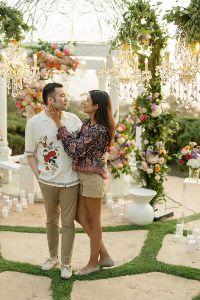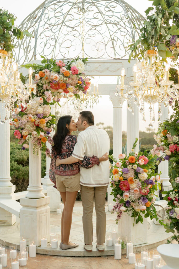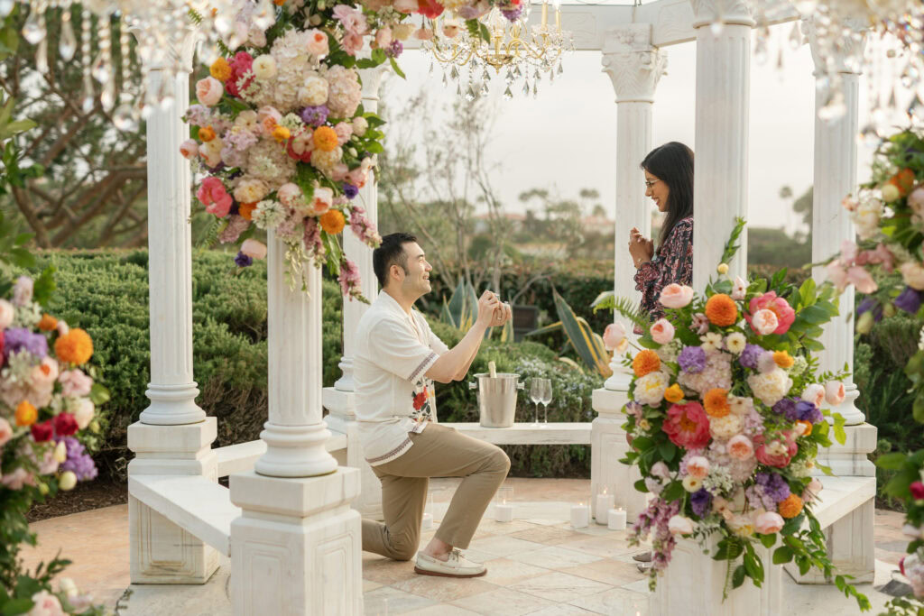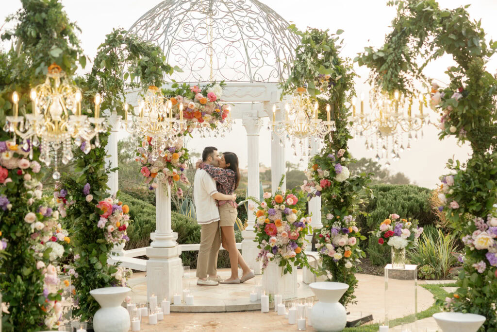 This stunning Orange County chandelier proposal for Frank and Cindy feels straight out of a fairytale — luxurious, romantic, and absolutely breathtaking. The gazebo shines with lush blooms and flowing fabric that sways gently in the evening breeze.
