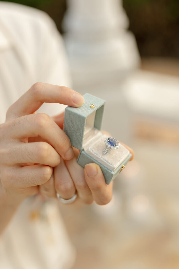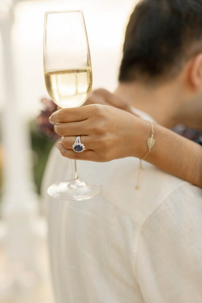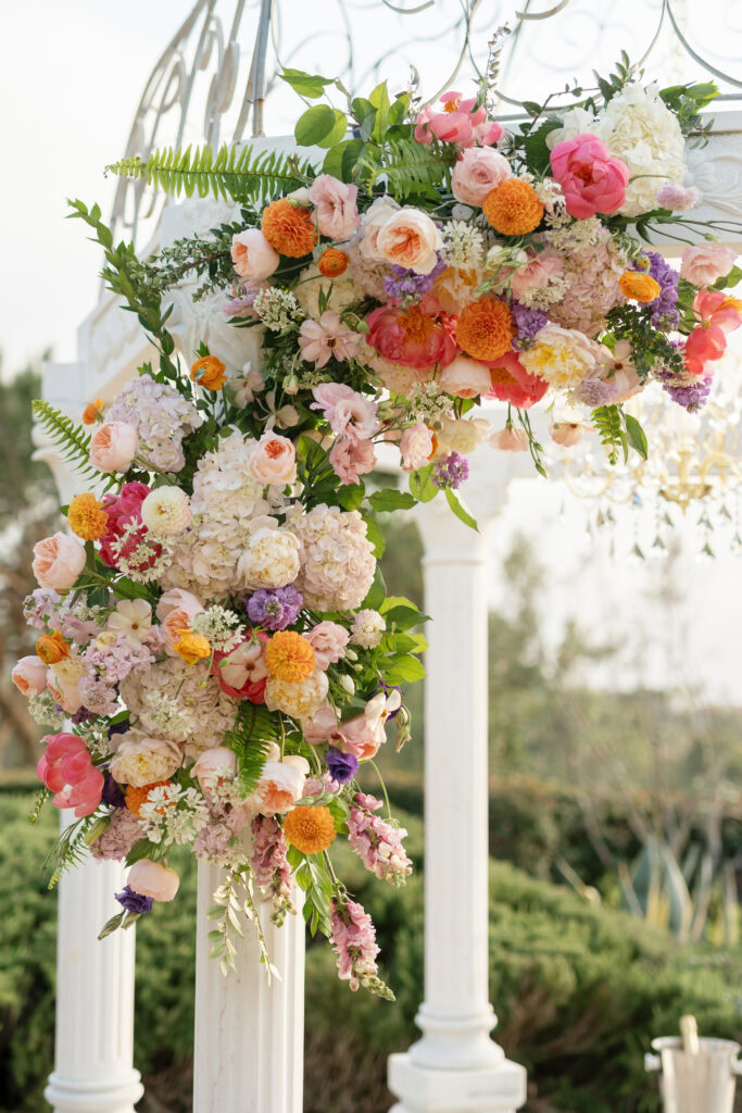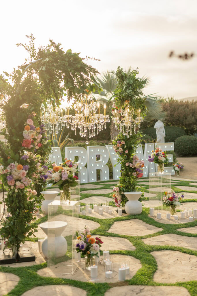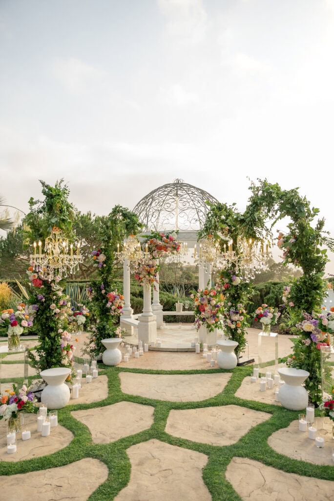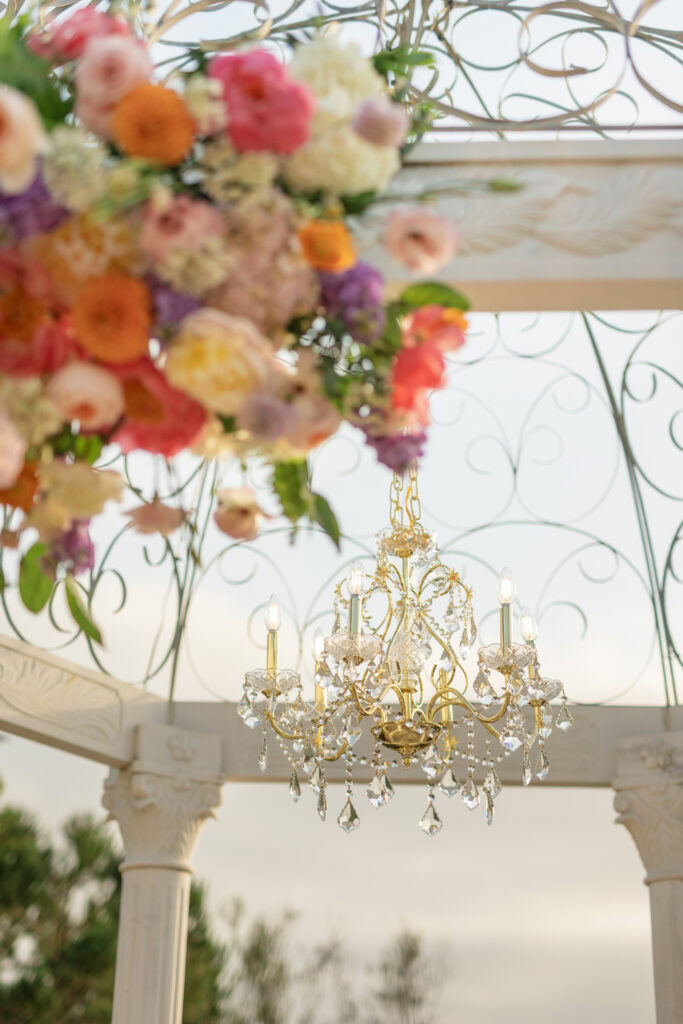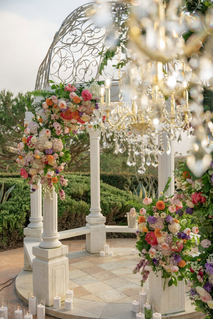 This stunning Orange County chandelier proposal for Frank and Cindy feels straight out of a fairytale — luxurious, romantic, and absolutely breathtaking. The gazebo shines with lush blooms and flowing fabric that sways gently in the evening breeze.
