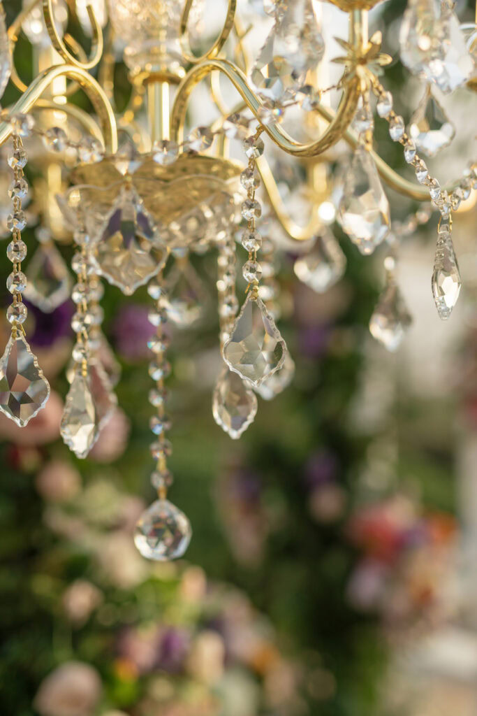 Five sparkling chandeliers hang above them, filling the air with a warm, golden light. Each crystal catches the sunset and glimmers like stardust, making the moment feel truly magical. The soft flicker of candlelight and the sound of the ocean surround them, creating a scene that feels both intimate and grand.