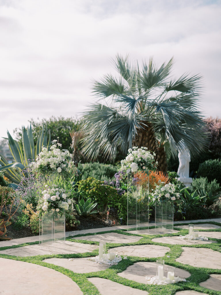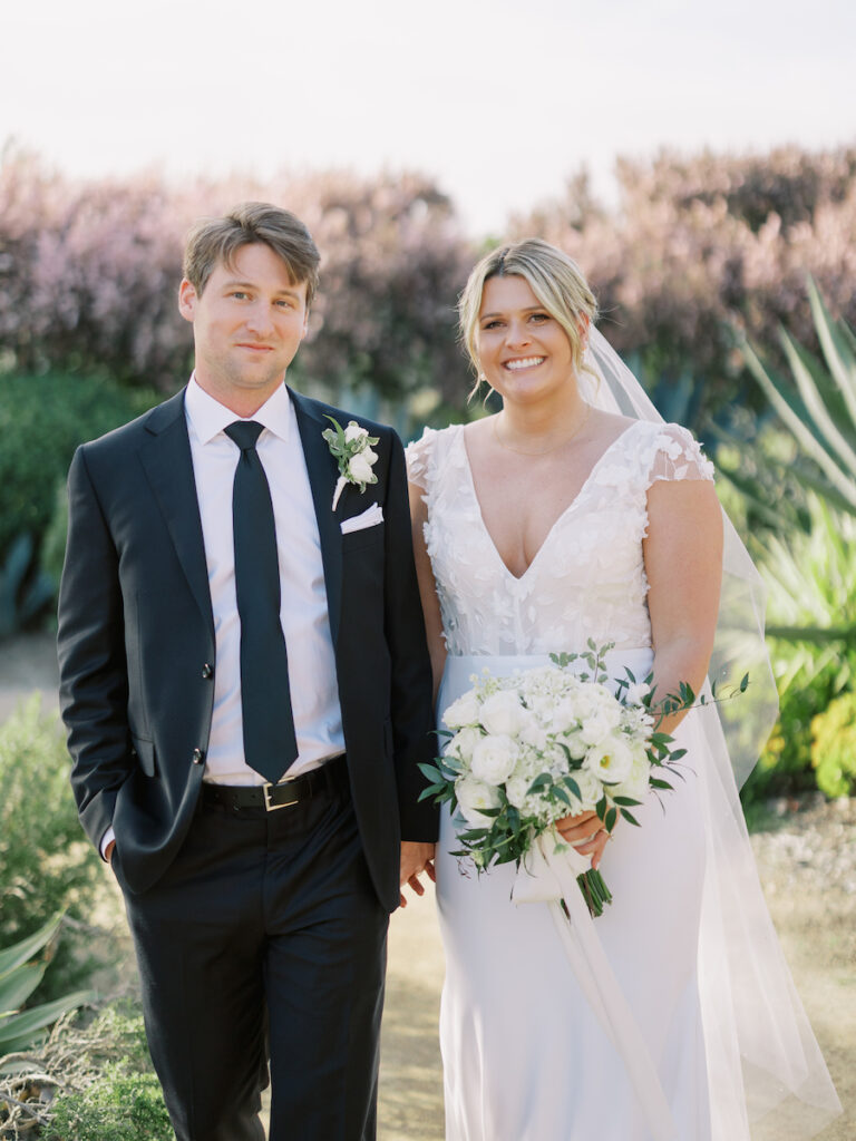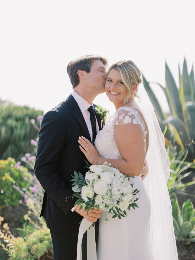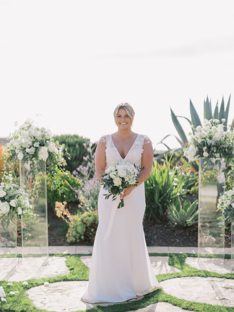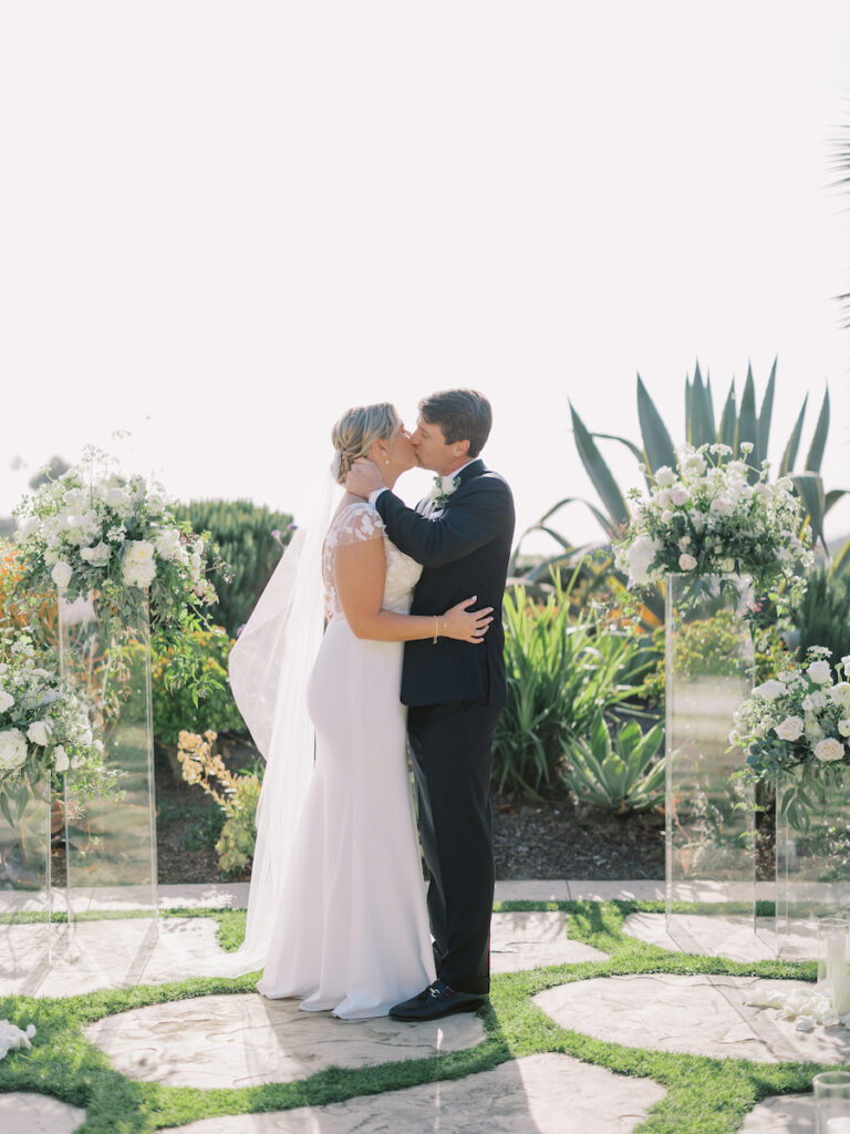 This intimate Orange County elopement was pure romance from start to finish. With only the couple present, The Yes Girls curated every detail to make the day feel deeply personal and meaningful. Set against sweeping ocean views, the ceremony space bloomed with soft white and green florals that framed the couple as they exchanged vows under the California sun.