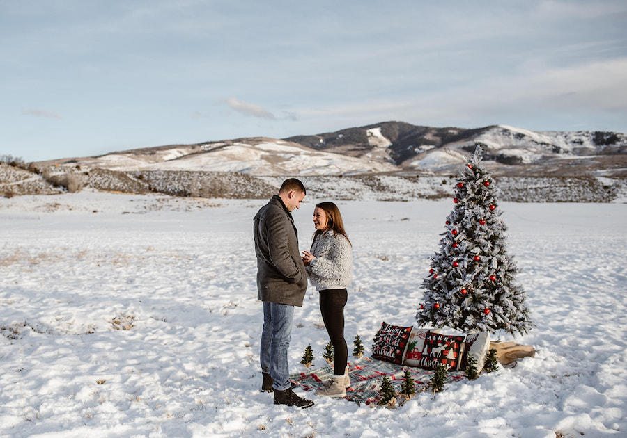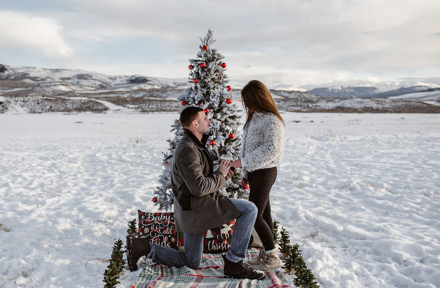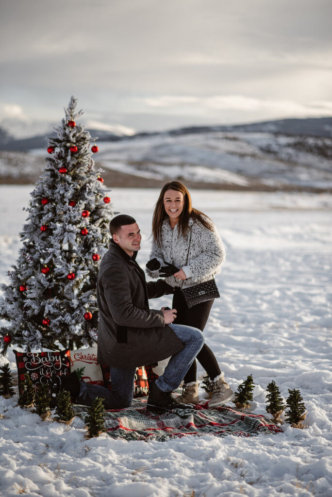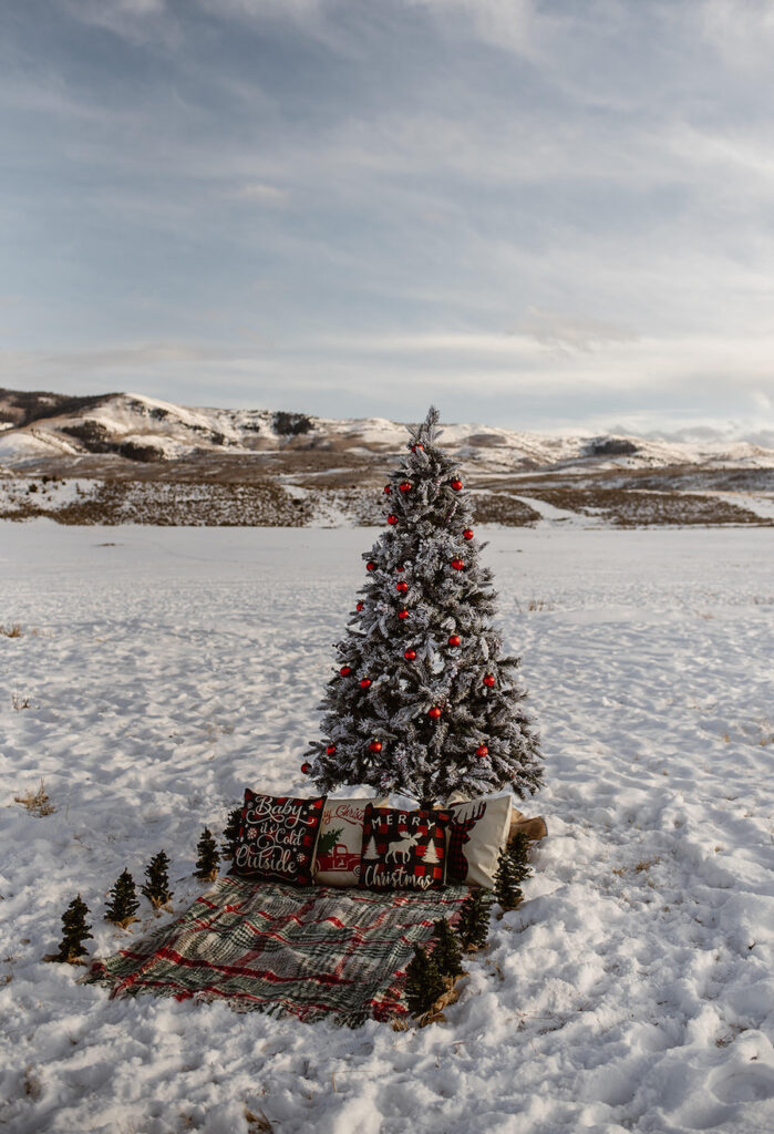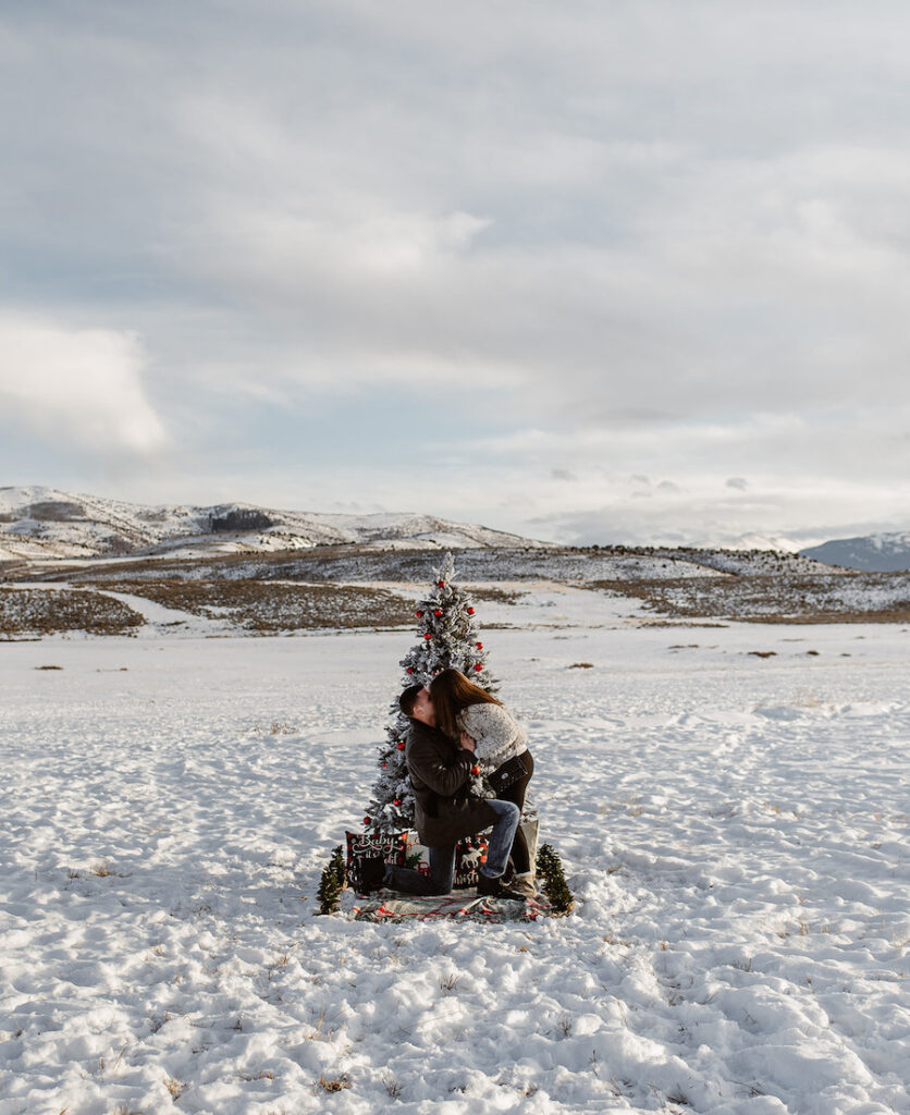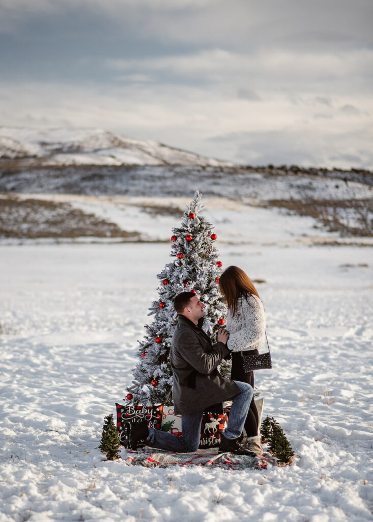 This magical winter proposal in Vail, Colorado felt like stepping into a real-life snow globe. The experience began with a romantic horse-drawn carriage ride through the snowy landscape, setting the tone for an unforgettable holiday moment. The carriage delivered the couple to a custom-designed, Christmas-inspired proposal setup featuring a frosted evergreen tree adorned with red ornaments, cozy plaid accents, and festive décor that made the scene feel warm despite the mountain chill. Surrounded by breathtaking alpine views and fresh snow, he dropped to one knee in front of their one-of-a-kind holiday setting — a Vail proposal that was equal parts nostalgic, intimate, and truly unforgettable.