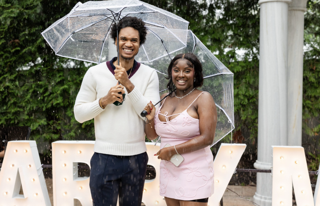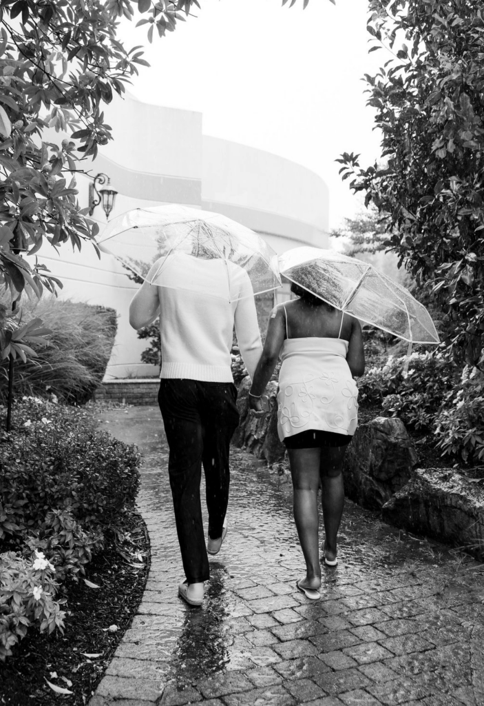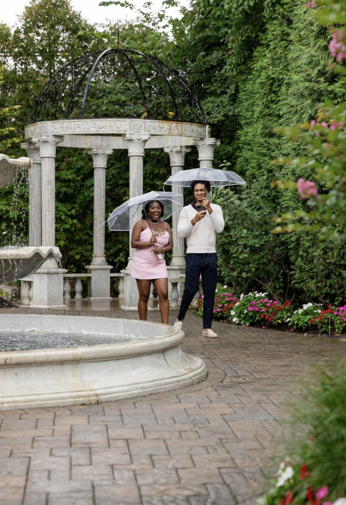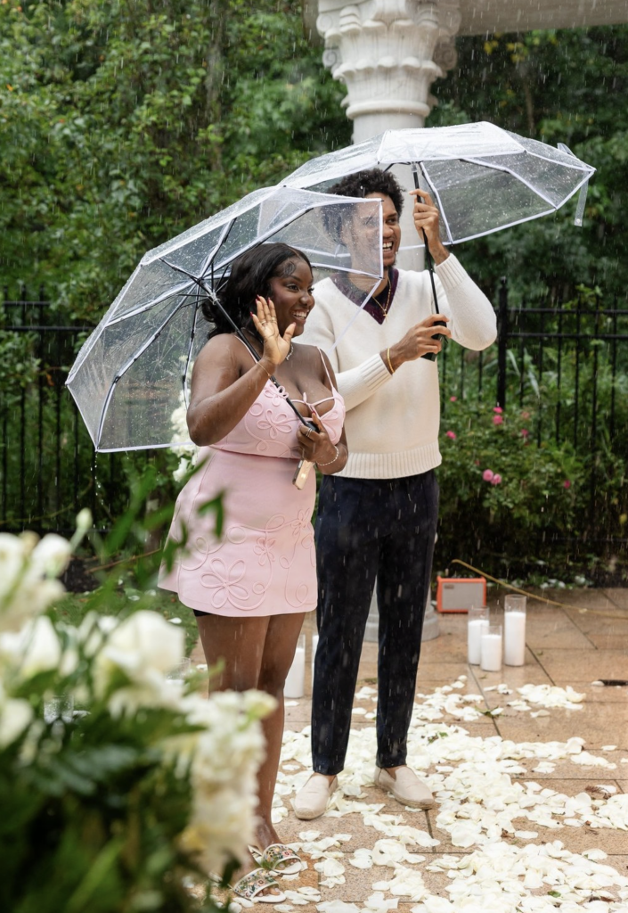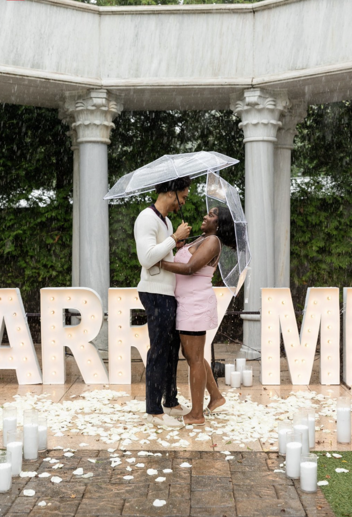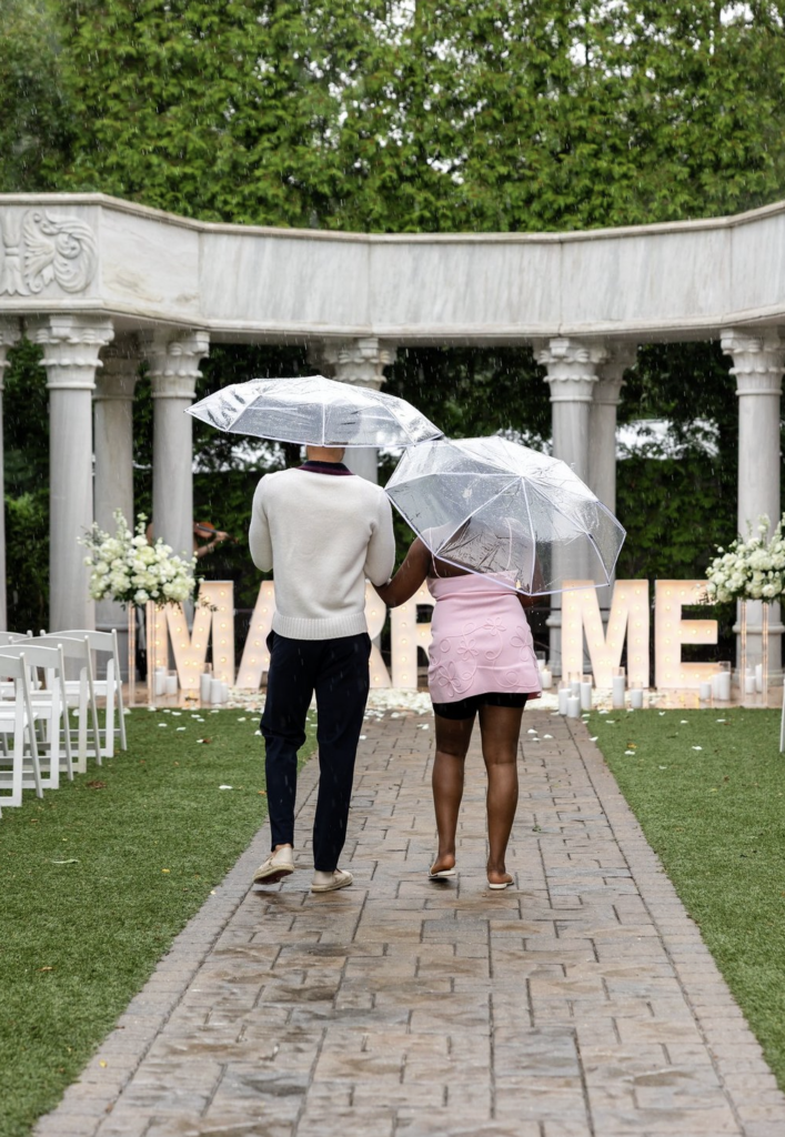 Some love stories are so strong, not even the rain can dim their shine—and this romantic rainy day garden proposal in New Jersey proves just that. Beneath a classic stone gazebo, glowing “MARRY ME” marquee letters and a pathway of white rose petals and candles set the scene, even as raindrops softly fell around them. With clear umbrellas in hand, the couple leaned into the moment, laughing, holding each other close, and embracing every second of the unexpected weather. What could have been a change of plans instead became part of the magic, adding a cinematic, deeply intimate feel to the proposal. As he got down on one knee, surrounded by flickering candlelight and the gentle sound of rain, she said yes to forever—completely swept up in the moment. This New Jersey garden proposal is a reminder that the most unforgettable proposals aren’t about perfect conditions, but about perfectly real moments filled with love, joy, and a little bit of spontaneity.