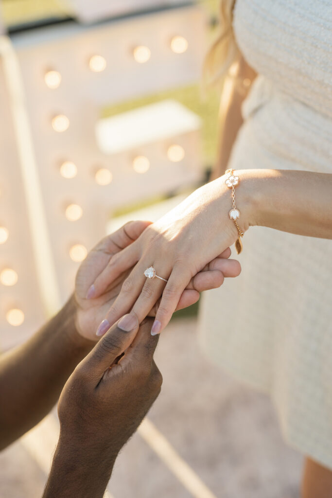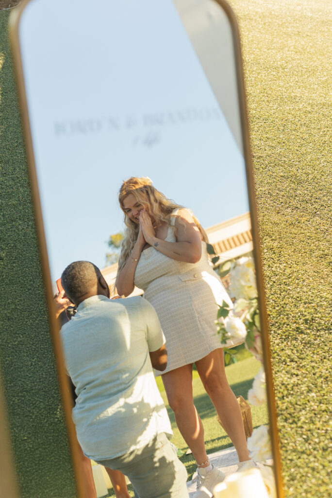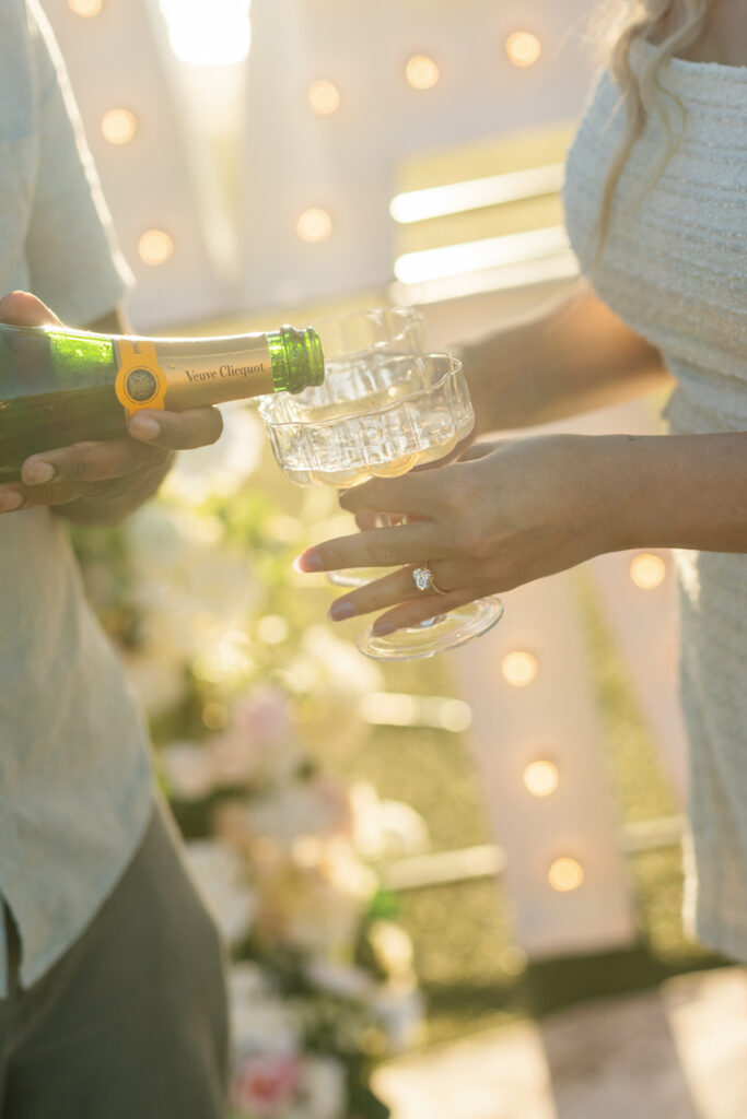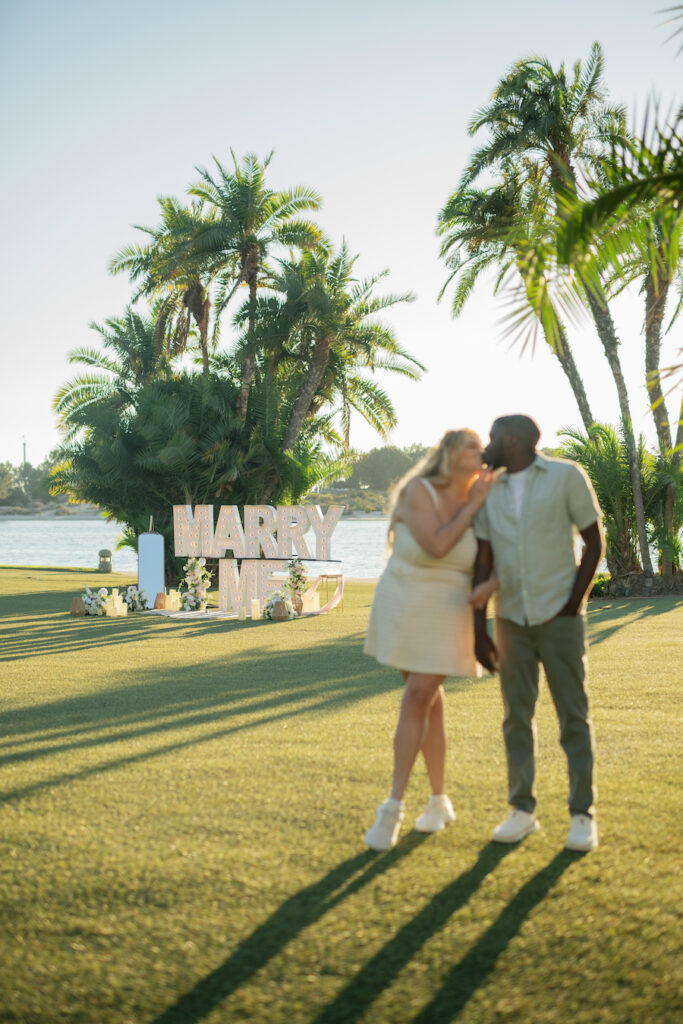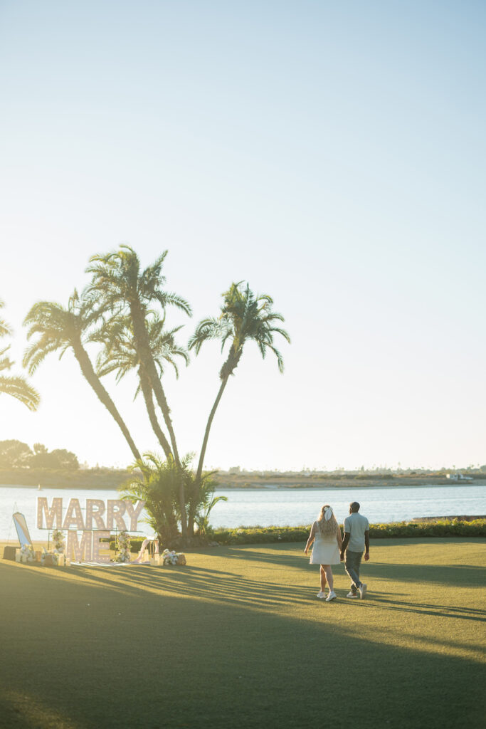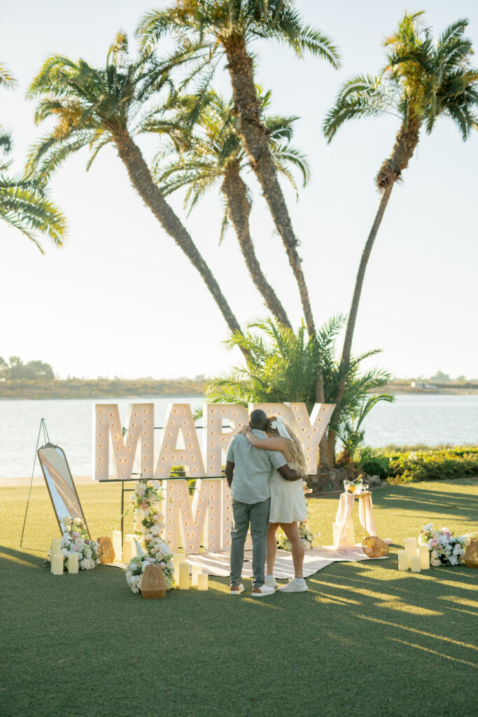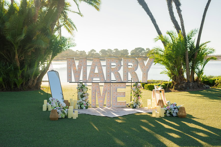Under the warm glow of a Southern California sunset, this San Diego proposal captured pure coastal magic. With palm trees swaying in the background and the bay shimmering just beyond, the couple strolled hand in hand toward a stunning “MARRY ME” display surrounded by romantic florals and soft candlelight. The open lawn and ocean horizon created a serene, cinematic moment — perfectly simple yet deeply personal. This setup radiated effortless elegance, blending the natural beauty of San Diego’s waterfront with a heartfelt, intimate design that celebrated love in its truest form.