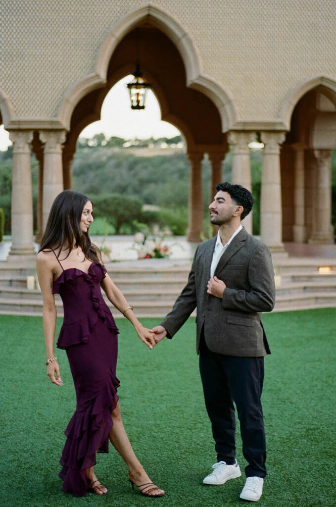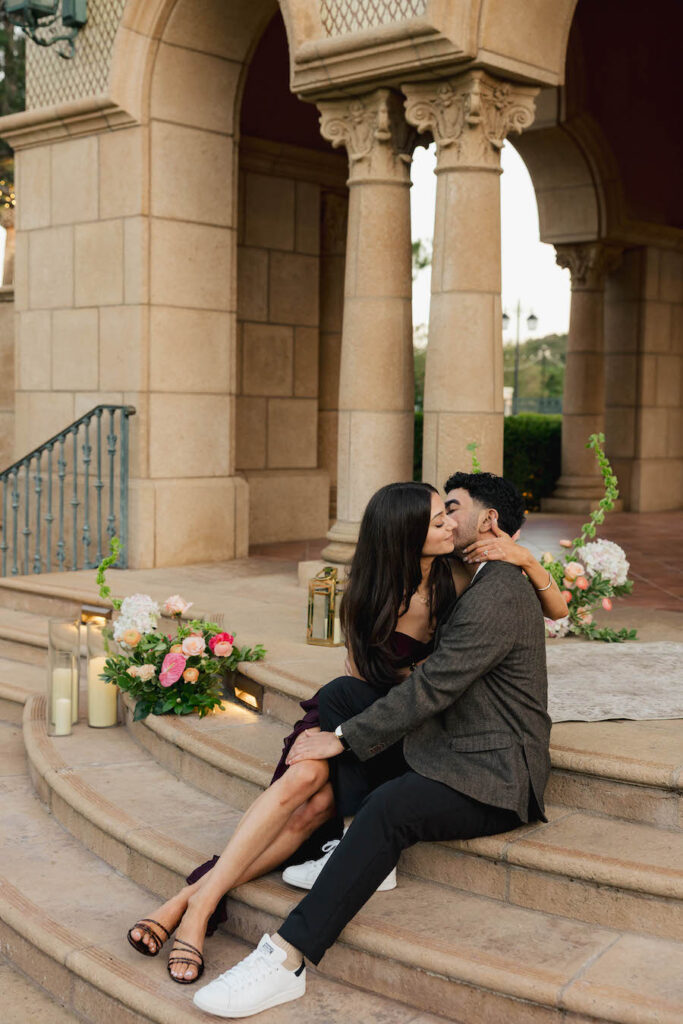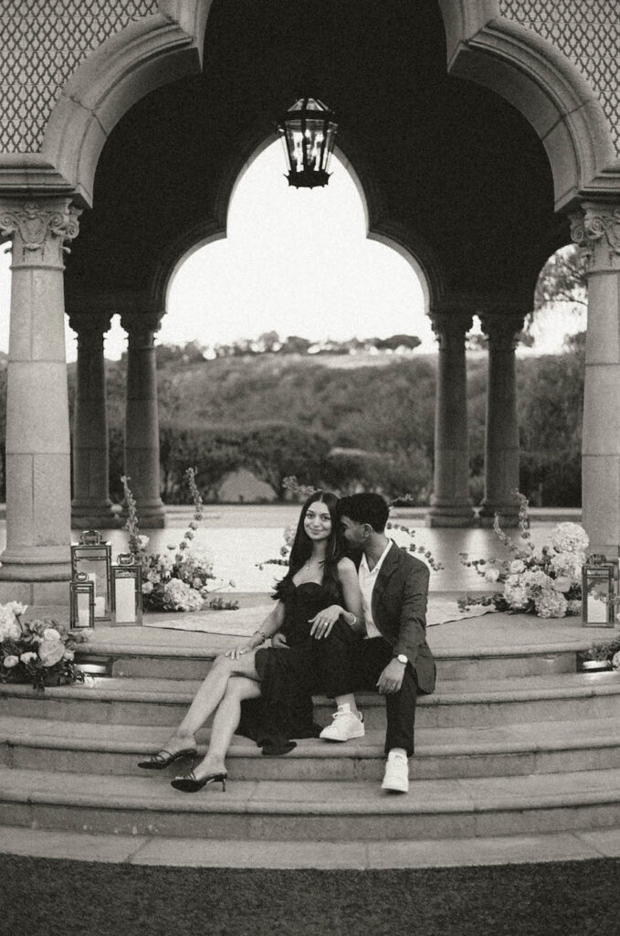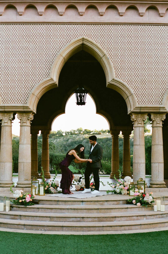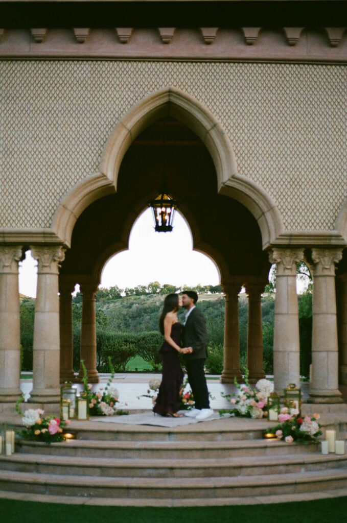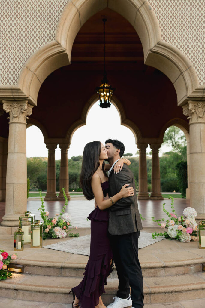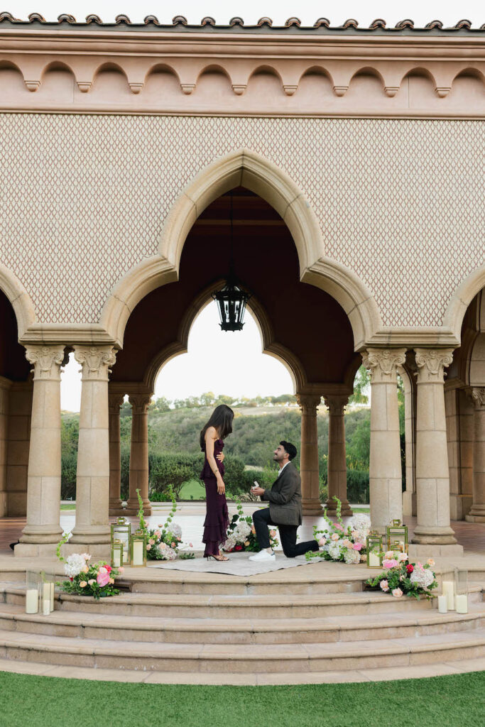 This stunning proposal at a breathtaking San Diego pavilion showcases The Yes Girls’ signature “The Modern” proposal setup package in the most romantic way. Set beneath grand architectural arches with sweeping views of lush greenery, this elegant location creates an unforgettable backdrop for a once-in-a-lifetime moment. Soft blush and ivory florals line the space in a grounded, contemporary design, while sleek gold lanterns and candlelight add warmth and sophistication. The refined, minimal aesthetic perfectly complements the timeless beauty of this San Diego proposal location, proving that modern styling can still feel deeply emotional and intimate. Every detail comes together to create a setting that feels elevated, luxurious, and effortlessly romantic — a truly picture-perfect place to say “yes.”