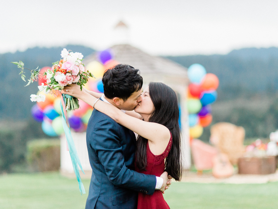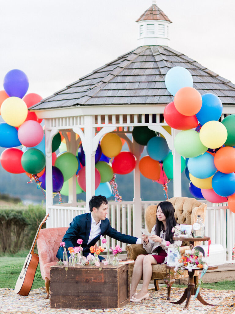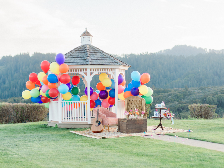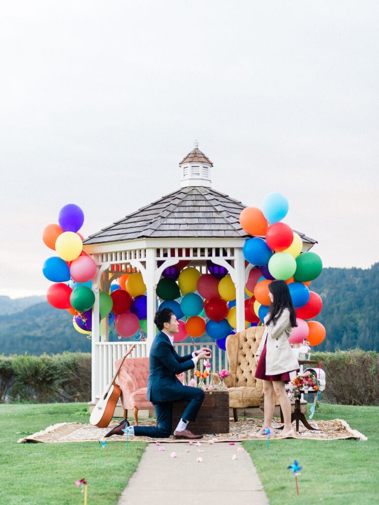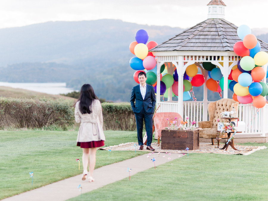 This whimsical San Francisco proposal was a heartfelt nod to the beloved movie Up, bringing a sense of adventure and nostalgia to a once-in-a-lifetime moment. Set in front of a charming gazebo overflowing with vibrant, floating balloons, the scene felt like it had been lifted straight from a storybook. Vintage-inspired lounge furniture, travel-themed details, and a meaningful “Our Adventure Book” display added deeply personal touches that reflected the couple’s journey together. As he got down on one knee surrounded by color, joy, and sweeping Bay Area views, this playful yet sentimental proposal perfectly captured the spirit of love, adventure, and a lifetime of memories still to come.