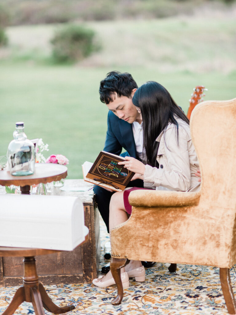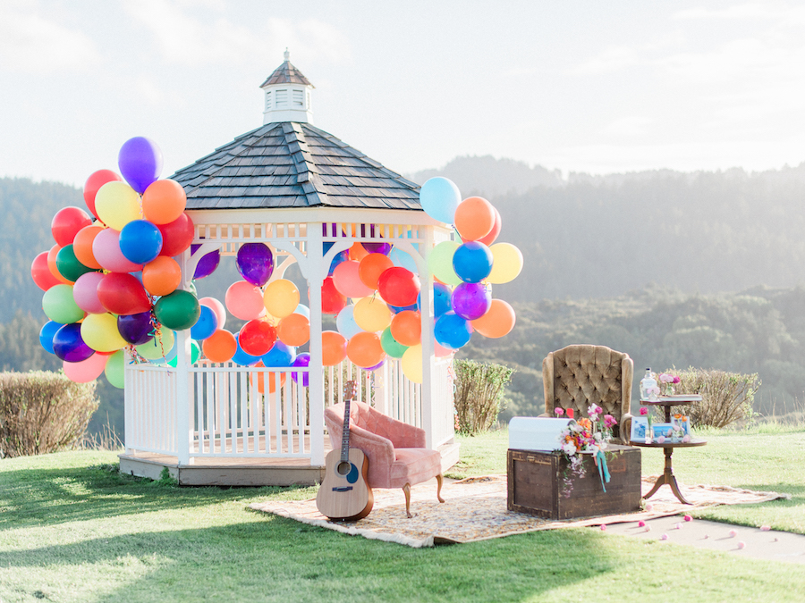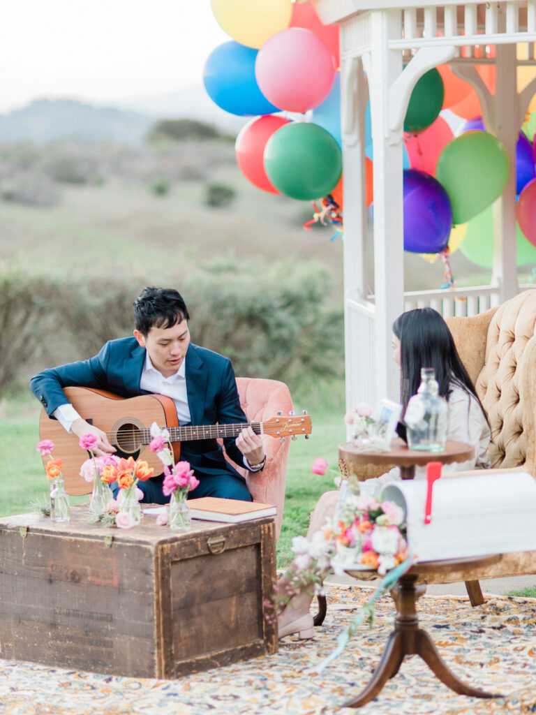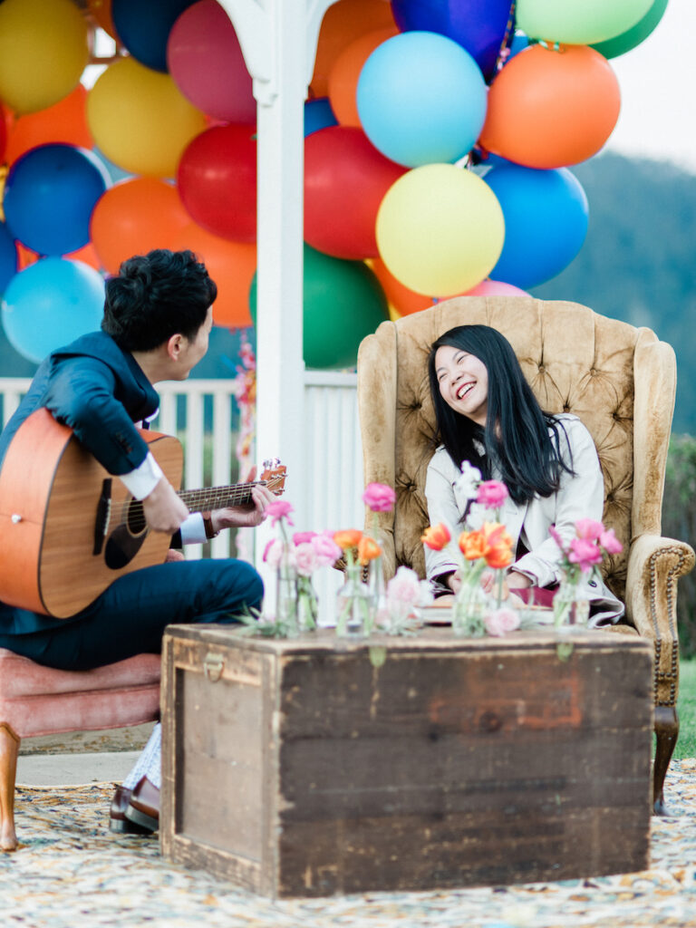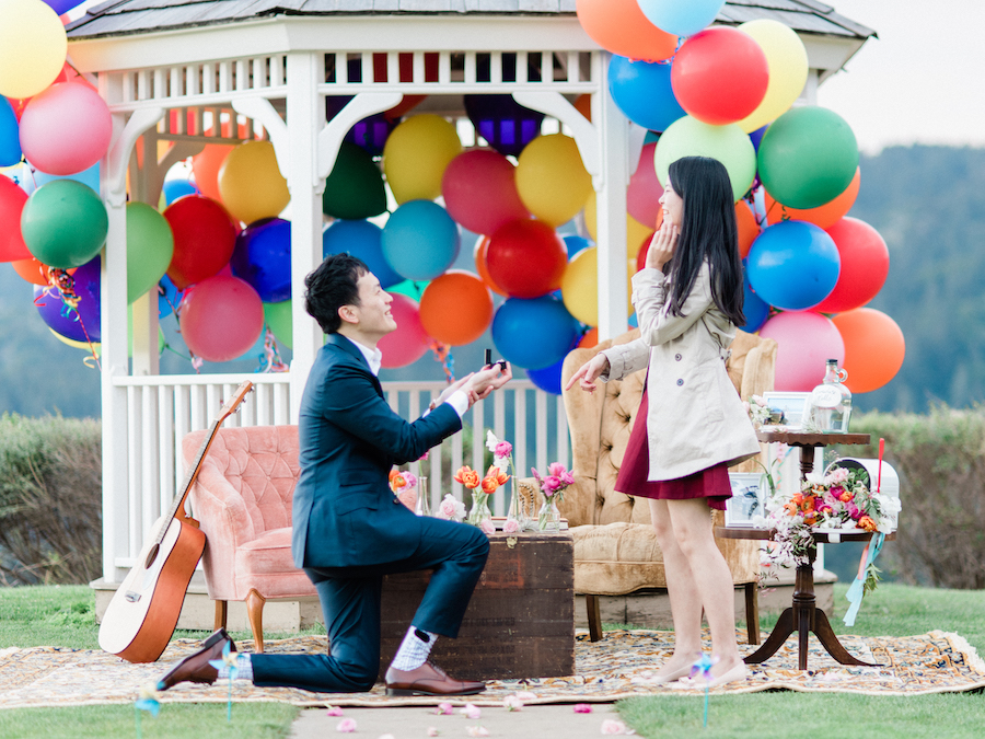 This whimsical San Francisco proposal was a heartfelt nod to the beloved movie Up, bringing a sense of adventure and nostalgia to a once-in-a-lifetime moment. Set in front of a charming gazebo overflowing with vibrant, floating balloons, the scene felt like it had been lifted straight from a storybook. Vintage-inspired lounge furniture, travel-themed details, and a meaningful “Our Adventure Book” display added deeply personal touches that reflected the couple’s journey together. As he got down on one knee surrounded by color, joy, and sweeping Bay Area views, this playful yet sentimental proposal perfectly captured the spirit of love, adventure, and a lifetime of memories still to come.