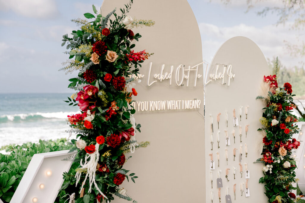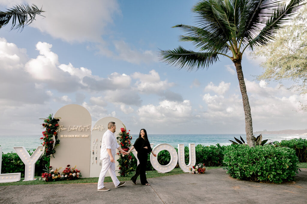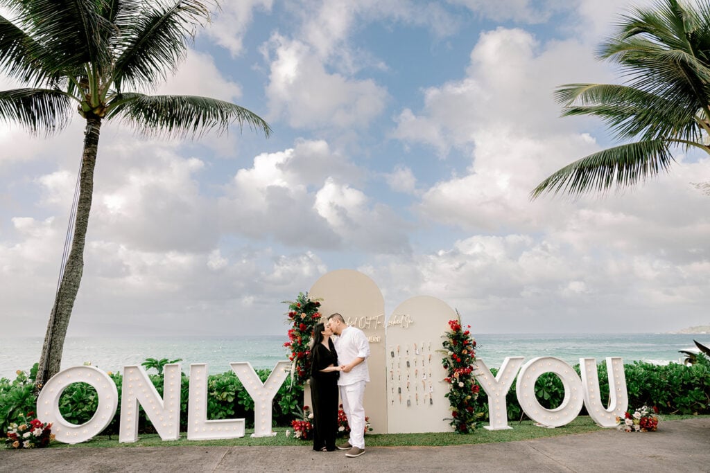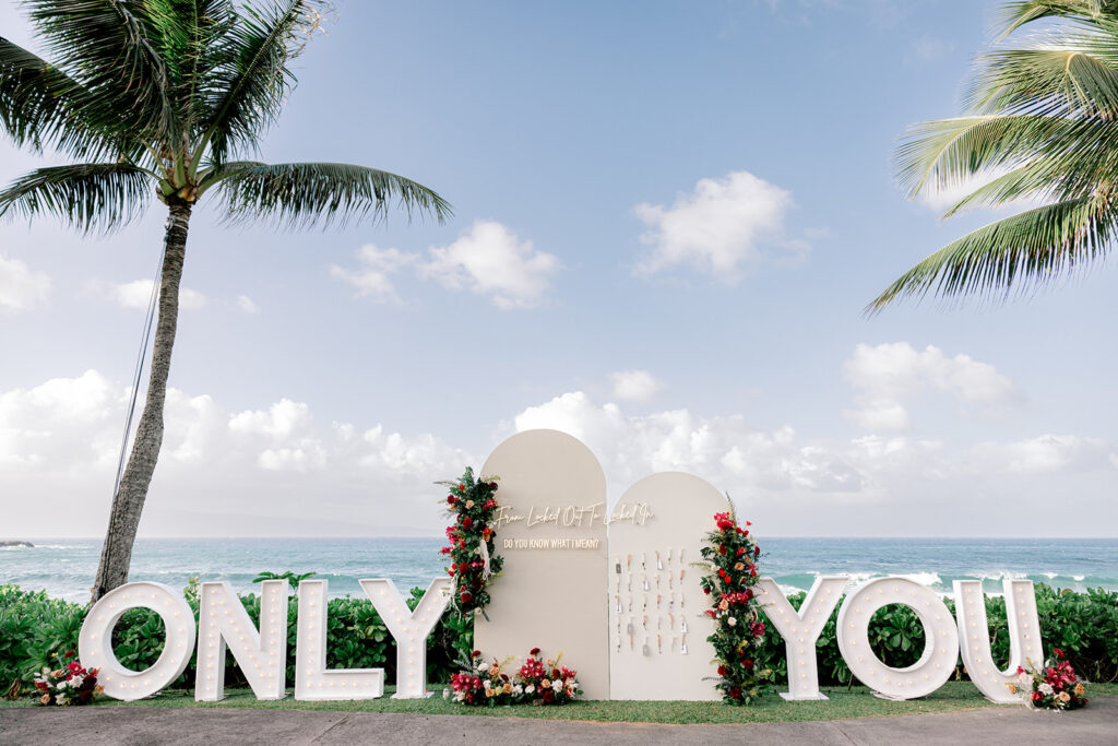 This custom Wailea proposal was designed as a heartfelt homage to their relationship, set against the sweeping ocean views and swaying palms of Hawaii’s coastline. Oversized marquee letters spelling “ONLY YOU” framed the shoreline, while lush florals in rich reds, soft blush, and warm neutrals added depth and romance to the tropical setting.