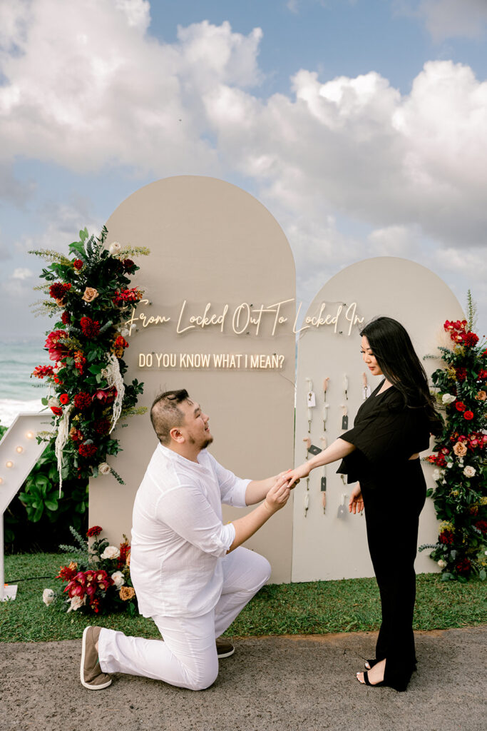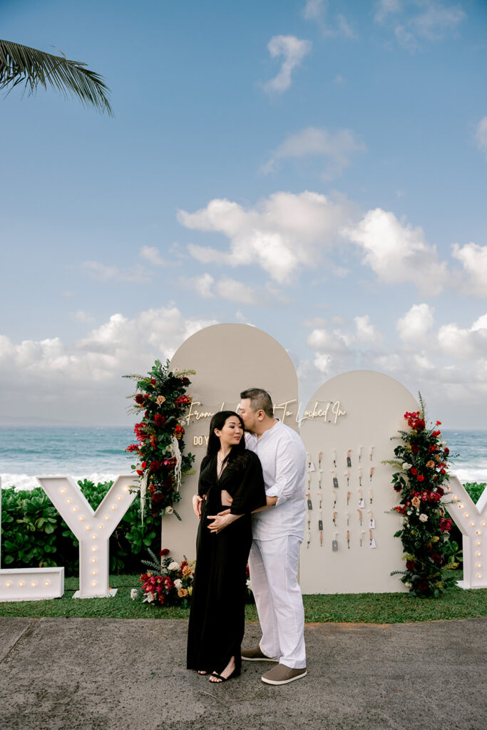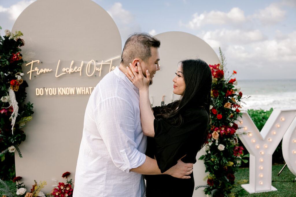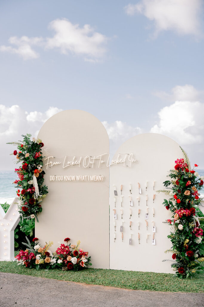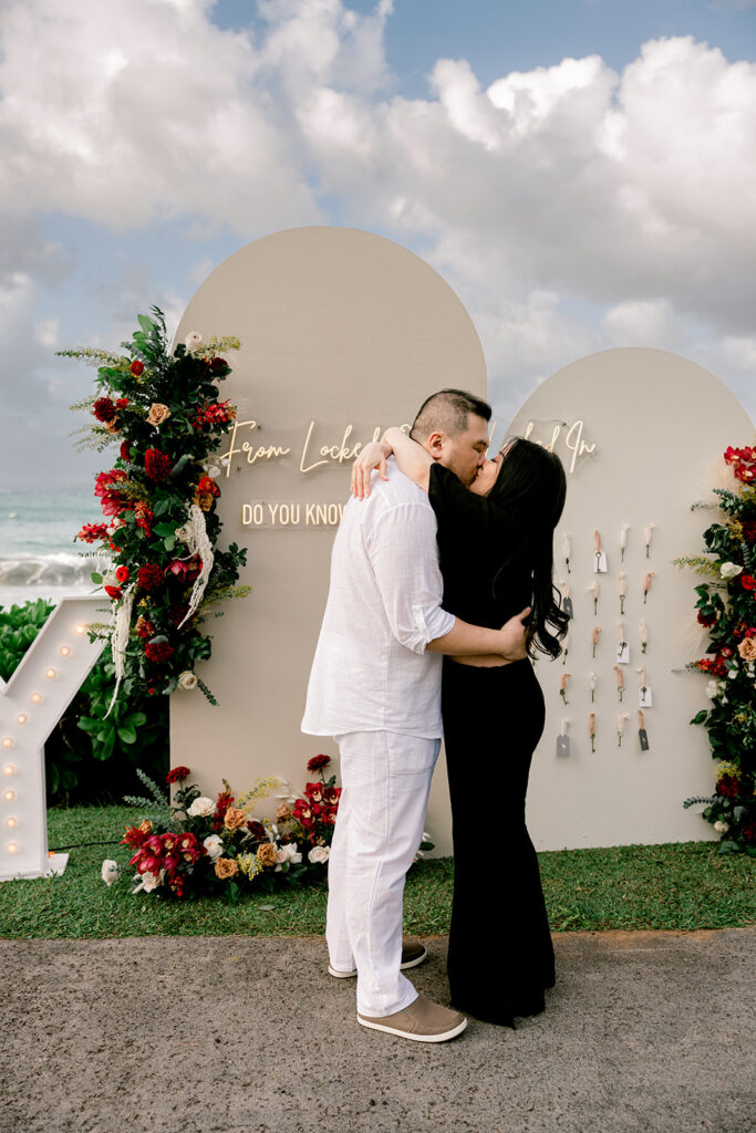 This custom Wailea proposal was designed as a heartfelt homage to their relationship, set against the sweeping ocean views and swaying palms of Hawaii’s coastline. Oversized marquee letters spelling “ONLY YOU” framed the shoreline, while lush florals in rich reds, soft blush, and warm neutrals added depth and romance to the tropical setting.