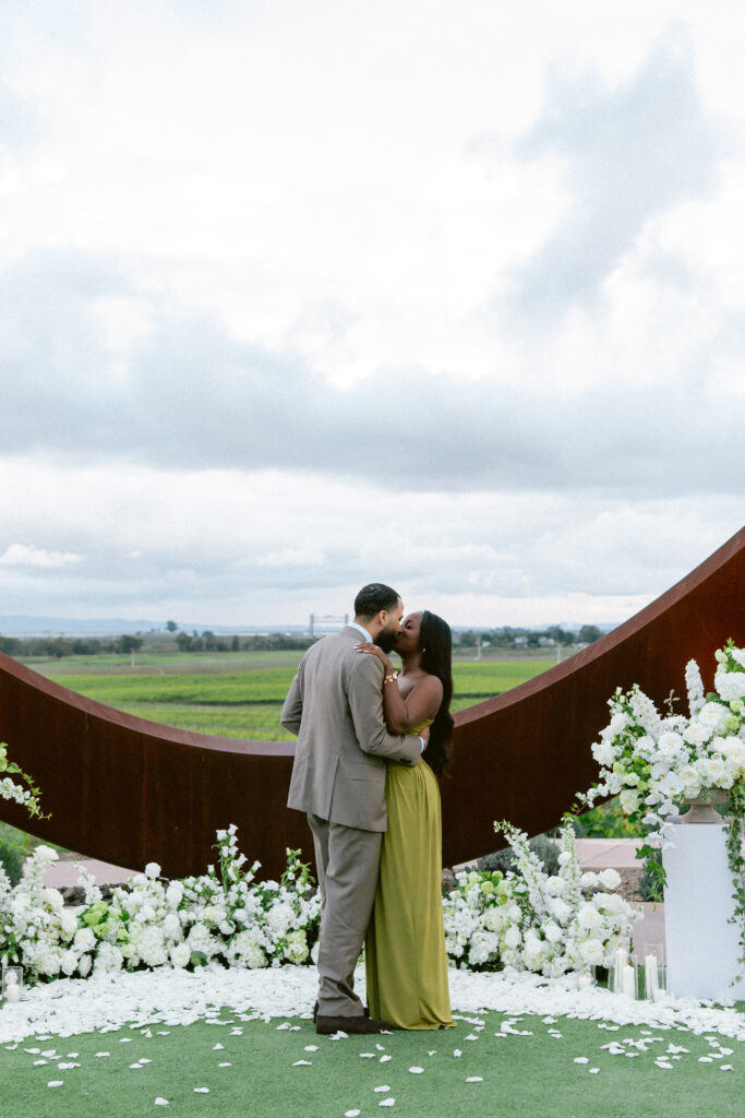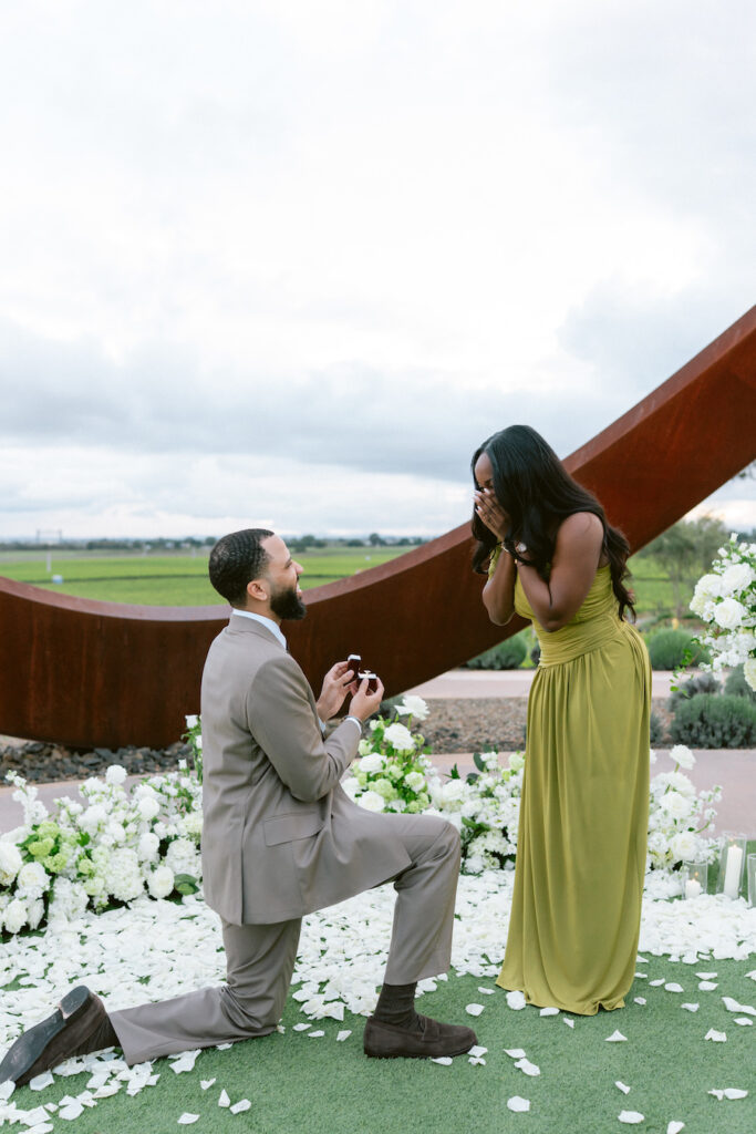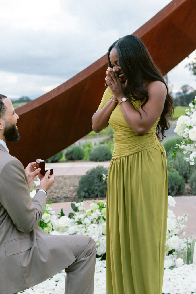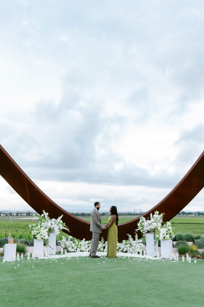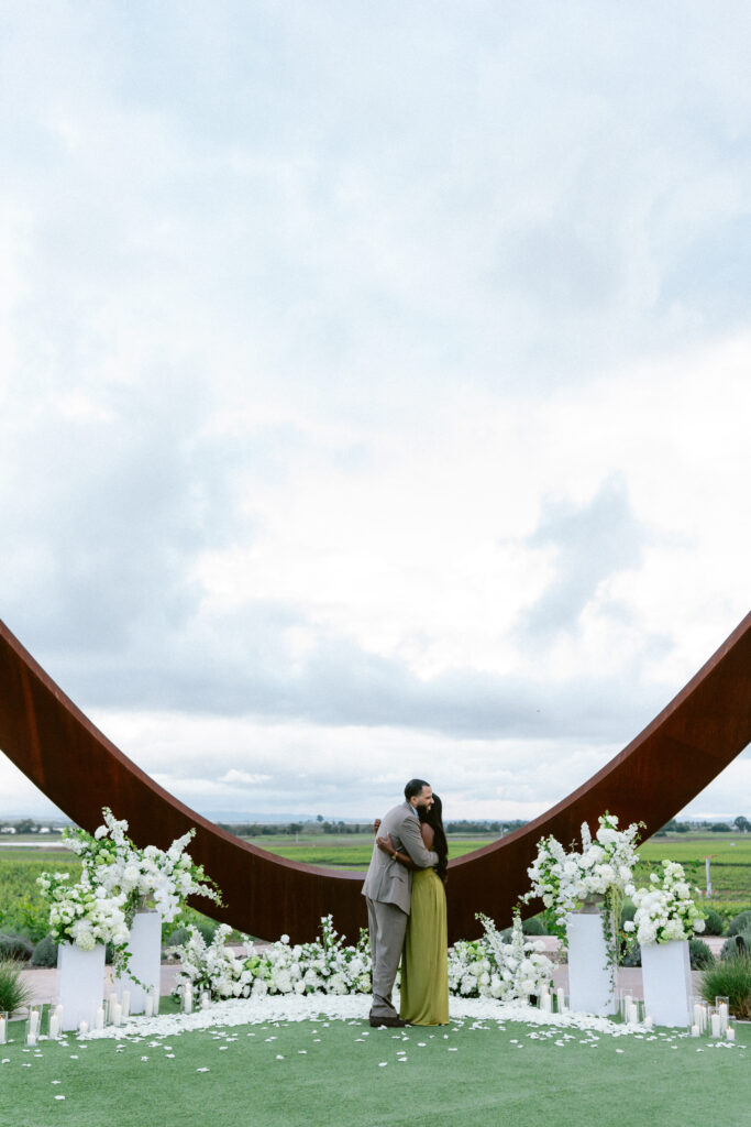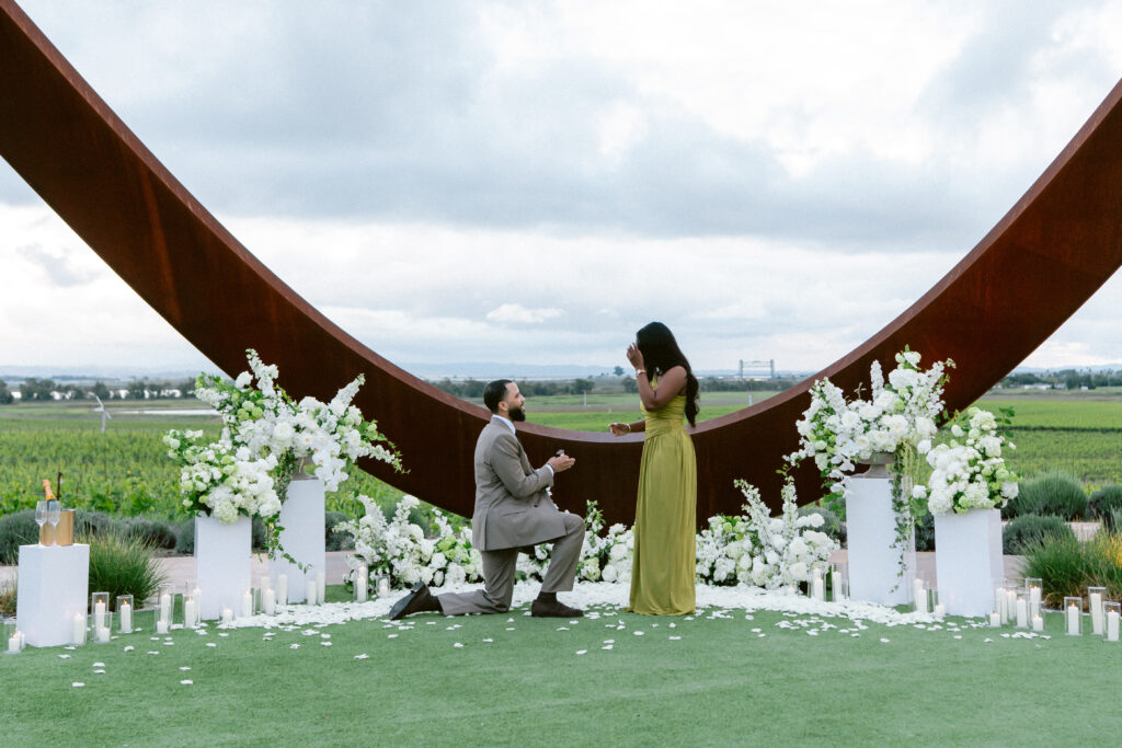 Set against the sweeping vineyard views of Napa Valley, this unique Napa proposal unfolded in the most artful and unexpected way. Centered beneath a striking sculptural installation, the scene was softened with lush white florals, delicate rose petals, and glowing candlelight that framed the moment with effortless romance. As the couple stood hand in hand, surrounded by rolling greenery and an endless sky, anticipation quietly built. Then, in a heartbeat, he dropped to one knee—completely surprising her and turning the serene setting into a moment filled with emotion, joy, and disbelief. The contrast of modern design and organic beauty created a setting that felt both elevated and deeply personal. With champagne waiting nearby and the vineyards stretching far beyond, this proposal captured the essence of understated luxury—where every detail felt intentional, and every second felt unforgettable.