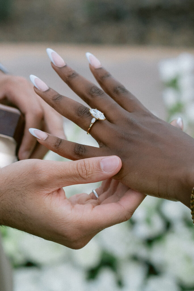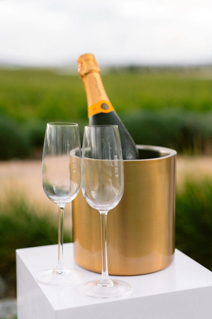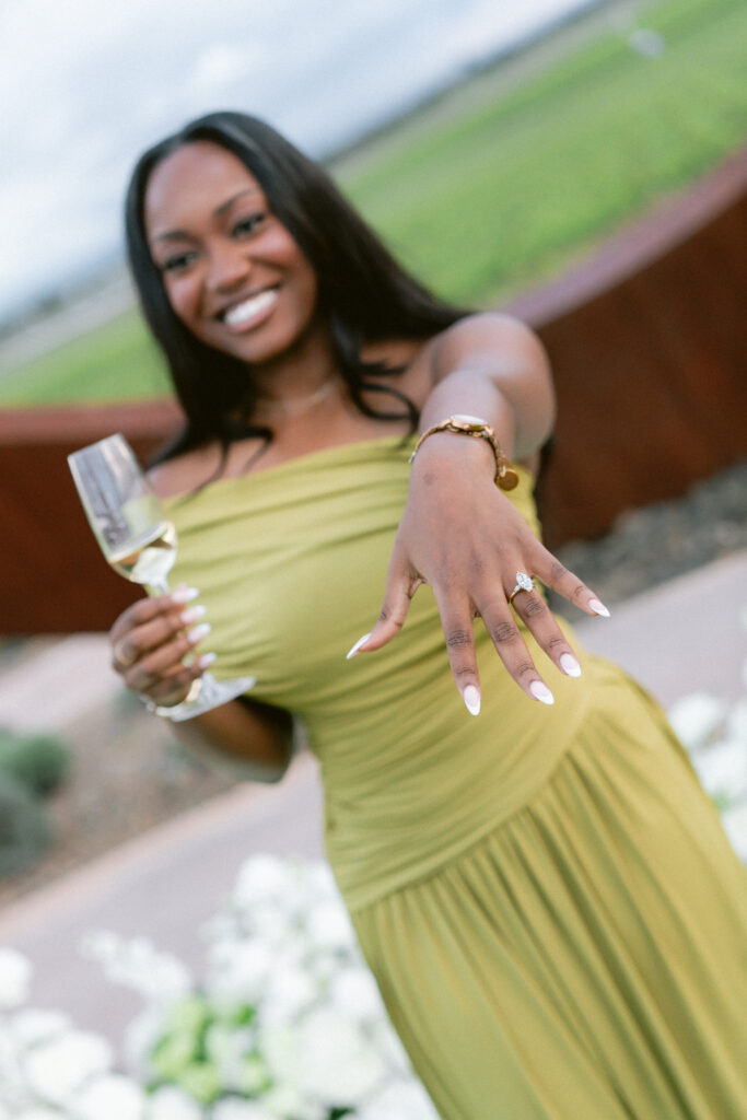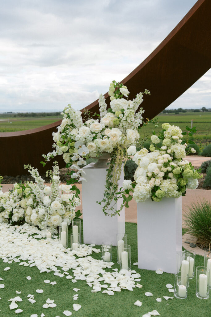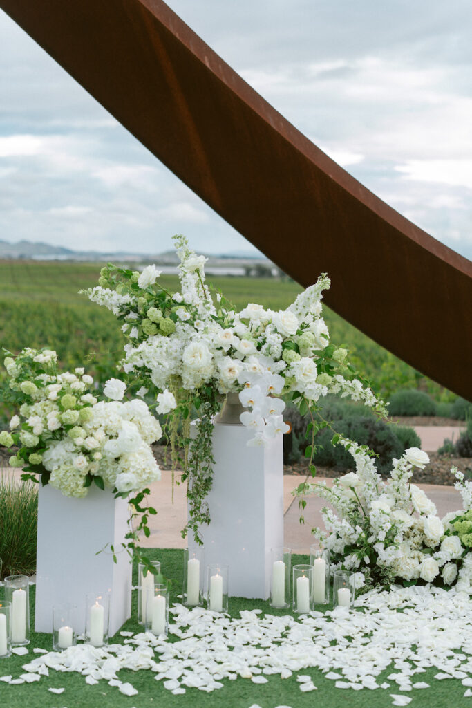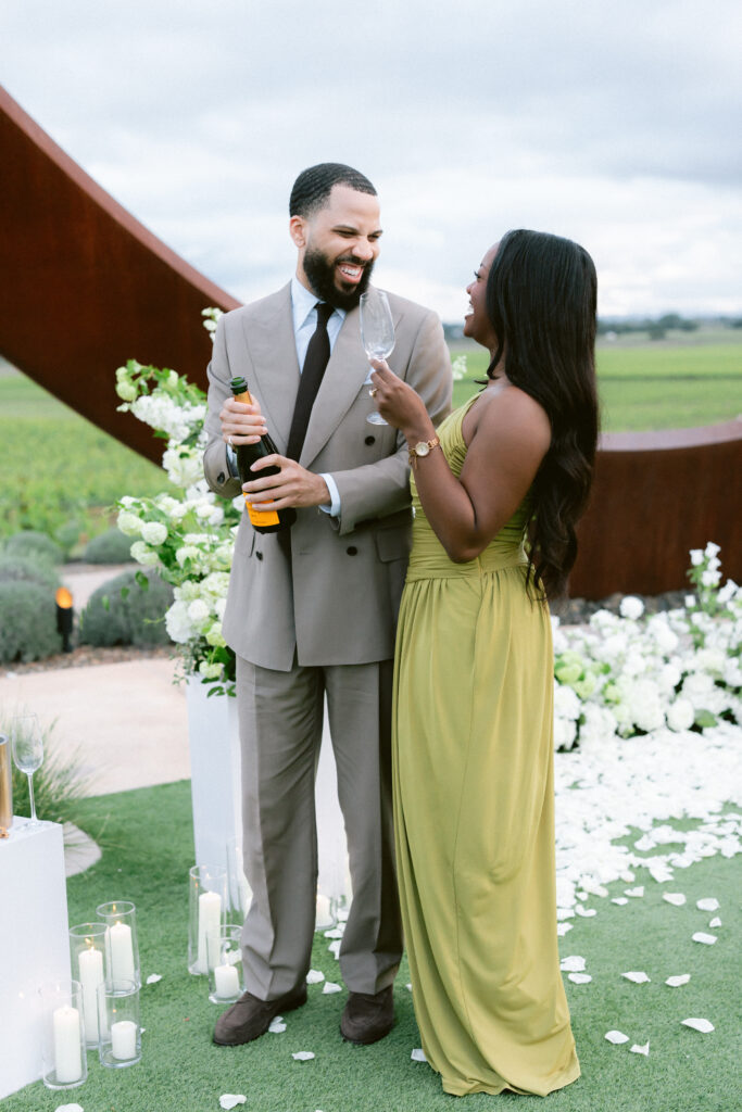 Set against the sweeping vineyard views of Napa Valley, this unique Napa proposal unfolded in the most artful and unexpected way. Centered beneath a striking sculptural installation, the scene was softened with lush white florals, delicate rose petals, and glowing candlelight that framed the moment with effortless romance. As the couple stood hand in hand, surrounded by rolling greenery and an endless sky, anticipation quietly built. Then, in a heartbeat, he dropped to one knee—completely surprising her and turning the serene setting into a moment filled with emotion, joy, and disbelief. The contrast of modern design and organic beauty created a setting that felt both elevated and deeply personal. With champagne waiting nearby and the vineyards stretching far beyond, this proposal captured the essence of understated luxury—where every detail felt intentional, and every second felt unforgettable.