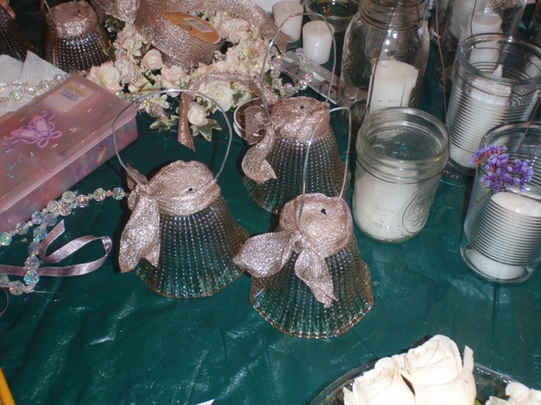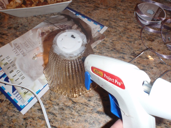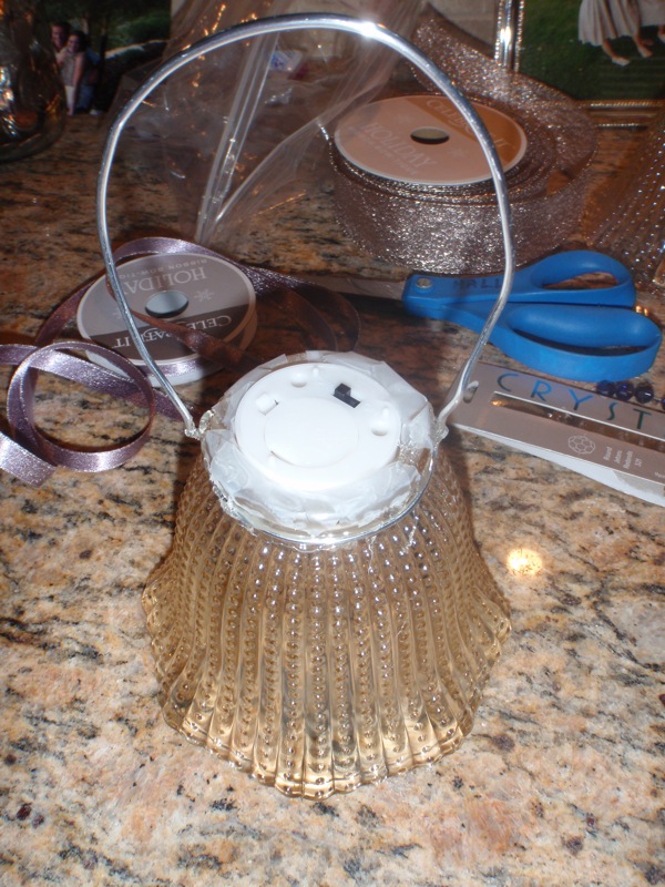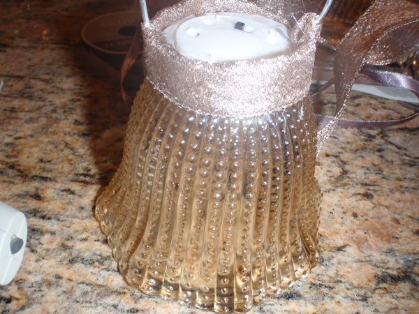 Step 1: Gather your supplies. (5) Glass Lampshades, (1) Sproul of Wire, (5) Battery Operated Tea Light Candles, (1) Hot Glue Gun, (1) Scotch Tape, (1) Wire Cutter, and your chose of decorative ribbon. Note: I found my lampshades at Lowes for $2.99 per shade.