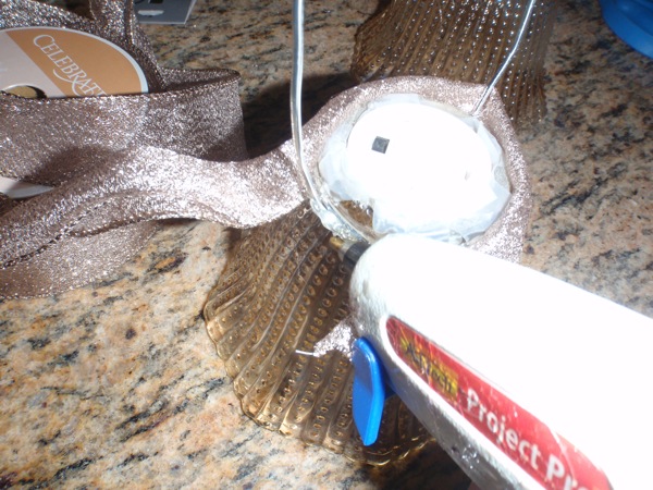 Step 4: Now it’s time to decorate the rim and cover up the wire with your choice of decorative ribbon. As you did with the wire, glue the ribbon around the rim and hold until dry.