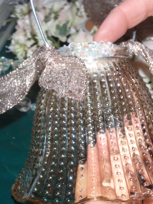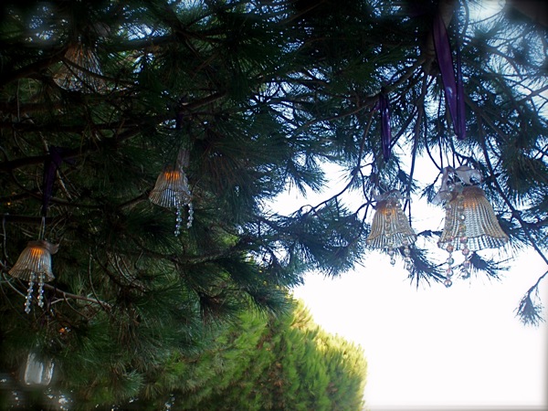 Step 6: When it came time to hang the chandelier/lantern pieces, we used clear fishing line and ribbon to hang from the trees. I also added some clear crystals to enhance that chandelier look.