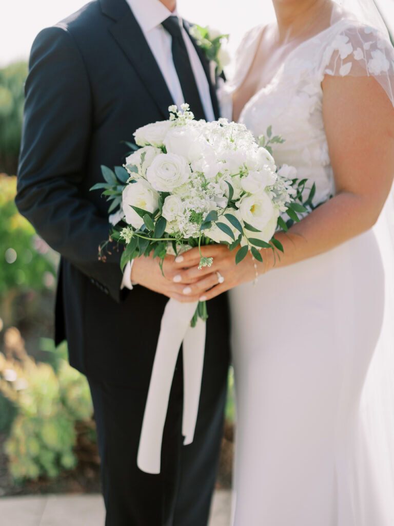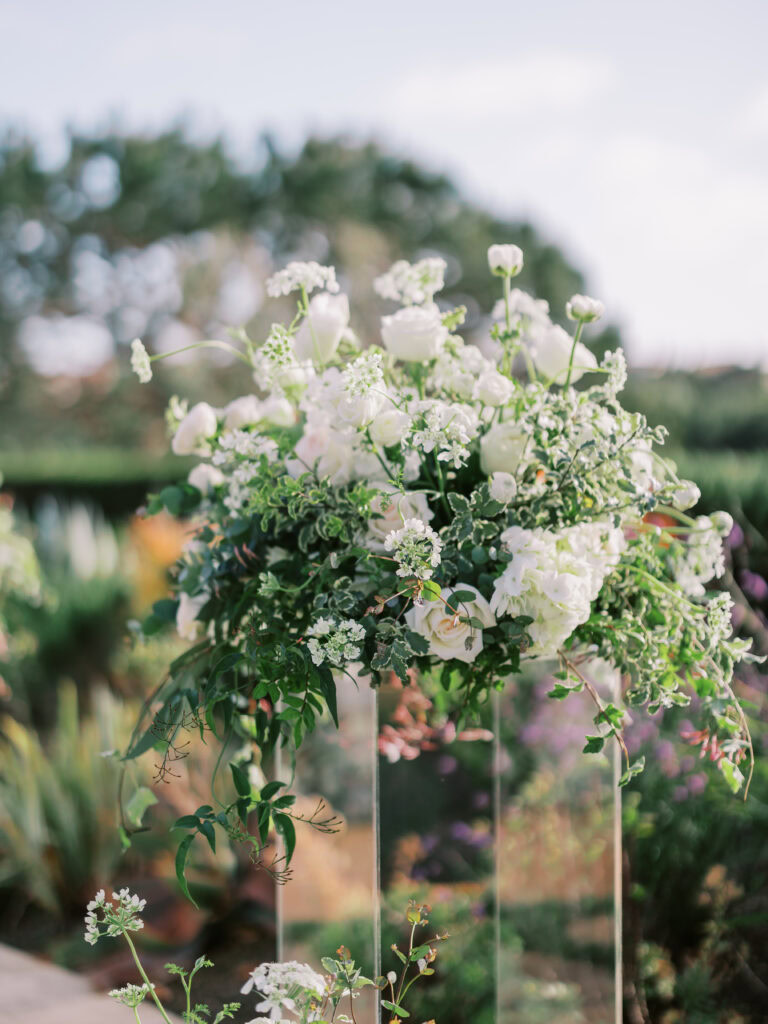 Set beneath a romantic garden gazebo with clear pedestal floral installations and lush white blooms, the couple exchanged vows with their officiant and closest loved ones by their side. Simple. Elegant. Meaningful.