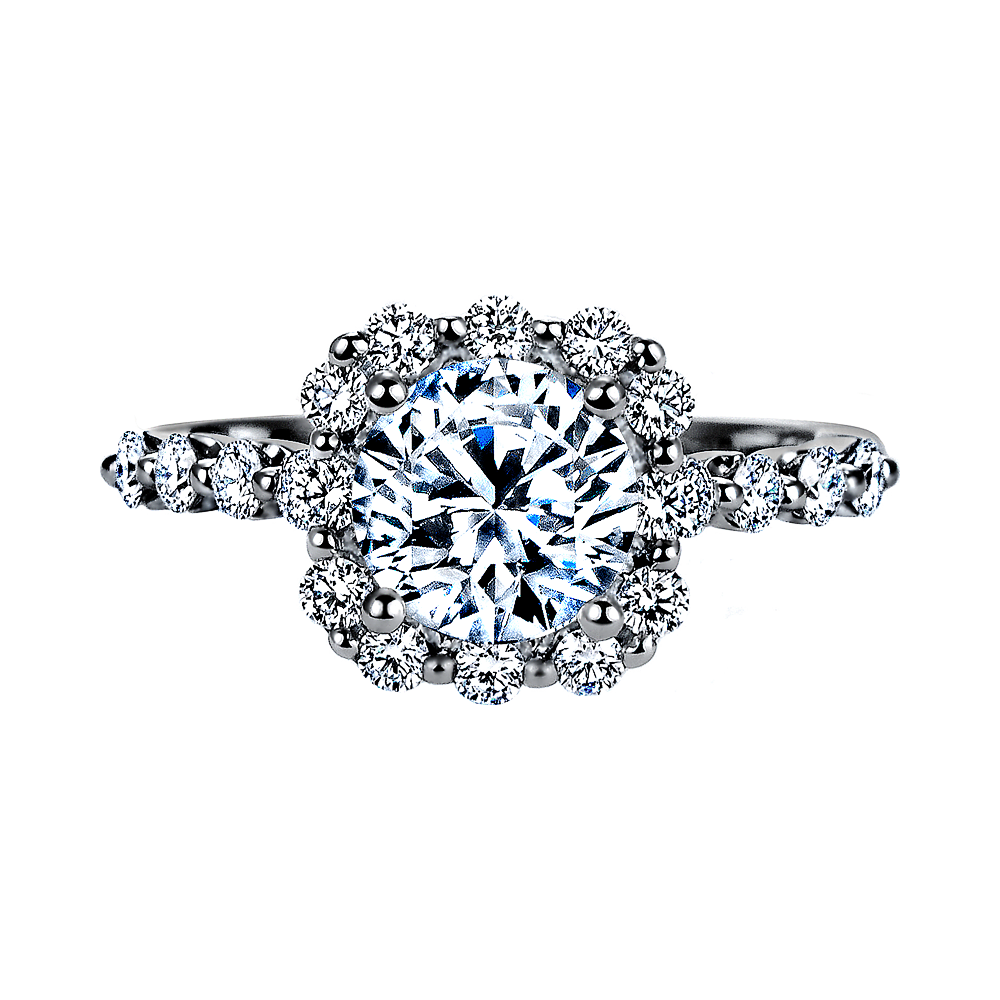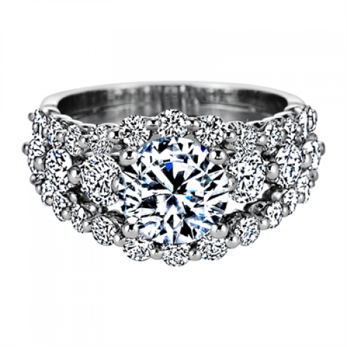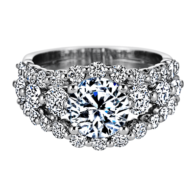 Center Stone: 2 ct Round Brilliant Cut Diamond. Center Setting: Decorative 4-Prong. Accent Type: Royal Prong-Set Round Diamonds. Accent Total Weight: 2 1/3 ct (graduating middle row = 1 ct). Metal: Platinum. This piece is exquisite… so strikingly beautiful!