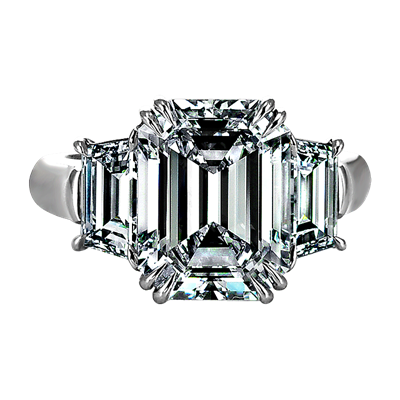 Center Stone: 5.03 ct Emerald-Cut Diamond. Side-Stones: 2.20 ct total weight Step-Cut Trapezoid Diamonds. Setting Style: Double-Claw (Center) and Claw Prongs. Metal: Platinum. The clean cut yet soft look is so attractive!