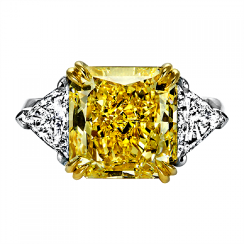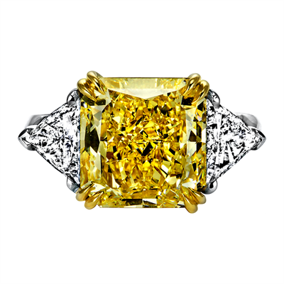 Center Stone: 10.38 ct Fancy Yellow Radiant-Cut Diamond. Side-Stones: 2.05 ct total weight Trillion-Cut Diamonds. Setting Style: Double-Claw (Center); Claw Prongs with V-Caps (Sides). Metal: Platinum, 18k yellow gold (center diamond). You know how much I love canary stones!