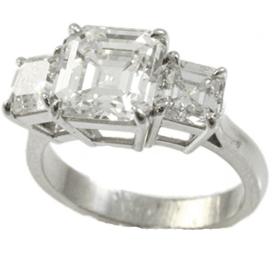 Asscher Diamond Three Stone Ring. Diamond three stone Asscher ring set in Platinum. Center diamond is a GIA Certified 3.10 carat F/VS1 Asscher cut diamond set with .76 carat asscher cuts on each side of the center.
