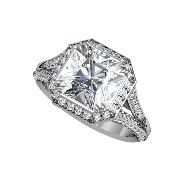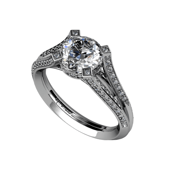 KNIFE EDGED SPLIT SHANK BEAD SET ENGAGEMENT RING WITH 92 ROUND BRILLIANT CUT DIAMONDS WEIGHING 0.38 CARATS. AVAILABLE IN PLATINUM, 18 KARAT WHITE, YELLOW OR ROSE GOLD.
