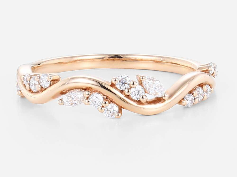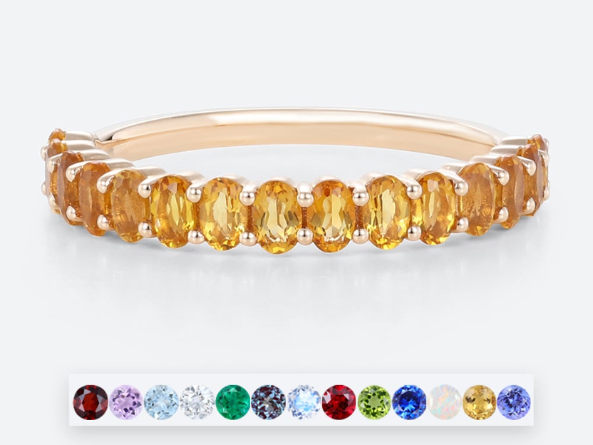 This slim rose-gold band is dotted with oval-cut birthstones along half its circumference. It’s a delicate yet vibrant choice that can be stacked with other rings or worn alone. Perfect for symbolizing “half a lifetime” spent together, its customization by birthstones adds a sentimental touch.