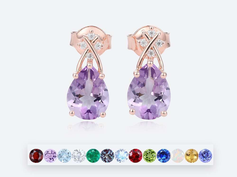 These charming rose-gold studs feature pear-shaped birthstones dangling from a crisscross motif. The playful design adds movement and color, making them stand out as a romantic accent. Choose her birthstone (or both partners’ stones) to create earrings that are as personal as they are elegant.