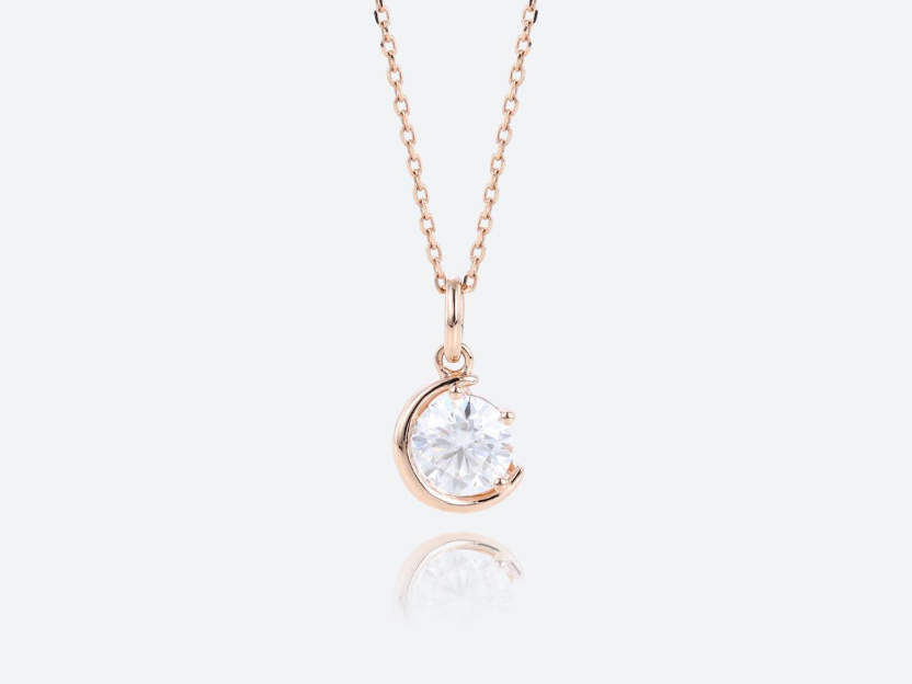 A classic solitaire diamond (lab-grown for modern conscience) suspended on a rose gold chain. This timeless pendant shines with exceptional fire and clarity, perfect for everyday elegance or special occasions. It speaks of purity and brilliance, capturing the light of your first or tenth anniversary with a single radiant gem.
